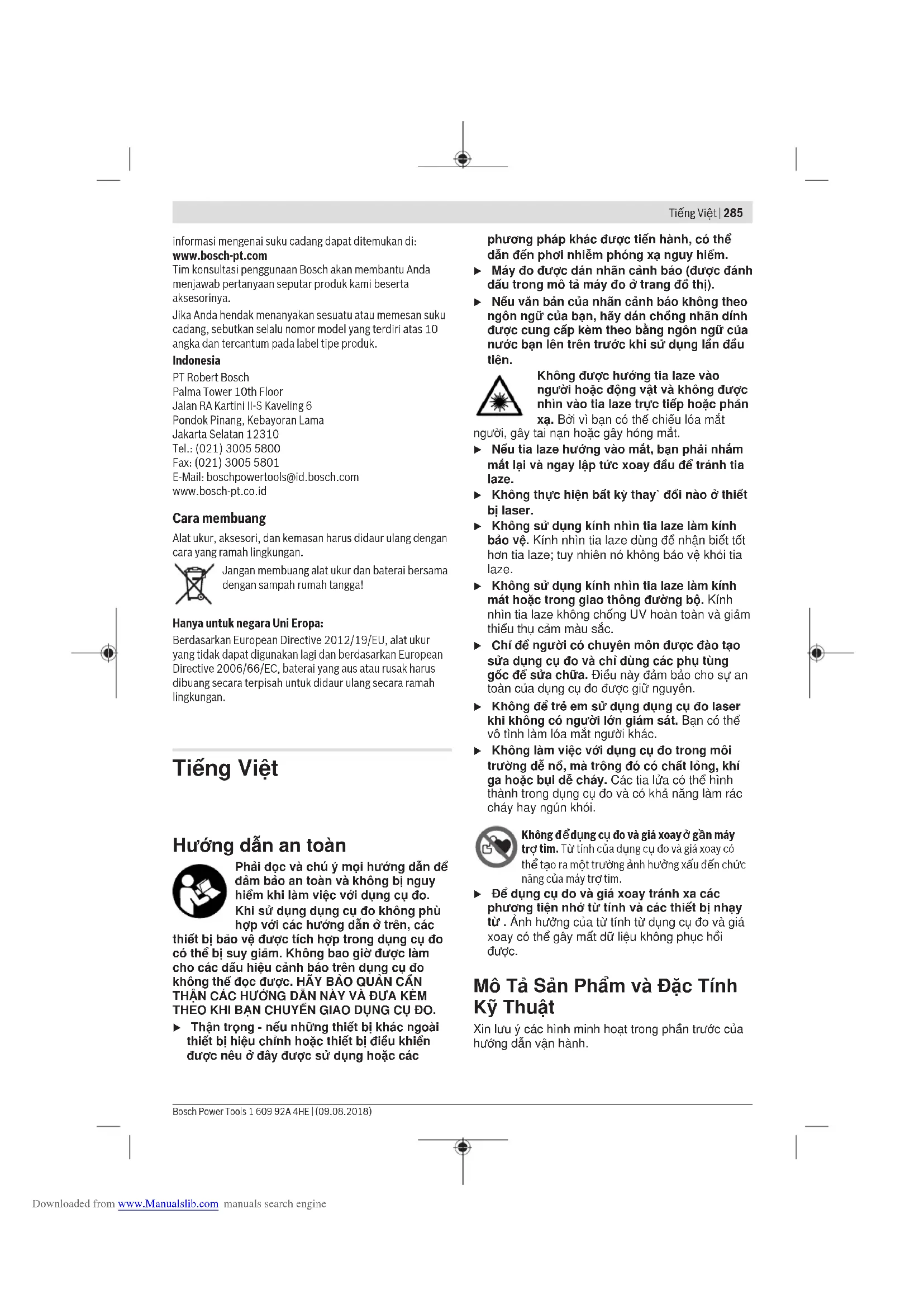 tim. Từ tính của dụng cụ đo và giá xoay có thể tạo ra một trường ảnh hưởng xấu đến chức năng của máy trợ tim. u Để dụng cụ đo và giá xoay tránh xa các phương tiện nhớ từ tính và các thiết bị nhạy từ . Ảnh hưởng của từ tính từ dụng cụ đo và giá xoay có thể gây mất dữ liệu không phục hồi được. Mô Tả Sản Phẩm và Đặc Tính Kỹ Thuật Xin lưu ý các hình minh hoạt trong phần trước của hướng dẫn vận hành. Tiếng Việt | 285 Bosch Power Tools 1 609 92A 4HE | (09.08.2018) Downloaded from www.Manualslib.com manuals search engine286 | Tiếng Việt 1 609 92A 4HE | (09.08.2018) Bosch Power Tools Sử dụng đúng cách Dụng cụ đo được thiết kế để xác định và kiểm tra các đường ngang và dọc cũng như các điểm vuông góc. Dụng cụ đo phù hợp để sử dụng trong vùng bên ngoài và bên trong. Các bộ phận được minh họa Sự đánh số các biểu trưng của sản phẩm là để tham khảo hình minh họa dụng cụ đo trên trang hình ảnh. (1) Cửa chiếu luồng laser (2) Hiển thị pin (3) Đèn báo vận hành không có chức năng lấy cốt thủy chuẩn tự động (4) Phím chế độ vận hành điểm laser (5) Phím chế độ vận hành tia laser (6) Nắp đậy pin (7) Hướng dẫn (8) Nút bật/tắt (9) Điểm nhận giá đỡ ba chân 1/4" (10) Điểm nhận giá đỡ ba chân 5/8" (11) Mã seri sản xuất (12) Nhãn cảnh báo laser (13) Giá xoay (RM1) (14) Thanh hướng dẫn (15) Lỗ định vị theo chiều dọc (16) Nam châm (17) Giá treo trên trần