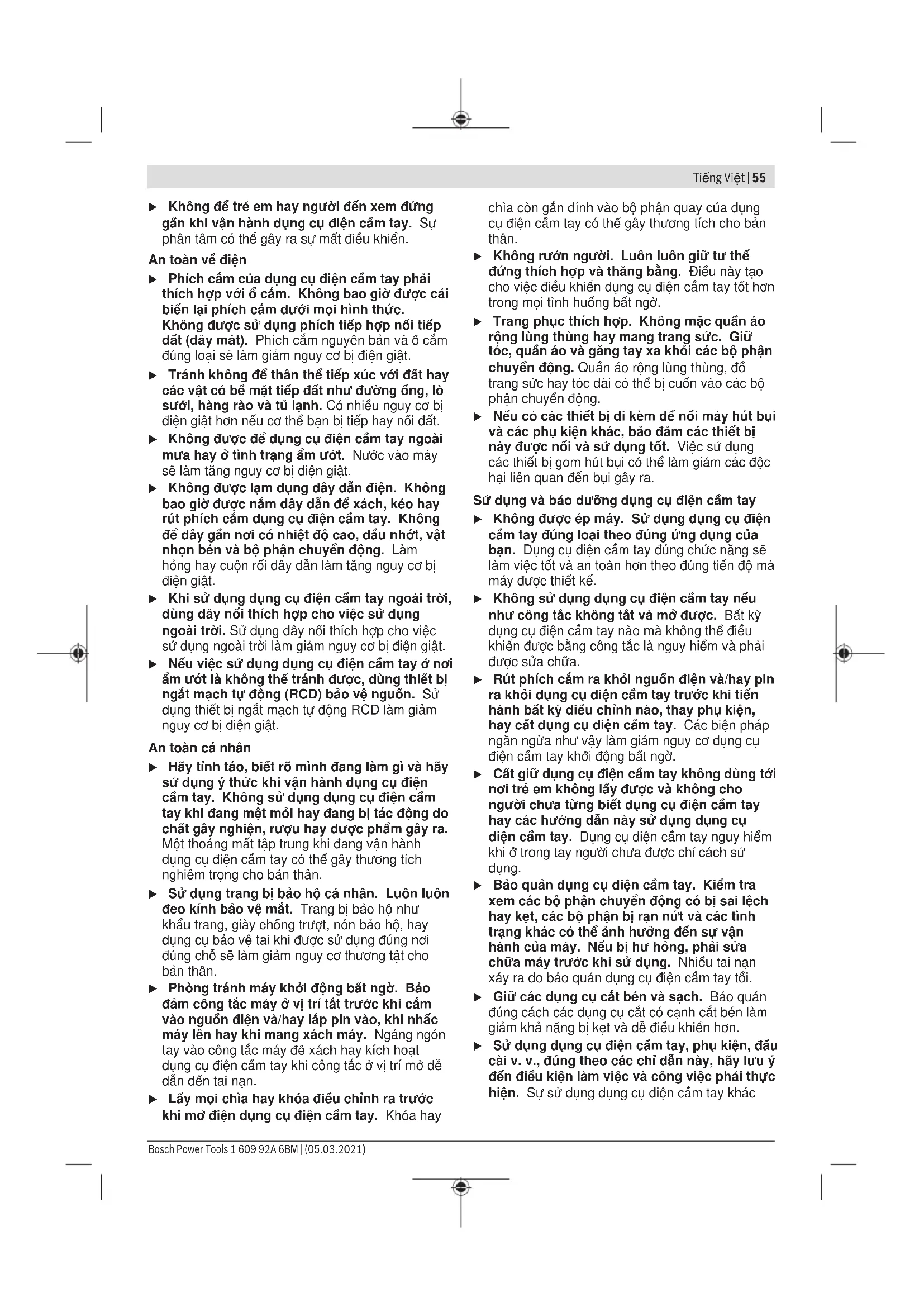 Đọc kỹ mọi cảnh báo an toàn và hướng dẫn. Không tuân thủ mọi cảnh báo và hướng dẫn được liệt kê dưới đây có thể bị điện giựt, gây cháy và / hay bị thương tật nghiêm trọng. Hãy giữ tất cả tài liệu về cảnh báo và hướng dẫn để tham khảo về sau. Thuật ngữ "dụng cụ điện cầm tay" trong phần cảnh báo là đề cập đến sự sử dụng dụng cụ điện cầm tay của bạn, loại sử dụng điện nguồn (có dây cắm điện) hay vận hành bằng pin (không dây cắm điện). Khu vực làm việc an toàn u Giữ nơi làm việc sạch và đủ ánh sáng. Nơi làm việc bừa bộn và tối tăm dễ gây ra tai nạn. u Không vận hành dụng cụ điện cầm tay trong môi trường dễ gây nổ, chẳng hạn như nơi có chất lỏng dễ cháy, khí đốt hay rác. Dụng cụ điện cầm tay tạo ra các tia lửa nên có thể làm rác bén cháy hay bốc khói. 1 609 92A 6BM | (05.03.2021) Bosch Power ToolsTiếng Việt | 55 u Không để trẻ em hay người đến xem đứng gần khi vận hành dụng cụ điện cầm tay. Sự phân tâm có thể gây ra sự mất điều khiển. An toàn về điện u Phích cắm của dụng cụ điện cầm tay phải thích hợp với ổ cắm. Không bao giờ được cải biến lại phích cắm dưới mọi hình thức. Không được sử dụng phích tiếp hợp nối tiếp đất (dây mát). Phích cắm nguyên bản và ổ cắm đúng loại sẽ làm giảm nguy cơ bị điện giật. u Tránh không để thân thể tiếp xúc với đất hay các vật có bề mặt tiếp đất như đường ống, lò sưởi, hàng rào và tủ lạnh. Có nhiều nguy cơ bị điện giật hơn nếu cơ thể bạn bị tiếp hay nối đất. u Không được để dụng cụ điện cầm tay ngoài mưa hay ở tình trạng ẩm ướt. Nước vào máy sẽ làm tăng nguy cơ bị điện giật. u Không được lạm dụng dây dẫn điện. Không bao giờ được nắm dây dẫn để xách, kéo hay rút phích cắm dụng cụ điện cầm tay. Không để dây gần nơi có nhiệt độ cao, dầu nhớt, vật nhọn bén và bộ phận chuyển động. Làm hỏng hay cuộn rối dây dẫn làm tăng nguy cơ bị điện giật. u Khi sử dụng dụng cụ điện cầm tay ngoài trời, dùng dây nối thích hợp cho việc sử dụng ngoài trời. Sử dụng dây nối thích hợp cho việc sử dụng ngoài trời làm giảm nguy cơ bị điện giật. u Nếu việc sử dụng dụng cụ điện cầm tay ở nơi ẩm ướt là không thể tránh được, dùng thiết bị ngắt mạch tự động (RCD) bảo vệ nguồn. Sử dụng thiết bị ngắt mạch tự động RCD làm giảm nguy cơ bị điện giật. An toàn cá nhân u Hãy tỉnh táo, biết rõ mình đang làm gì và hãy sử dụng ý thức khi vận hành dụng cụ điện cầm tay. Không sử dụng dụng cụ điện cầm tay khi đang mệt mỏi hay đang bị tác động do chất gây nghiện, rượu hay dược phẩm gây ra. Một thoáng mất tập trung khi đang vận hành dụng cụ điện cầm tay có thể gây thương tích nghiêm trọng cho bản thân. u Sử dụng trang bị bảo hộ cá nhân. Luôn luôn đeo kính bảo vệ mắt. Trang bị bảo hộ như khẩu trang, giày chống trượt, nón bảo hộ, hay dụng cụ bảo vệ tai khi được sử dụng đúng nơi đúng chỗ sẽ làm giảm nguy cơ thương tật cho bản thân. u Phòng tránh máy khởi động bất ngờ. Bảo đảm công tắc máy ở vị trí tắt trước khi cắm vào nguồn điện và/hay lắp pin vào, khi nhấc máy lên hay khi mang xách máy. Ngáng ngón tay vào công tắc máy để xách hay kích hoạt dụng cụ điện cầm tay khi công tắc ở vị trí mở dễ dẫn đến tai nạn. u Lấy mọi chìa hay khóa điều chỉnh ra trước khi mở điện dụng cụ điện cầm tay. Khóa hay chìa còn gắn dính vào bộ phận quay của dụng cụ điện cầm tay có thể gây thương tích cho bản thân. u Không rướn người. Luôn luôn giữ tư thế đứng thích hợp và thăng bằng. Điều này tạo cho việc điều khiển dụng cụ điện cầm tay tốt hơn trong mọi tình huống bất ngờ. u Trang phục thích hợp. Không mặc quần áo rộng lùng thùng hay mang trang sức. Giữ tóc, quần áo và găng tay xa khỏi các bộ phận chuyển động. Quần áo rộng lùng thùng, đồ trang sức hay tóc dài có thể bị cuốn vào các bộ phận chuyển động. u Nếu có các thiết bị đi kèm để nối máy hút bụi và các phụ kiện khác, bảo đảm các thiết bị này được nối và sử dụng tốt. Việc sử dụng các thiết bị gom hút bụi có thể làm giảm các độc hại liên quan đến bụi gây ra. Sử dụng và bảo dưỡng dụng cụ điện cầm tay u Không được ép máy. Sử dụng dụng cụ điện cầm tay đúng loại theo đúng ứng dụng của bạn. Dụng cụ điện cầm tay đúng chức năng sẽ làm việc tốt và an toàn hơn theo đúng tiến độ mà máy được thiết kế. u Không sử dụng dụng cụ điện cầm tay nếu như công tắc không tắt và mở được. Bất kỳ dụng cụ điện cầm tay nào mà không thể điều khiển được bằng công tắc là nguy hiểm và phải được sửa chữa. u Rút phích cắm ra khỏi nguồn điện và/hay pin ra khỏi dụng cụ điện cầm tay trước khi tiến hành bất kỳ điều chỉnh nào, thay phụ kiện, hay cất dụng cụ điện cầm tay. Các biện pháp ngăn