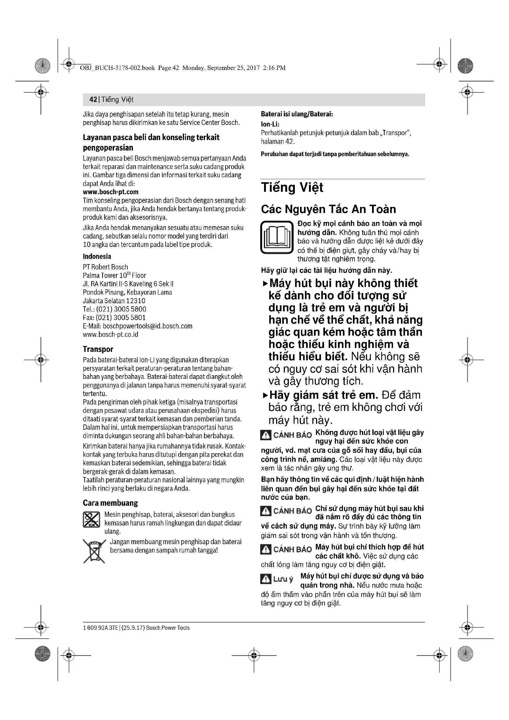 Floor Jl. RA Kartini II-S Kaveling 6 Sek II Pondok Pinang, Kebayoran Lama Jakarta Selatan 12310 Tel.: (021) 3005 5800 Fax: (021) 3005 5801 E-Mail: boschpowertools@id.bosch.com www.bosch-pt.co.id Transpor Pada baterai-baterai ion-Li yang digunakan diterapkan persyaratan terkait peraturan-peraturan tentang bahan- bahan yang berbahaya. Baterai-baterai dapat diangkut oleh penggunanya di jalanan tanpa harus memenuhi syarat-syarat tertentu. Pada pengiriman oleh pihak ketiga (misalnya transportasi dengan pesawat udara atau perusahaan ekspedisi) harus ditaati syarat-syarat terkait kemasan dan pemberian tanda. Dalam hal ini, untuk mempersiapkan transportasi harus diminta dukungan seorang ahli bahan-bahan berbahaya. Kirimkan baterai hanya jika rumahannya tidak rusak. Kontak- kontak yang terbuka harus ditutupi dengan pita perekat dan kemaskan baterai sedemikian, sehingga baterai tidak bergerak-gerak di dalam kemasan. Taatilah peraturan-peraturan nasional lainnya yang mungkin lebih rinci yang berlaku di negara Anda. Cara membuang Mesin penghisap, baterai, aksesori dan bungkus kemasan harus ramah lingkungan dan dapat didaur ulang. Jangan membuang mesin penghisap dan baterai bersama dengan sampah rumah tangga! Baterai isi ulang/Baterai: Ion-Li: Perhatikanlah petunjuk-petunjuk dalam bab „Transpor“, halaman 42. Perubahan dapat terjadi tanpa pemberitahuan sebelumnya. Tiếng Việt Các Nguyên Tắc An Toàn Đọc kỹ mọi cảnh báo an toàn và mọi hướng dẫn. Không tuân thủ mọi cảnh báo và hướng dẫn được liệt kê dưới đây có thể bị điện giựt, gây cháy và/hay bị thương tật nghiêm trọng. Hãy giữ lại các tài liệu hướng dẫn này. Máy hút bụi này không thiết kế dành cho đối tượng sử dụng là trẻ em và người bị hạn chế về thể chất, khả năng giác quan kém hoặc tâm thần hoặc thiếu kinh nghiệm và thiếu hiểu biết. Nếu không sẽ có nguy cơ sai sót khi vận hành và gây thương tích. Hãy giám sát trẻ em. Để đảm bảo rằng, trẻ em không chơi với máy hút này. Không được hút loại vật liệu gây nguy hại đến sức khỏe con người, vd. mạt cưa của gỗ sồi hay đấu, bụi của công trình nề, amiăng. Các loại vật liệu này được xem là tác nhân gây ung thư. Bạn hãy thông tin về các qui định / luật hiện hành liên quan đến bụi gây hại đến sức khỏe tại đất nước của bạn. Chỉ sử dụng máy hút bụi sau khi đã nắ m rõ đầy đủ các thông tin về cách sử dụng máy. Sự trình bày kỹ lưỡng làm giảm sai sót trong vận hành và tổn thương. Máy hút bụi chỉ thích hợp để hút các chất khô. Việc sử dụng các chất lỏng làm tăng nguy cơ bị điện giật. Máy hút bụi chỉ được sử dụng và bảo quản trong nhà. Nếu nước mưa hoặc độ ẩm thấm vào phần trên của máy hút bụi s ẽ làm tăng nguy cơ bị điện giật. OBJ_BUCH-3178-002.book Page 42 Monday, September 25, 2017 2:16 PMTiếng Việt | 43 Bosch Power Tools 1 609 92A 3TE | (25.9.17) Không hút bụi nóng hoặc dễ cháy và không hút bụi vào khu vực có nguy cơ gây cháy nổ. Bụi có thể tự bắt cháy hoặc phát nổ. Hãy tháo pin, trước khi bạn bão dưỡng hoặc làm sạch, điều chỉnh thiết bị, thay phụ kiện, hoặc bảo quản máy hút bụi. Biện pháp thận trọng sẽ tránh việc khởi động máy hút bụi không chủ ý. Tạo cho nơi làm việc được thông thoáng tốt.