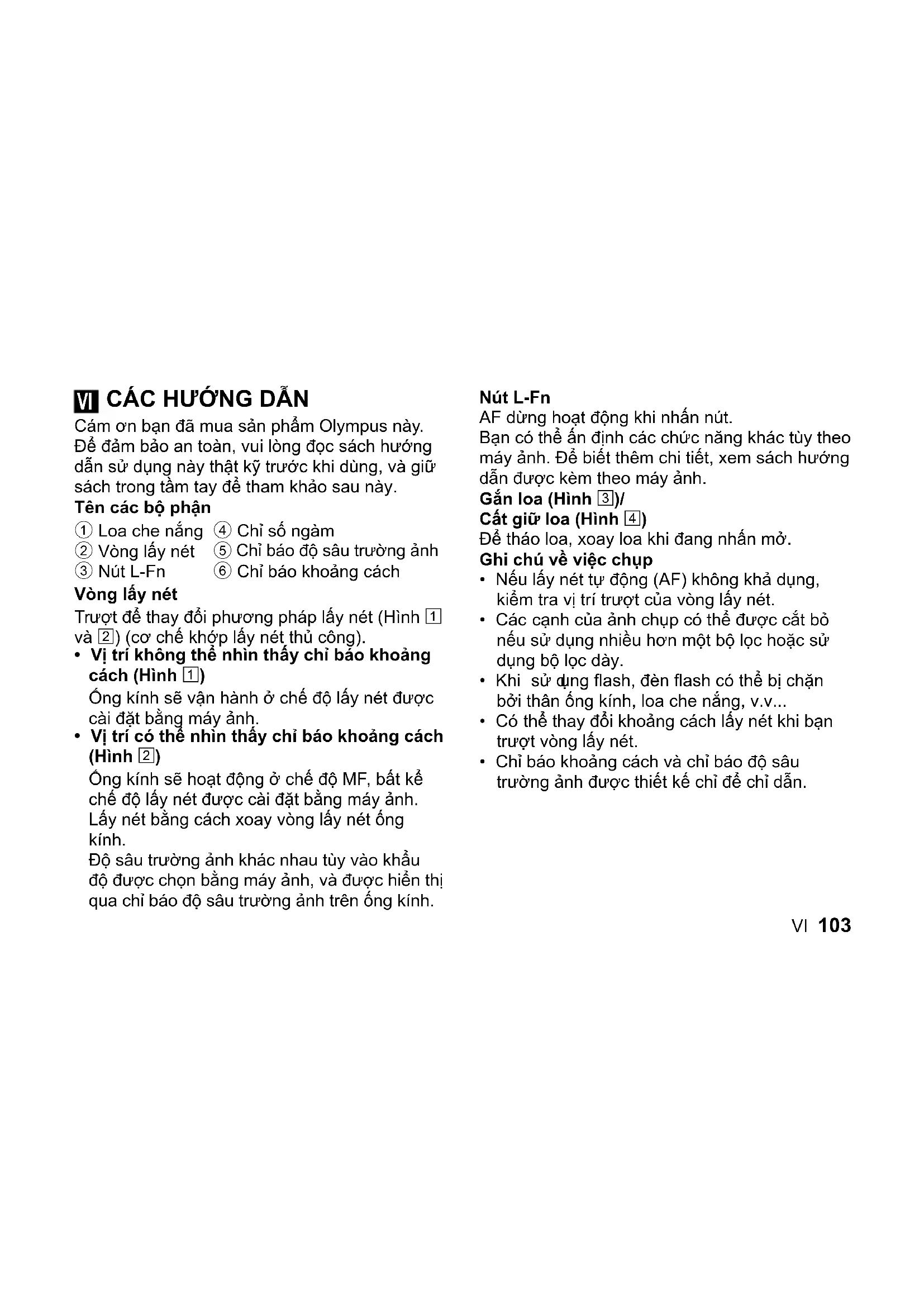 Cám ơn bạn đã mua sản phẩm Olympus này. Để đảm bảo an toàn, vui lòng đọc sách hướng dẫn sử dụng này thật kỹ trước khi dùng, và giữ sách trong tầm tay để tham khảo sau này. Tên các bộ phận 1 Loa che nắng 2 Vòng lấy nét 3 Nút L-Fn 4 Chỉ số ngàm