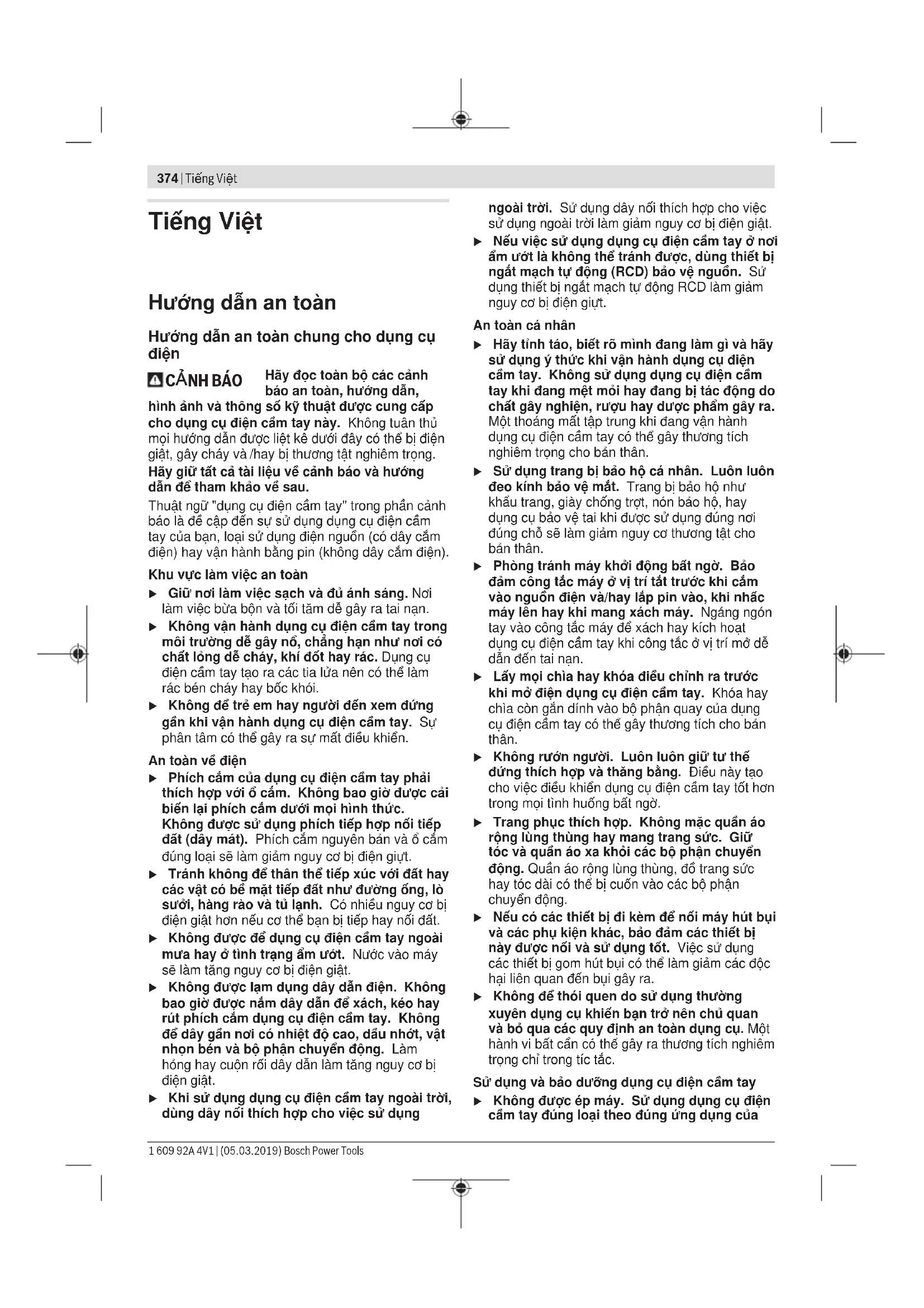 Hãy đọc toàn bộ các cảnh báo an toàn, hướng dẫn, hình ảnh và thông số kỹ thuật được cung cấp cho dụng cụ điện cầm tay này. Không tuân thủ mọi hướng dẫn được liệt kê dưới đây có thể bị điện giật, gây cháy và /hay bị thương tật nghiêm trọng. Hãy giữ tất cả tài liệu về cảnh báo và hướng dẫn để tham khảo về sau. Thuật ngữ "dụng cụ điện cầm tay" trong phần cảnh báo là đề cập đến sự sử dụng dụng cụ điện cầm tay của bạn, loại sử dụng điện nguồn (có dây cắm điện) hay vận hành bằng pin (không dây cắm điện). Khu vực làm việc an toàn u Giữ nơi làm việc sạch và đủ ánh sáng. Nơi làm việc bừa bộn và tối tăm dễ gây ra tai nạn. u Không vận hành dụng cụ điện cầm tay trong môi trường dễ gây nổ, chẳng hạn như nơi có chất lỏng dễ cháy, khí đốt hay rác. Dụng cụ điện cầm tay tạo ra các tia lửa nên có thể làm rác bén cháy hay bốc khói. u Không để trẻ em hay người đến xem đứng gần khi vận hành dụng cụ điện cầm tay. Sự phân tâm có thể gây ra sự mất điều khiển. An toàn về điện u Phích cắm của dụng cụ điện cầm tay phải thích hợp với ổ cắm. Không bao giờ được cải biến lại phích cắm dưới mọi hình thức. Không được sử dụng phích tiếp hợp nối tiếp đất (dây mát). Phích cắm nguyên bản và ổ cắm đúng loại sẽ làm giảm nguy cơ bị điện giựt. u Tránh không để thân thể tiếp xúc với đất hay các vật có bề mặt tiếp đất như đường ống, lò sưởi, hàng rào và tủ lạnh. Có nhiều nguy cơ bị điện giật hơn nếu cơ thể bạn bị tiếp hay nối đất. u Không được để dụng cụ điện cầm tay ngoài mưa hay ở tình trạng ẩm ướt. Nước vào máy sẽ làm tăng nguy cơ bị điện giật. u Không được lạm dụng dây dẫn điện. Không bao giờ được nắm dây dẫn để xách, kéo hay rút phích cắm dụng cụ điện cầm tay. Không để dây gần nơi có nhiệt độ cao, dầu nhớt, vật nhọn bén và bộ phận chuyển động. Làm hỏng hay cuộn rối dây dẫn làm tăng nguy cơ bị điện giật. u Khi sử dụng dụng cụ điện cầm tay ngoài trời, dùng dây nối thích hợp cho việc sử dụng ngoài trời. Sử dụng dây nối thích hợp cho việc sử dụng ngoài trời làm giảm nguy cơ bị điện giật. u Nếu việc sử dụng dụng cụ điện cầm tay ở nơi ẩm ướt là không thể tránh được, dùng thiết bị ngắt mạch tự động (RCD) bảo vệ nguồn. Sử dụng thiết bị ngắt mạch tự động RCD làm giảm nguy cơ bị điện giựt. An toàn cá nhân u Hãy tỉnh táo, biết rõ mình đang làm gì và hãy sử dụng ý thức khi vận hành dụng cụ điện cầm tay. Không sử dụng dụng cụ điện cầm tay khi đang mệt mỏi hay đang bị tác động do chất gây nghiện, rượu hay dược phẩm gây ra. Một thoáng mất tập trung khi đang vận hành dụng cụ điện cầm tay có thể gây thương tích nghiêm trọng cho bản thân. u Sử dụng trang bị bảo hộ cá nhân. Luôn luôn đeo kính bảo vệ mắt. Trang bị bảo hộ như khẩu trang, giày chống trợt, nón bảo hộ, hay dụng cụ bảo vệ tai khi được sử dụng đúng nơi đúng chỗ sẽ làm giảm nguy cơ thương tật cho bản thân. u Phòng tránh máy khởi động bất ngờ. Bảo đảm công tắc máy ở vị trí tắt trước khi cắm vào nguồn điện và/hay lắp pin vào, khi nhấc máy lên hay khi mang xách máy. Ngáng ngón tay vào công tắc máy để xách hay kích hoạt dụng cụ điện cầm tay khi công tắc ở vị trí mở dễ dẫn đến tai nạn. u Lấy mọi chìa hay khóa điều chỉnh ra trước khi mở điện dụng cụ điện cầm tay. Khóa hay chìa còn gắn dính vào bộ phận quay của dụng cụ điện cầm tay có thể gây thương tích cho bản thân. u Không rướn người. Luôn luôn giữ tư thế đứng thích hợp và thăng bằng. Điều này tạo cho việc điều khiển dụng cụ điện cầm tay tốt hơn trong mọi tình huống bất ngờ. u Trang phục thích hợp. Không mặc quần áo rộng lùng thùng hay mang trang sức. Giữ tóc và quần áo xa khỏi các bộ phận chuyển động. Quần áo rộng lùng thùng, đồ trang sức hay tóc dài có thể bị cuốn vào các bộ phận chuyển động. u Nếu có các thiết bị đi kèm để nối máy hút bụi và các phụ kiện khác, bảo đảm các thiết bị này được nối và sử dụng tốt. Việc sử dụng các thiết bị gom hút bụi có thể làm giảm các độc hại liên quan đến bụi gây ra. u Không để thói quen do sử dụng thường xuyên dụng cụ khiến bạn trở nên chủ quan và bỏ qua các quy định an toàn dụng cụ. Một hành vi bất cẩn có thể gây ra thương tích nghiêm trọng chỉ trong tíc tắc. Sử dụng và bảo dưỡng dụng cụ điện cầm tay u Không được ép máy. Sử dụng dụng cụ điện cầm tay đúng loại theo đúng ứng dụng của 1 609 92A 4V1 | (05.03.2019) Bosch Power ToolsTiếng Việt | 375 bạn. Dụng cụ điện cầm tay đúng chức năng sẽ làm việc tốt và an toàn hơn theo đúng tiến độ mà máy được thiết kế. u Không sử dụng dụng cụ điện cầm tay nếu như công tắc không tắt và mở được. Bất kỳ dụng cụ điện cầm tay nào mà không th