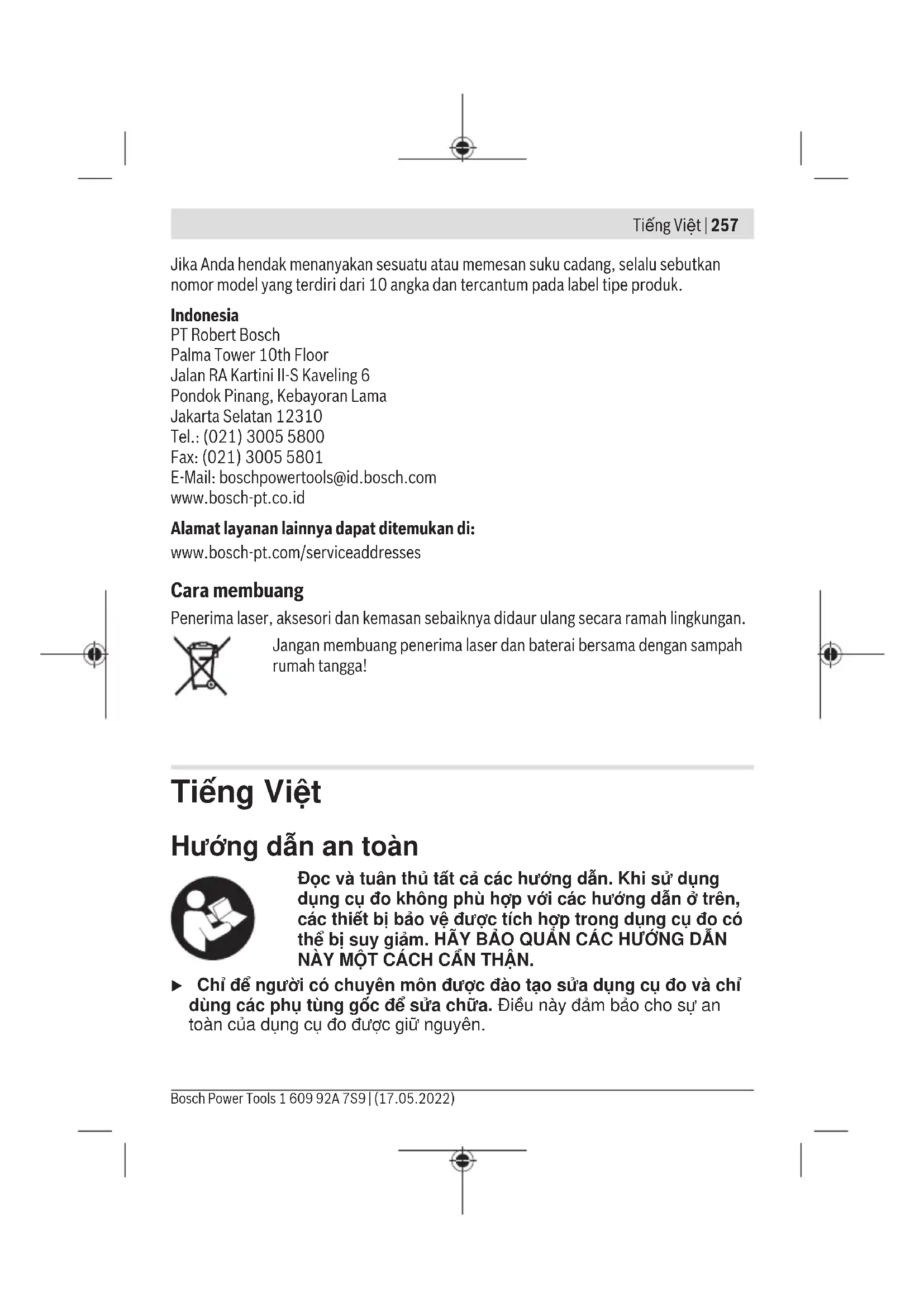 Bộ nguồn 2×1,5V LR3(AAA) Bosch Power Tools 1 609 92A 7S9 | (17.05.2022)260 | Tiếng Việt Thiết bị thu laze LR 6 Thời gian vận hành khoảng. 30h Trọng lượng theo Qui trình EPTA-Procedure01:2014 0,12kg Kích thước (Chiều dài×Chiều rộng×Chiều cao) 69×28×123mm Mức độ bảo vệ IP 54 (được bảo vệ chống bụi và tia nước) A) Phạm vi làm việc có thể được giảm thông qua các điều kiện môi trường không thuận lợi (ví dụ như tia mặt trời chiếu trực tiếp). B) X: phạm vi làm việc tối đa để vận hành với thiết bị thu la-ze theo hướng dẫn vận hành của máy laser đường vạchBosch đã dùng C) phụ thuộc vào khoảng cách giữa thiết bị thu tia la-ze và máy laser tia vạch D) Chỉ có chất bẩn không dẫn xuất hiện, nhưng đôi khi độ dẫn điện tạm thời gây ra do ngưng tụ. Số xêri (13) đều được ghi trên nhãn mác, để dễ dàng nhận dạng loại bộ thu laser. Sự lắp vào Lắp/thay ắc quy Khuyến nghị sử dụng các pin kiềm mangan để vận hành bộ thu laser. Kéo lẫy cài (15) của nắp đậy pin ra ngoài và gấp nắp đậy ngăn chứa pin lên (14). Lắp pin vào. Xin hãy lưu ý lắp tương ứng đúng cực pin như được thể hiện nắp đậy pin. Nếu pin yếu, hiển thị trạng thái(3) sẽ bắt đầu nhấp nháy. Chỉ có thể làm việc với thiết bị thu laser khoảng 2 h. Luôn luôn thay tất cả pin cùng một lần. Chỉ sử dụng pin cùng một hiệu và có cùng một điện dung. u Tháo ắc quy ra khỏi bộ thu laser nếu bạn không muốn sử dụng thiết bị trong thời gian dài. Pin có thể hư mòn sau thời gian bảo quản lâu trong thiết bị thu laser và tự xả điện. 1 609 92A 7S9 | (17.05.2022) Bosch Power ToolsTiếng Việt | 261 Vận Hành Bắt Đầu Vận Hành u Bảo vệ bộ thu laser tránh khỏi ẳm ướt và không để bức xạ mặt trời chiếu trực tiếp vào. u Không cho bộ thu laser tiếp xúc với nhiệt độ khắc nghiệt hoặc dao động nhiệt độ. Không để nó trong chế độ tự động quá lâu. Trong trường hợp có sự thay đổi nhiệt độ thái quá, hãy để cho bộ tiếp nhận laze điều chỉnh theo nhiệt độ chung quanh trước khi đưa vào hoạt động. Trong trường hợp ở trạng thái nhiệt độ cực đoan hay nhiệt độ thay đổi thái quá, sự chính xác của bộ tiếp nhận laze có thể bị hư hỏng. Lắp bộ thu laser (xem hìnhA) Bạn hãy đặt bộ thu laser cách ít nhất5 m so với máy laser đường vạch. Hãy đảm bảo rằng chế độ bộ thu trên máy laser đường vạch hoạt động. Hãy chọn một kiểu vận hành, mà tại đó chỉ một mức laser dọc hoặc ngang được tạo ra. Hướng dẫn: Đồng thời không chọn kiểu vận hành có mức laser ngang và dọc (chế độ chữ thập), vì có thể xuất hiện các hiển thị lỗi về độ cao của luồng laser. Đặt bộ thu laser để tia laser có thể tới được trường nhận (9). So chỉnh dụng cụ đo cách sao cho luồng laze lệch qua một bên xuyên qua phạm vi tiếp nhận (như trong hình minh họa). Bật Mở và Tắt u Khi bật bộ thu laser, một âm tín hệu to phát ra. Vì thế hãy giữ bộ thu laser cách xa tai mình cũng như người khác khi bật. Âm thanh lớn có thể làm suy giảm thính giác. Để Bật bộ thu laser, bạn hãy ấn phím bật/tắt (2). Tất cả các đèn LED chớp tắt và có tín hiệu âm thanh phát ra. Sau khi bật thiết bị thu laser, âm lượng thấp và độ thu nhận chính xác „tinh“ được điều chỉnh. Để Tắt bộ thu laser, bạn hãy ấn lại phím bật/tắt(2). Trước khi tắt, tất cả đèn LED chớp sáng và ba âm tín hiệu phát ra. Hiển thị trạng thái(3) sẽ tắt. Nếu khoảng20phút mà không phím nào ở bộ thu laser được nhấn và không có tia laser nào tới được trường nhận(9) 20phút, thì bộ thu laser sẽ tự động ngắt để tiết kiệm ắc quy. Bosch Power Tools 1 609 92A 7S9 | (17.05.2022)262 | Tiếng Việt Chọn cài đặt hiển thị đường trung bình Bằng nút cài đặt độ thu nhận chính xác(1) bạn có thể xác định với độ chính xác nào vị trí của tia laser được hiển thị trên trường nhận như „ở giữa“: – độ thu nhận chính xác „tinh“ (đường trung bình LED(7) nhấp nháy), – độ thu nhận chính xác „thô“ (Các hiển thị hướng LED „Tia laser trên đường trung bình“(6) và „Tia laser dưới đường trung bình“(8) nhấp nháy). Hình Chỉ Hướng Vị trí tia laser ở trường nhận (9) sẽ được hiển thị: – bằng các hiển thị hướng LED „Tia lsser trên đường trung bình“(6), „Tia laser dưới đường trung bình“(8) hoặc đường trung bình(7) trên mặt trước và mặt sau của bộ thu laser, – tùy chọn thông qua âm tín hiệu. Bộ thu laser quá sâu: tia la-ze đi xuyên qua nửa phần trên của trường nhận(9), sau đó các thiết bị hiển thị hướng LED „Tia laser trên đường trung bình“sẽ chiếu sáng(6). Đối với âm tín hiệu đã bật, thì tín hiệu sẽ phát ra ở tần số cao. Hãy di chuyển bộ thu laser theo hướng mũi tên hướng lên trên. Bộ thu laser quá cao: tia la-ze đi xuyên qua nửa phần dưới của trường nhận(9), sau đó các thiết bị hiển thị hướng LED „Tia laser dưới đường trung bình“sẽ phát sáng (8). Đối với âm tín hiệu đã bật, thì