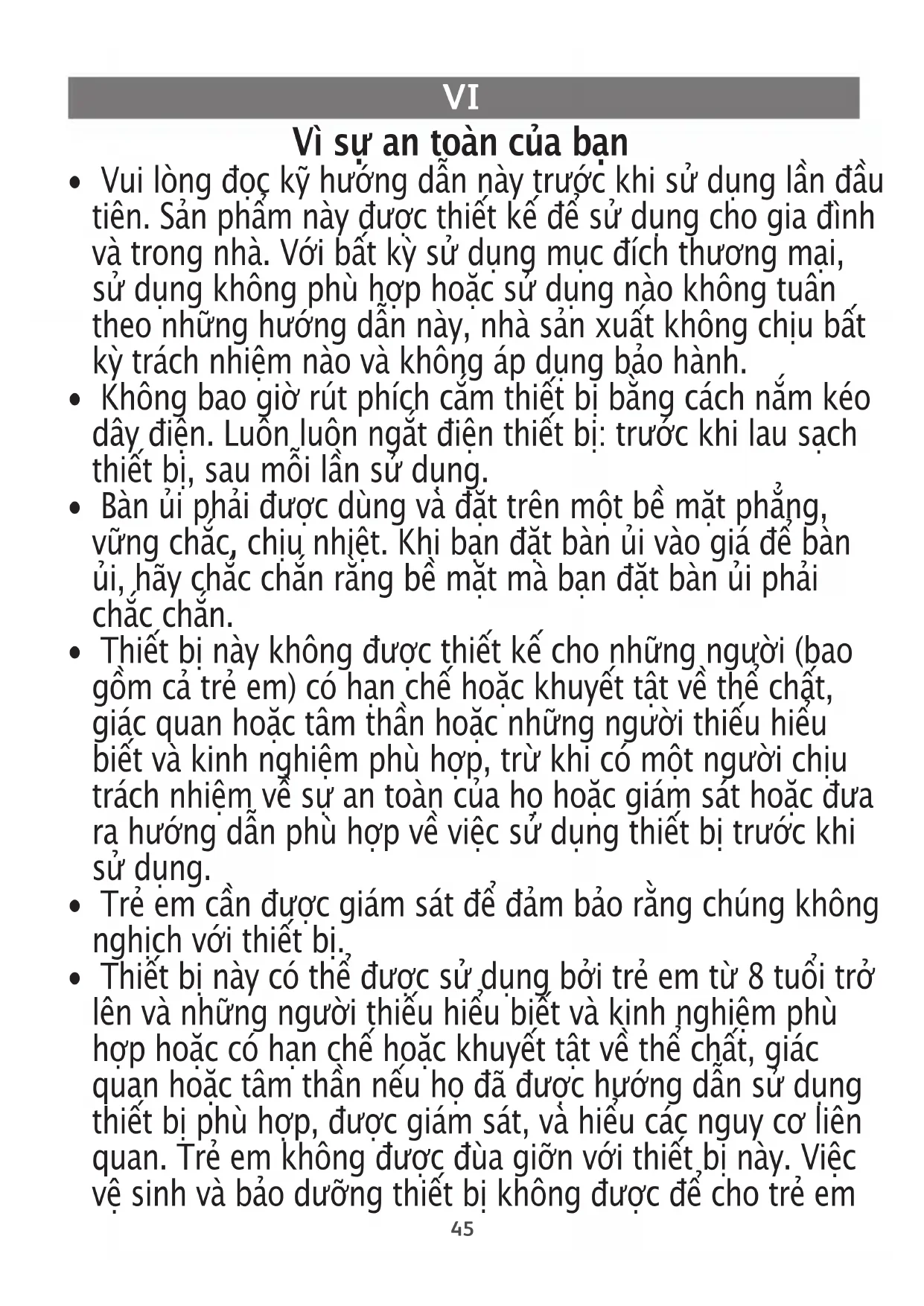 - Thiết bị này có thể được sử dụng bởi trẻ em từ 8 tuổi trở lên và những người thiếu hiểu biết và kinh nghiệm phù hợp hoặc có hạn chế hoặc khuyết tật về thể chất, giác quan hoặc tâm thần nếu họ đã được hướng dẫn sử dụng thiết bị phù hợp, được giám sát, và hiểu các nguy cơ liên quan. Trẻ em không được đùa giỡn với thiết bị này. Việc vệ sinh và bảo dưỡng thiết bị không được để cho trẻ em46 làm mà không có giám sát. Giữ bàn ủi và dây của nó ngoài tầm với của trẻ em khi nó đang được cắm điện hoặc làm nguội.