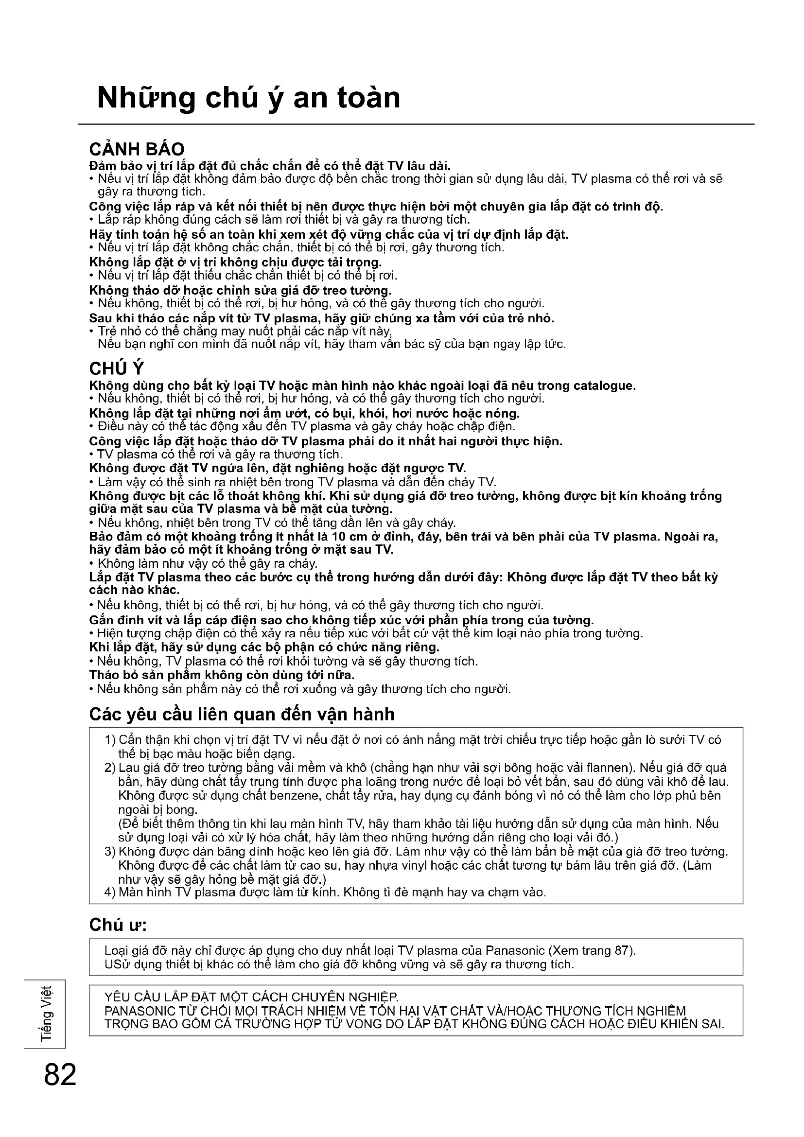 Chú ư: Loại giá đỡ này chỉ được áp dụng cho duy nhất loại TV plasma của Panasonic (Xem trang 87). USử dụng thiết bị khác có thể làm cho giá đỡ không vững và sẽ gây ra thương tích. YÊU CẦU LẮP ĐẶT MỘT CÁCH CHUYÊN NGHIỆP. PANASONIC TỪ CHỐI MỌI TRÁCH NHIỆM VỀ TỔN HẠI VẬT CHẤT VÀ/HOẶC THƯƠNG TÍCH NGHIÊM TRỌNG BAO GỒM CẢ TRƯỜNG HỢP TỬ VONG DO LẮP ĐẶT KHÔNG ĐÚNG CÁCH HOẶC ĐIỀU KHIỂN SAI.83 Tiếng Việt