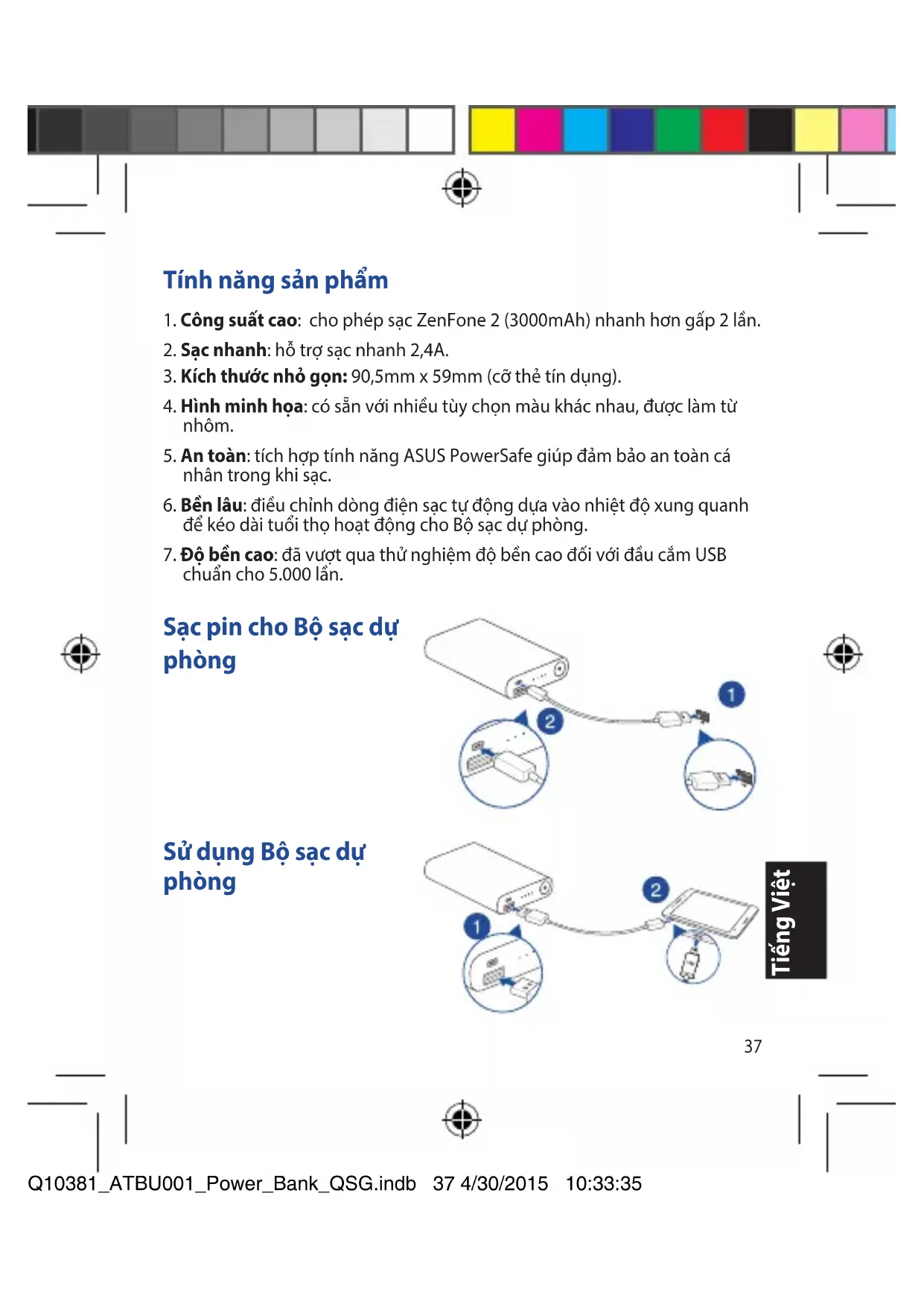 chuẩn cho 5.000 lần. Sạc pin cho Bộ sạc dự phòng Sử dụng Bộ sạc dự phòng Q10381_ATBU001_Power_Bank_QSG.indb 37 4/30/2015 10:33:3538 Tiếng Việt Tiếng Việt Các bộ phận & thông tin đèn báo LED Cổng (vào) micro USB Cổng (ra) USB Các đèn báo LED Nút nguồn Tình trạng màu đèn LED Bật Nhấp nháy Tắt Nhấp nháy nhanh Sạc pin cho Bộ sạc dự phòng Sạc pin cho các thiết bị bằng Bộ sạc dự phòng Tình trạng sạc