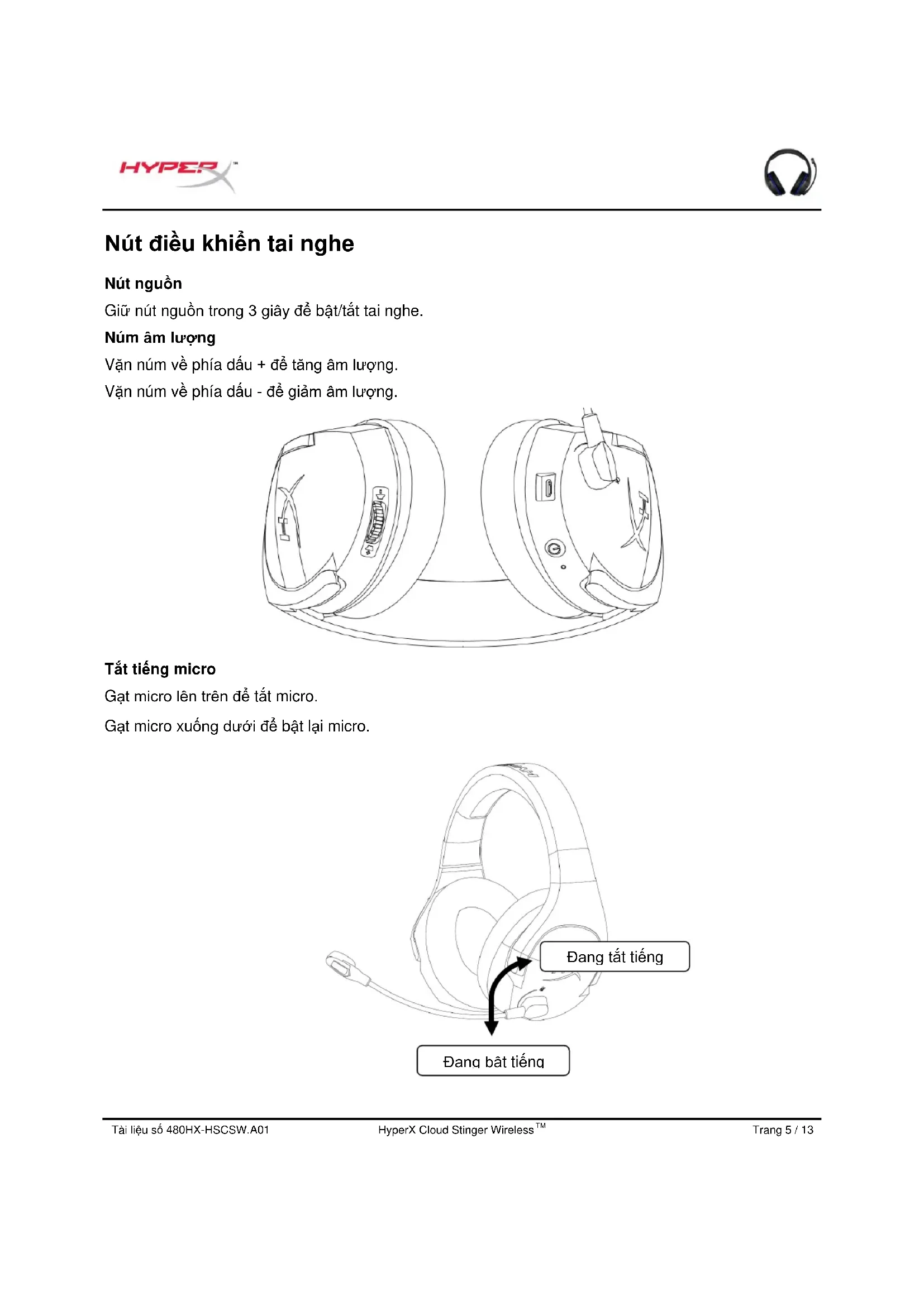 Nút điều khiển tai nghe Nút nguồn Giữ nút nguồn trong 3 giây để bật/tắt tai nghe. Núm âm lượng Vặn núm về phía dấu + để tăng âm lượng. Vặn núm về phía dấu - để giảm âm lượng. Tắt tiếng micro Gạt micro lên trên để tắt micro. Gạt micro xuống dưới để bật lại micro.