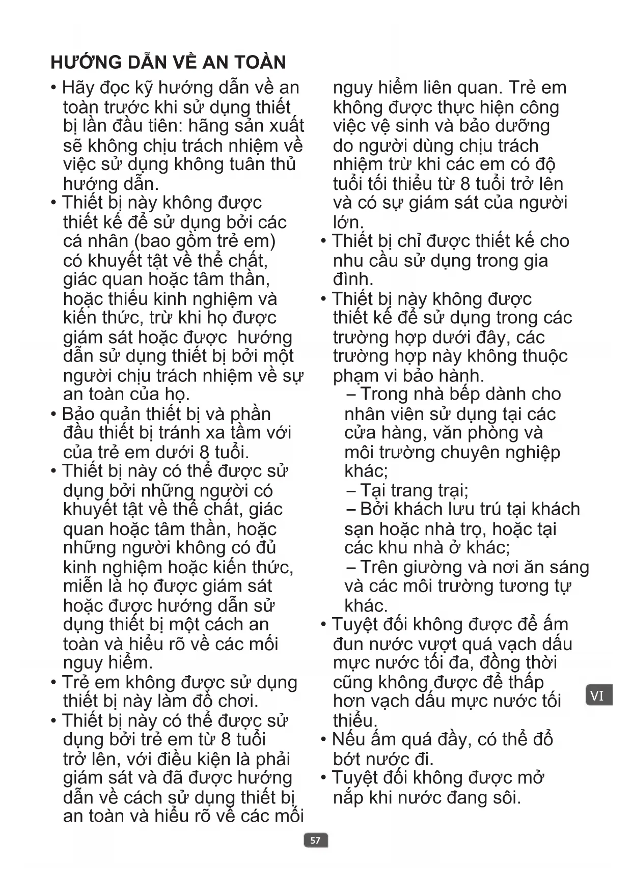- Thiết bị này có thể được sử dụng bởi trẻ em từ 8 tuổi trở lên, với điều kiện là phải giám sát và đã được hướng dẫn về cách sử dụng thiết bị an toàn và hiểu rõ về các mối nguy hiểm liên quan. Trẻ em không được thực hiện công việc vệ sinh và bảo dưỡng do người dùng chịu trách nhiệm trừ khi các em có độ tuổi tối thiểu từ 8 tuổi trở lên và có sự giám sát của người lớn.