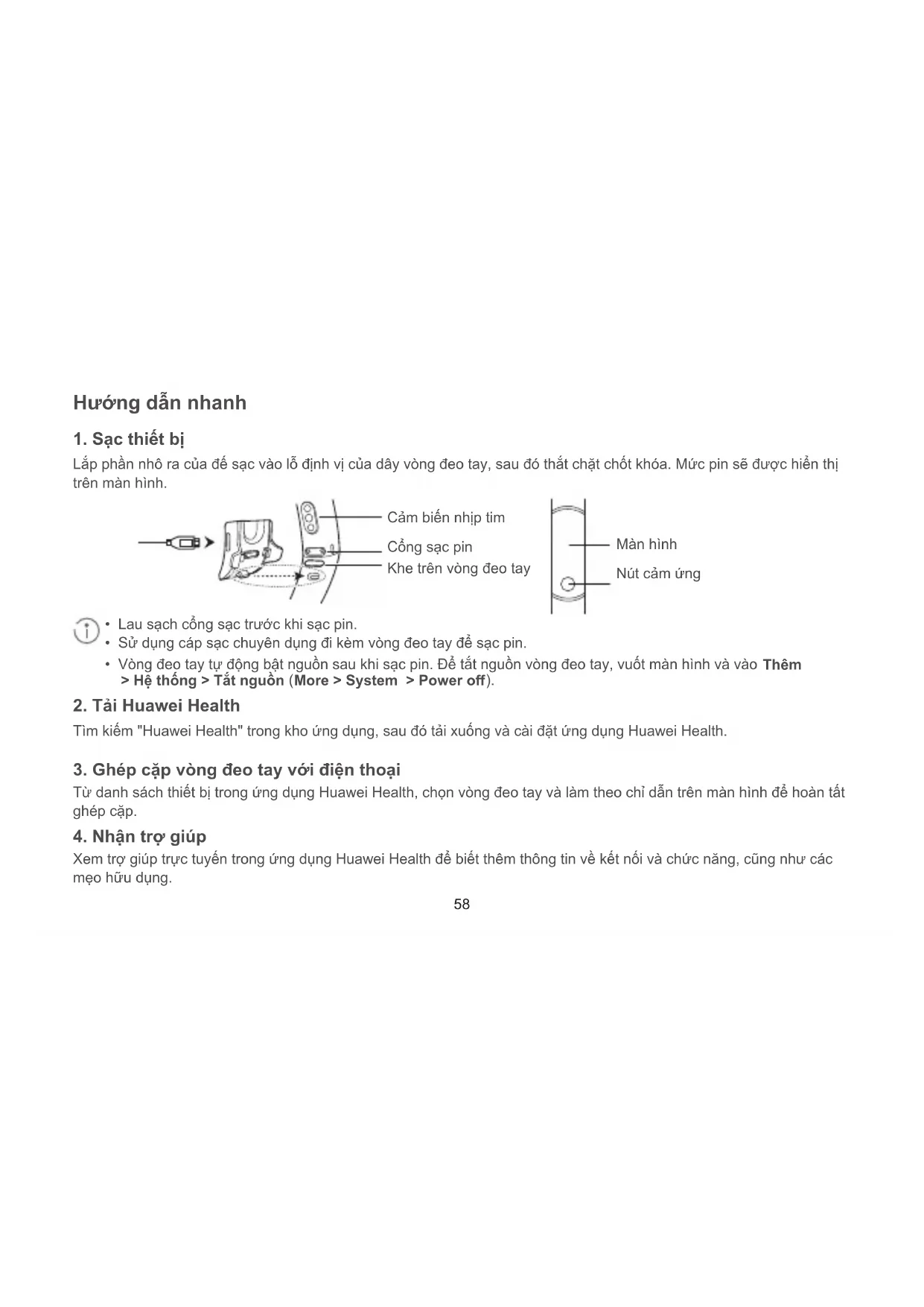 - Vòng đeo tay tự động bật nguồn sau khi sạc pin. Để tắt nguồn vòng đeo tay, vuốt màn hình và vào Thêm > Hệ thống > Tắt nguồn