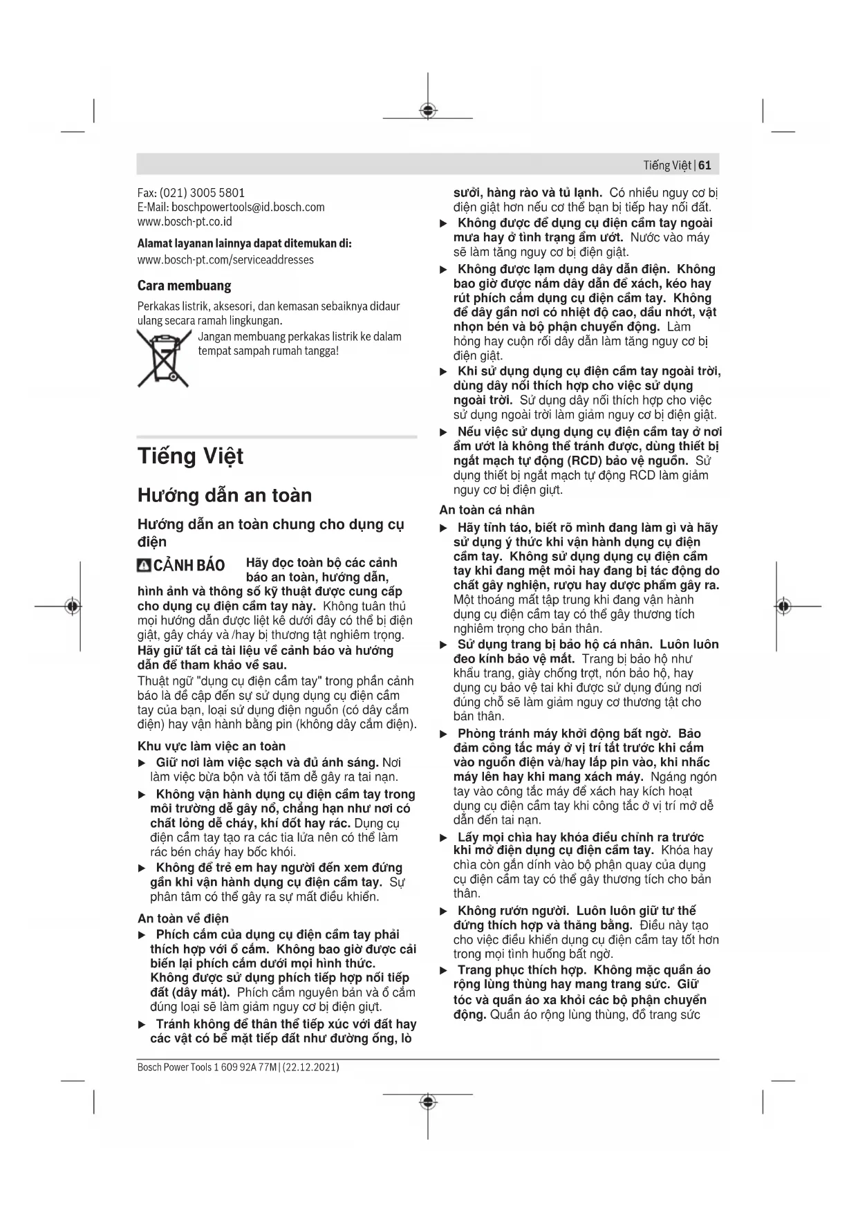 Hãy đọc toàn bộ các cảnh báo an toàn, hướng dẫn, hình ảnh và thông số kỹ thuật được cung cấp cho dụng cụ điện cầm tay này. Không tuân thủ mọi hướng dẫn được liệt kê dưới đây có thể bị điện giật, gây cháy và /hay bị thương tật nghiêm trọng. Hãy giữ tất cả tài liệu về cảnh báo và hướng dẫn để tham khảo về sau. Thuật ngữ "dụng cụ điện cầm tay" trong phần cảnh báo là đề cập đến sự sử dụng dụng cụ điện cầm tay của bạn, loại sử dụng điện nguồn (có dây cắm điện) hay vận hành bằng pin (không dây cắm điện). Khu vực làm việc an toàn u Giữ nơi làm việc sạch và đủ ánh sáng. Nơi làm việc bừa bộn và tối tăm dễ gây ra tai nạn. u Không vận hành dụng cụ điện cầm tay trong môi trường dễ gây nổ, chẳng hạn như nơi có chất lỏng dễ cháy, khí đốt hay rác. Dụng cụ điện cầm tay tạo ra các tia lửa nên có thể làm rác bén cháy hay bốc khói. u Không để trẻ em hay người đến xem đứng gần khi vận hành dụng cụ điện cầm tay. Sự phân tâm có thể gây ra sự mất điều khiển. An toàn về điện u Phích cắm của dụng cụ điện cầm tay phải thích hợp với ổ cắm. Không bao giờ được cải biến lại phích cắm dưới mọi hình thức. Không được sử dụng phích tiếp hợp nối tiếp đất (dây mát). Phích cắm nguyên bản và ổ cắm đúng loại sẽ làm giảm nguy cơ bị điện giựt. u Tránh không để thân thể tiếp xúc với đất hay các vật có bề mặt tiếp đất như đường ống, lò sưởi, hàng rào và tủ lạnh. Có nhiều nguy cơ bị điện giật hơn nếu cơ thể bạn bị tiếp hay nối đất. u Không được để dụng cụ điện cầm tay ngoài mưa hay ở tình trạng ẩm ướt. Nước vào máy sẽ làm tăng nguy cơ bị điện giật. u Không được lạm dụng dây dẫn điện. Không bao giờ được nắm dây dẫn để xách, kéo hay rút phích cắm dụng cụ điện cầm tay. Không để dây gần nơi có nhiệt độ cao, dầu nhớt, vật nhọn bén và bộ phận chuyển động. Làm hỏng hay cuộn rối dây dẫn làm tăng nguy cơ bị điện giật. u Khi sử dụng dụng cụ điện cầm tay ngoài trời, dùng dây nối thích hợp cho việc sử dụng ngoài trời. Sử dụng dây nối thích hợp cho việc sử dụng ngoài trời làm giảm nguy cơ bị điện giật. u Nếu việc sử dụng dụng cụ điện cầm tay ở nơi ẩm ướt là không thể tránh được, dùng thiết bị ngắt mạch tự động (RCD) bảo vệ nguồn. Sử dụng thiết bị ngắt mạch tự động RCD làm giảm nguy cơ bị điện giựt. An toàn cá nhân u Hãy tỉnh táo, biết rõ mình đang làm gì và hãy sử dụng ý thức khi vận hành dụng cụ điện cầm tay. Không sử dụng dụng cụ điện cầm tay khi đang mệt mỏi hay đang bị tác động do chất gây nghiện, rượu hay dược phẩm gây ra. Một thoáng mất tập trung khi đang vận hành dụng cụ điện cầm tay có thể gây thương tích nghiêm trọng cho bản thân. u Sử dụng trang bị bảo hộ cá nhân. Luôn luôn đeo kính bảo vệ mắt. Trang bị bảo hộ như khẩu trang, giày chống trợt, nón bảo hộ, hay dụng cụ bảo vệ tai khi được sử dụng đúng nơi đúng chỗ sẽ làm giảm nguy cơ thương tật cho bản thân. u Phòng tránh máy khởi động bất ngờ. Bảo đảm công tắc máy ở vị trí tắt trước khi cắm vào nguồn điện và/hay lắp pin vào, khi nhấc máy lên hay khi mang xách máy. Ngáng ngón tay vào công tắc máy để xách hay kích hoạt dụng cụ điện cầm tay khi công tắc ở vị trí mở dễ dẫn đến tai nạn. u Lấy mọi chìa hay khóa điều chỉnh ra trước khi mở điện dụng cụ điện cầm tay. Khóa hay chìa còn gắn dính vào bộ phận quay của dụng cụ điện cầm tay có thể gây thương tích cho bản thân. u Không rướn người. Luôn luôn giữ tư thế đứng thích hợp và thăng bằng. Điều này tạo cho việc điều khiển dụng cụ điện cầm tay tốt hơn trong mọi tình huống bất ngờ. u Trang phục thích hợp. Không mặc quần áo rộng lùng thùng hay mang trang sức. Giữ tóc và quần áo xa khỏi các bộ phận chuyển động. Quần áo rộng lùng thùng, đồ trang sức Bosch Power Tools 1 609 92A 77M | (22.12.2021)62 | Tiếng Việt hay tóc dài có thể bị cuốn vào các bộ phận chuyển động. u Nếu có các thiết bị đi kèm để nối máy hút bụi và các phụ kiện khác, bảo đảm các thiết bị này được nối và sử dụng tốt. Việc sử dụng các thiết bị gom hút bụi có thể làm giảm các độc hại liên quan đến bụi gây ra. u Không để thói quen do sử dụng thường xuyên dụng cụ khiến bạn trở nên chủ quan và bỏ qua các quy định an toàn dụng cụ. Một hành vi bất cẩn có thể gây ra thương tích nghiêm trọng chỉ trong tíc tắc. Sử dụng và bảo dưỡng dụng cụ điện cầm tay u Không được ép máy. Sử dụng dụng cụ điện cầm tay đúng loại theo đúng ứng dụng của bạn. Dụng cụ điện cầm tay đúng chức năng sẽ làm việc tốt và an toàn hơn theo đúng tiến độ mà máy được thiết kế. u Không sử dụng dụng cụ điện cầm tay nếu như công tắc không tắt và mở được. Bất kỳ dụng cụ điện cầm tay nào mà không th