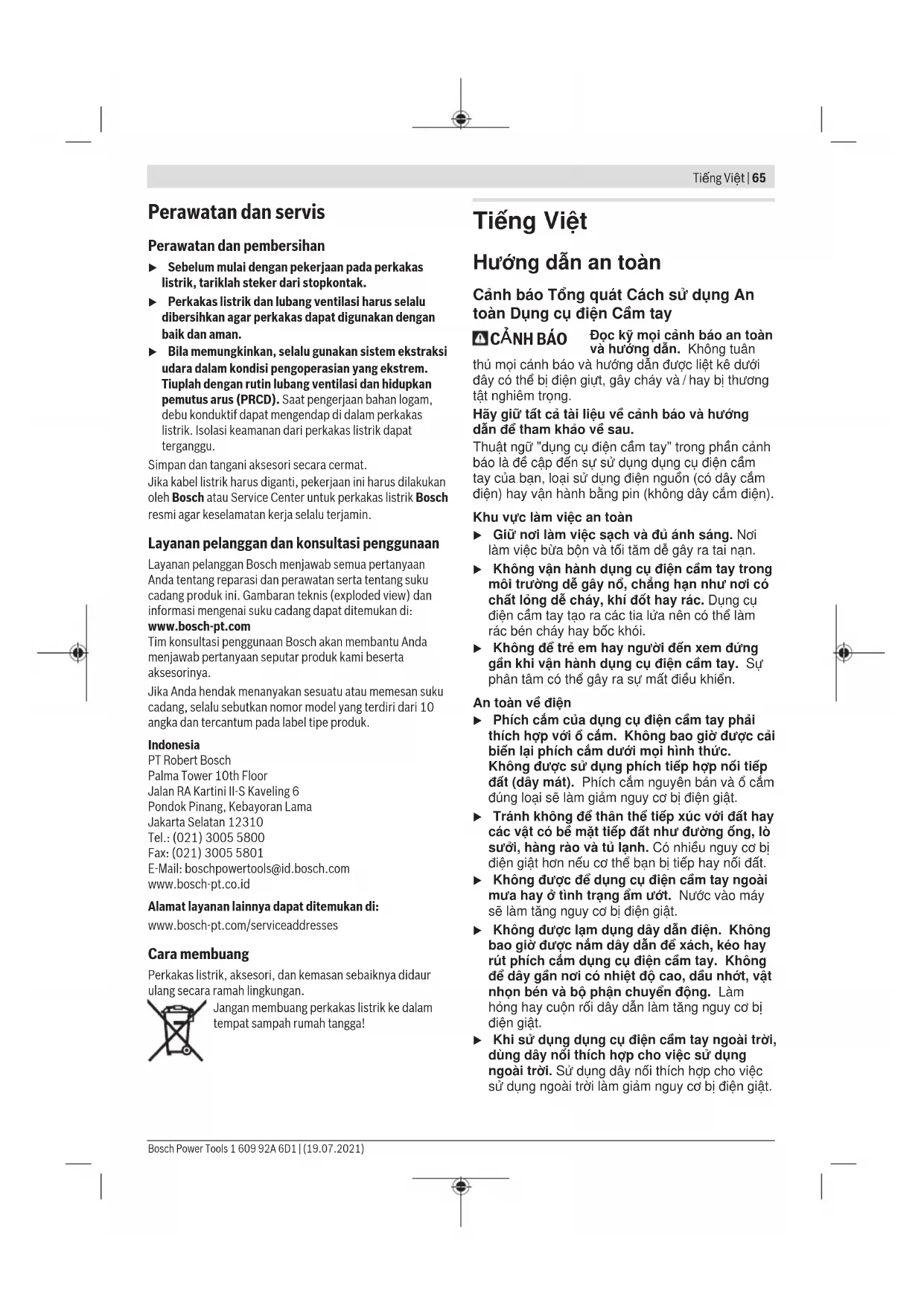 Đọc kỹ mọi cảnh báo an toàn và hướng dẫn. Không tuân thủ mọi cảnh báo và hướng dẫn được liệt kê dưới đây có thể bị điện giựt, gây cháy và / hay bị thương tật nghiêm trọng. Hãy giữ tất cả tài liệu về cảnh báo và hướng dẫn để tham khảo về sau. Thuật ngữ "dụng cụ điện cầm tay" trong phần cảnh báo là đề cập đến sự sử dụng dụng cụ điện cầm tay của bạn, loại sử dụng điện nguồn (có dây cắm điện) hay vận hành bằng pin (không dây cắm điện). Khu vực làm việc an toàn u Giữ nơi làm việc sạch và đủ ánh sáng. Nơi làm việc bừa bộn và tối tăm dễ gây ra tai nạn. u Không vận hành dụng cụ điện cầm tay trong môi trường dễ gây nổ, chẳng hạn như nơi có chất lỏng dễ cháy, khí đốt hay rác. Dụng cụ điện cầm tay tạo ra các tia lửa nên có thể làm rác bén cháy hay bốc khói. u Không để trẻ em hay người đến xem đứng gần khi vận hành dụng cụ điện cầm tay. Sự phân tâm có thể gây ra sự mất điều khiển. An toàn về điện u Phích cắm của dụng cụ điện cầm tay phải thích hợp với ổ cắm. Không bao giờ được cải biến lại phích cắm dưới mọi hình thức. Không được sử dụng phích tiếp hợp nối tiếp đất (dây mát). Phích cắm nguyên bản và ổ cắm đúng loại sẽ làm giảm nguy cơ bị điện giật. u Tránh không để thân thể tiếp xúc với đất hay các vật có bề mặt tiếp đất như đường ống, lò sưởi, hàng rào và tủ lạnh. Có nhiều nguy cơ bị điện giật hơn nếu cơ thể bạn bị tiếp hay nối đất. u Không được để dụng cụ điện cầm tay ngoài mưa hay ở tình trạng ẩm ướt. Nước vào máy sẽ làm tăng nguy cơ bị điện giật. u Không được lạm dụng dây dẫn điện. Không bao giờ được nắm dây dẫn để xách, kéo hay rút phích cắm dụng cụ điện cầm tay. Không để dây gần nơi có nhiệt độ cao, dầu nhớt, vật nhọn bén và bộ phận chuyển động. Làm hỏng hay cuộn rối dây dẫn làm tăng nguy cơ bị điện giật. u Khi sử dụng dụng cụ điện cầm tay ngoài trời, dùng dây nối thích hợp cho việc sử dụng ngoài trời. Sử dụng dây nối thích hợp cho việc sử dụng ngoài trời làm giảm nguy cơ bị điện giật. Bosch Power Tools 1 609 92A 6D1 | (19.07.2021)66 | Tiếng Việt u Nếu việc sử dụng dụng cụ điện cầm tay ở nơi ẩm ướt là không thể tránh được, dùng thiết bị ngắt mạch tự động (RCD) bảo vệ nguồn. Sử dụng thiết bị ngắt mạch tự động RCD làm giảm nguy cơ bị điện giật. An toàn cá nhân u Hãy tỉnh táo, biết rõ mình đang làm gì và hãy sử dụng ý thức khi vận hành dụng cụ điện cầm tay. Không sử dụng dụng cụ điện cầm tay khi đang mệt mỏi hay đang bị tác động do chất gây nghiện, rượu hay dược phẩm gây ra. Một thoáng mất tập trung khi đang vận hành dụng cụ điện cầm tay có thể gây thương tích nghiêm trọng cho bản thân. u Sử dụng trang bị bảo hộ cá nhân. Luôn luôn đeo kính bảo vệ mắt. Trang bị bảo hộ như khẩu trang, giày chống trượt, nón bảo hộ, hay dụng cụ bảo vệ tai khi được sử dụng đúng nơi đúng chỗ sẽ làm giảm nguy cơ thương tật cho bản thân. u Phòng tránh máy khởi động bất ngờ. Bảo đảm công tắc máy ở vị trí tắt trước khi cắm vào nguồn điện và/hay lắp pin vào, khi nhấc máy lên hay khi mang xách máy. Ngáng ngón tay vào công tắc máy để xách hay kích hoạt dụng cụ điện cầm tay khi công tắc ở vị trí mở dễ dẫn đến tai nạn. u Lấy mọi chìa hay khóa điều chỉnh ra trước khi mở điện dụng cụ điện cầm tay. Khóa hay chìa còn gắn dính vào bộ phận quay của dụng cụ điện cầm tay có thể gây thương tích cho bản thân. u Không rướn người. Luôn luôn giữ tư thế đứng thích hợp và thăng bằng. Điều này tạo cho việc điều khiển dụng cụ điện cầm tay tốt hơn trong mọi tình huống bất ngờ. u Trang phục thích hợp. Không mặc quần áo rộng lùng thùng hay mang trang sức. Giữ tóc, quần áo và găng tay xa khỏi các bộ phận chuyển động. Quần áo rộng lùng thùng, đồ trang sức hay tóc dài có thể bị cuốn vào các bộ phận chuyển động. u Nếu có các thiết bị đi kèm để nối máy hút bụi và các phụ kiện khác, bảo đảm các thiết bị này được nối và sử dụng tốt. Việc sử dụng các thiết bị gom hút bụi có thể làm giảm các độc hại liên quan đến bụi gây ra. Sử dụng và bảo dưỡng dụng cụ điện cầm tay u Không được ép máy. Sử dụng dụng cụ điện cầm tay đúng loại theo đúng ứng dụng của bạn. Dụng cụ điện cầm tay đúng chức năng sẽ làm việc tốt và an toàn hơn theo đúng tiến độ mà máy được thiết kế. u Không sử dụng dụng cụ điện cầm tay nếu như công tắc không tắt và mở được. Bất kỳ dụng cụ điện cầm tay nào mà không thể điều khiển được bằng công tắc là nguy hiểm và phải được sửa chữa. u Rút phích cắm ra khỏi nguồn điện và/hay pin ra khỏi dụng cụ điện cầm tay trước khi tiến hành bất kỳ điều chỉnh nào, thay phụ kiện, hay cất dụng cụ điện cầm tay. Các biện pháp ngăn