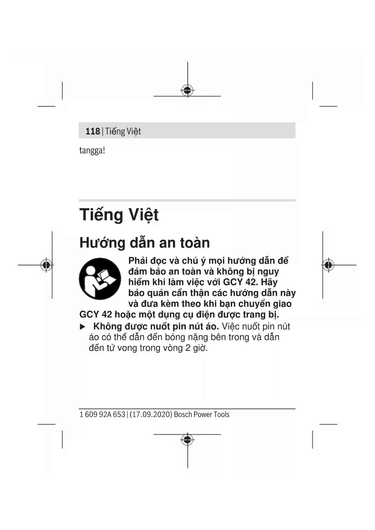 GCY42 có khoảng thời gian truyền đều đặn. Tùy thuộc vào môi trường xung quanh mà cần có nhiều khoảng thời gian truyền, trước khi GCY42 được nhận diện. Nếu GCY42 không được nhận diện, hãy kiểm tra điều sau đây: – Khoảng cách tới thiết bị đầu cuối di động có lớn không? Hãy giảm khoảng cách giữa thiết bị đầu cuối di động với GCY42. Bosch Power Tools 1 609 92A 653 | (17.09.2020)128 | Tiếng Việt – Pin có quá yếu hay rỗng không? Hãy thay pin. – Tắt Bluetooth ® trên thiết bị di động đầu cuối và bật lại. Kiểm tra xem GCY42 hiện có được nhận diện không. Bảo Dưỡng và Bảo Quản Bảo Dưỡng Và Làm Sạch Hãy loại bỏ bụi bẩn bằng bàn chải. Không được sử dụng chất tẩy rửa. Dịch vụ hỗ trợ khách hàng và tư vấn sử dụng Bộ phận phục vụ hàng sau khi bán của chúng tôi trả lời các câu hỏi liên quan đến việc bảo dưỡng và sửa chữa các sản phẩm cũng như phụ tùng thay thế của bạn. Sơ đồ mô tả và thông tin về phụ tùng thay thế cũng có thể tra cứu theo dưới đây: www.bosch- pt.com 1 609 92A 653 | (17.09.2020) Bosch Power ToolsTiếng Việt | 129 Đội ngũ tư vấn sử dụng của Bosch sẽ giúp bạn giải đáp các thắc mắc về sản phẩm và phụ kiện. Trong tất cả các phản hồi và đơn đặt phụ tùng, xin vui lòng luôn luôn nhập số hàng hóa 10 chữ số theo nhãn của hàng hóa. Việt Nam CN CÔNG TY TNHH BOSCH VIÊT NAM TAI TP.HCM Tâng 14, Ngôi Nhà Đức, 33 Lê Duẩn Phương Bến Nghé, Quân 1, Thanh Phô Hô Chi Minh Tel.: (028) 6258 3690 Fax: (028) 6258 3692 - 6258 3694 Hotline: (028) 6250 8555 Email: tuvankhachhang-pt@vn.bosch.com www.bosch-pt.com.vn www.baohanhbosch-pt.com.vn Xem thêm địa chỉ dịch vụ tại: www.bosch-pt.com/serviceaddresses Sự thải bỏ Mô-đun GCY42, phụ kiện và bao bì phải được phân loại để tái chế theo hướng thân thiện với môi trường. Bosch Power Tools 1 609 92A 653 | (17.09.2020)130 | Tiếng Việt Không bỏ linh kiện điện tử và pin vào chung rác thải hộ gia đình! 1 609 92A 653 | (17.09.2020) Bosch Power Toolsيبرع | 131