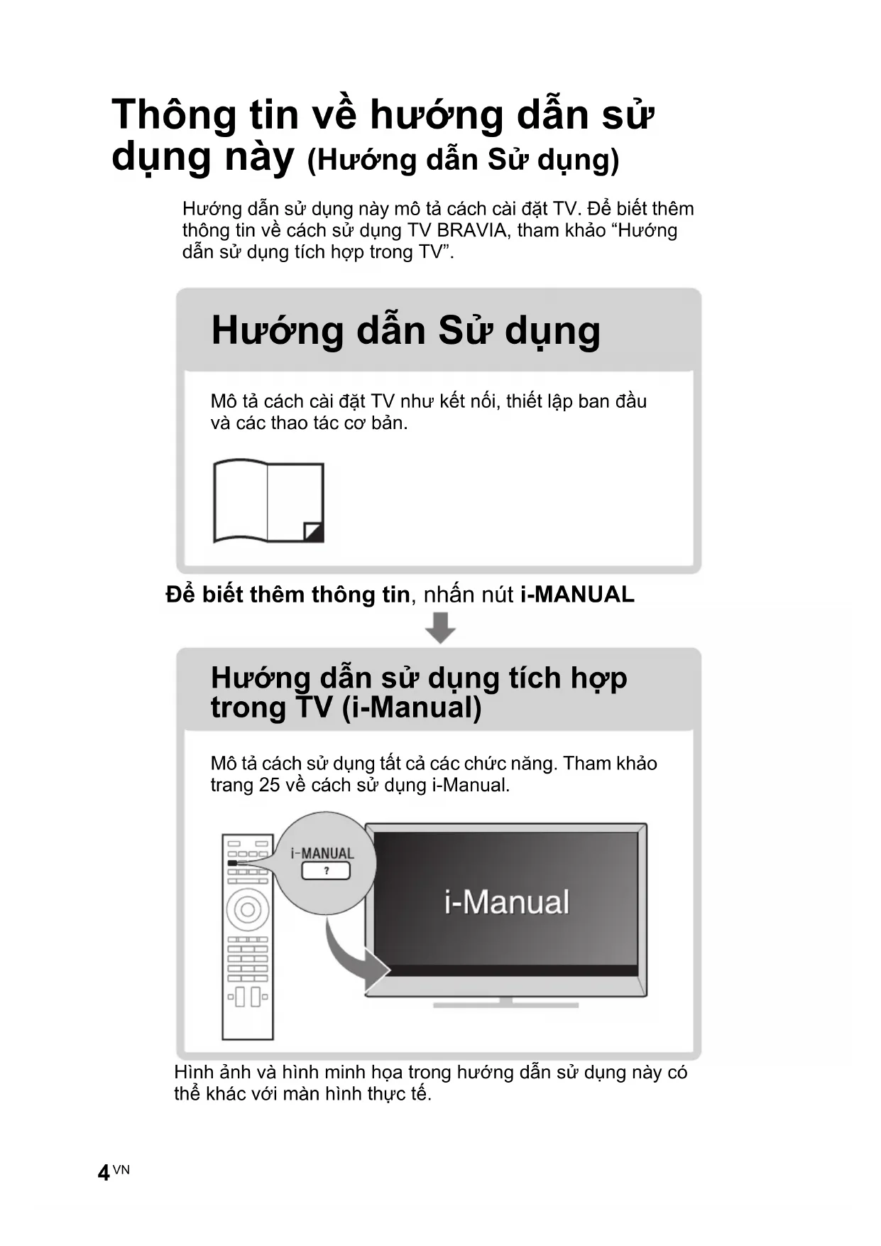 Thông tin về hướng dẫn sử dụng này (Hướng dẫn Sử dụng) Hướng dẫn sử dụng này mô tả cách cài đặt TV. Để biết thêm thông tin về cách sử dụng TV BRAVIA, tham khảo “Hướng dẫn sử dụng tích hợp trong TV”. Hướng dẫn Sử dụng Hướng dẫn sử dụng tích hợp trong TV (i-Manual) Mô tả cách cài đặt TV như kết nối, thiết lập ban đầu và các thao tác cơ bản. Để biết thêm thông tin, nhấn nút i-MANUAL Mô tả cách sử dụng tất cả các chức năng. Tham khảo trang 25 về cách sử dụng i-Manual. Hình ảnh và hình minh họa trong hướng dẫn sử dụng này có thể khác với màn hình thực tế.D:\TV's JOB\SONY TV\SY120107_A32\4437553111_VN\VN01TOC.fm KD-84X9000 4-437-553-11(1)