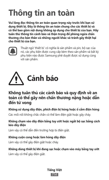 Thông tin an toàn Vui lòng đọc thông tin an toàn quan trọng này trước khi bạn sử dụng thiết bị. Đây là thông tin an toàn chung cho các thiết bị và có thể bao gồm nội dung không áp dụng cho thiết bị của bạn. Hãy tuân thủ thông tin cảnh báo và thận trọng để phòng ngừa chấn thương cho bản thân và những người khác và tránh gây thiệt hại cho thiết bị của bạn. Thuật ngữ ‘thiết bị’ có nghĩa là sản phẩm và pin, bộ sạc của nó, các phụ kiện được cung cấp kèm theo sản phẩm và bất kỳ phụ kiện nào được Samsung phê duyệt được sử dụng cùng với sản phẩm. Cảnh báo Không tuân thủ các cảnh báo và quy định về an toàn có thể gây nên chấn thương nặng hoặc dẫn đến tử vong Không sử dụng dây điện, phích điện bị hỏng hoặc ổ cắm điện hỏng Các mối nối không chắc chắn có thể làm điện giật hoặc gây cháy. Không chạm vào dây điện bằng tay ướt hoặc ngắt bộ sạc bằng cách kéo dây điện Làm vậy có thể dẫn đến trường hợp bị điện giật. Không cuộn cong hoặc làm hỏng dây điện Làm vậy có thể gây điện giật hoặc cháy. Không dùng thiết bị khi đang sạc hoặc chạm vào máy bằng tay ướt Làm vậy có thể gây điện giật. Tiếng Việt