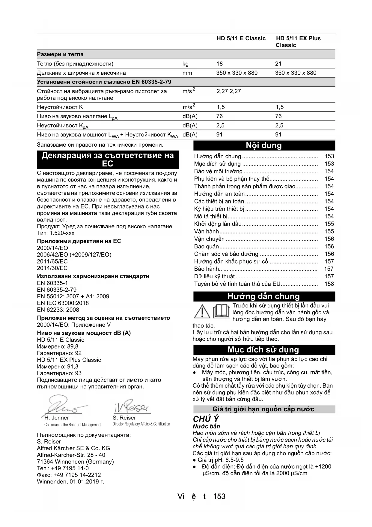 • dB(A) 91 91 HD 5/11 E Classic HD 5/11 EX Plus Classic Chairman of the Board of ManagementDirector Regulatory Affairs & Certification H. Jenner S. Reiser Hướng dẫn chung p. 153