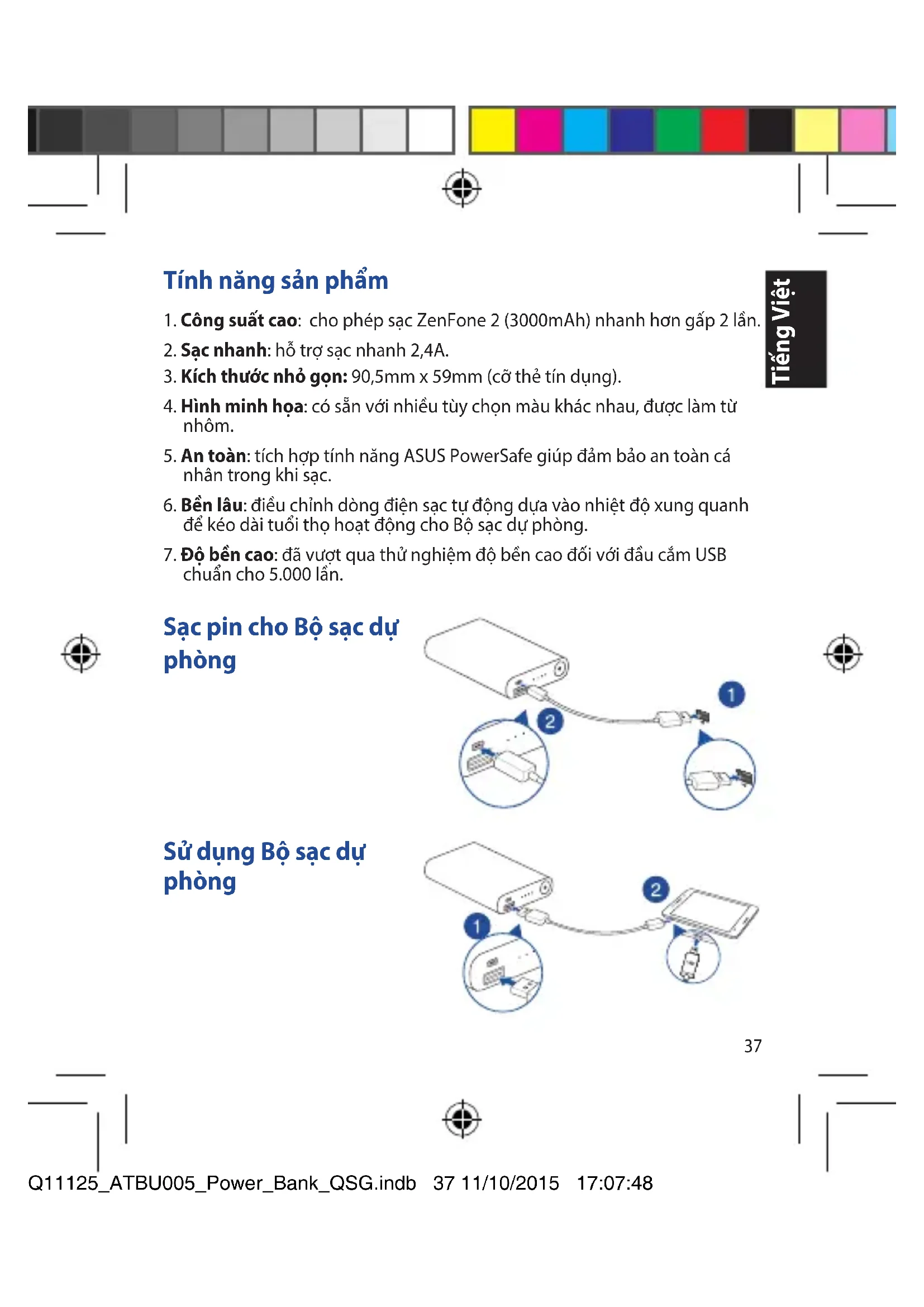 Q11125_ATBU005_Power_Bank_QSG.indb 38 11/10/2015 17:07:5039 Tiếng Việt Tiếng Việt Thông số kỹ thuật Loại pin Pin sạc lithi-ion Dung lượng pin Điện một chiều (DC) 3,6V/10050 mAh (36Wh) Nhiệt độ sạc pin 0°C - 40°C Kích thước 90,5 mm x 59 mm (Cỡ thẻ tín dụng) x 22 mm Trọng lượng 215 ± 3g Thời gian sạc 6 tiếng bằng cáp chuẩn DC 5V/2A 9 tiếng bằng cáp chuẩn DC 5V/1A Đầu vào DC 5,0V, 2,0 A (Tối đa) Đầu ra DC 5,1V, 2,4 A (Tối đa) Thông báo an toàn