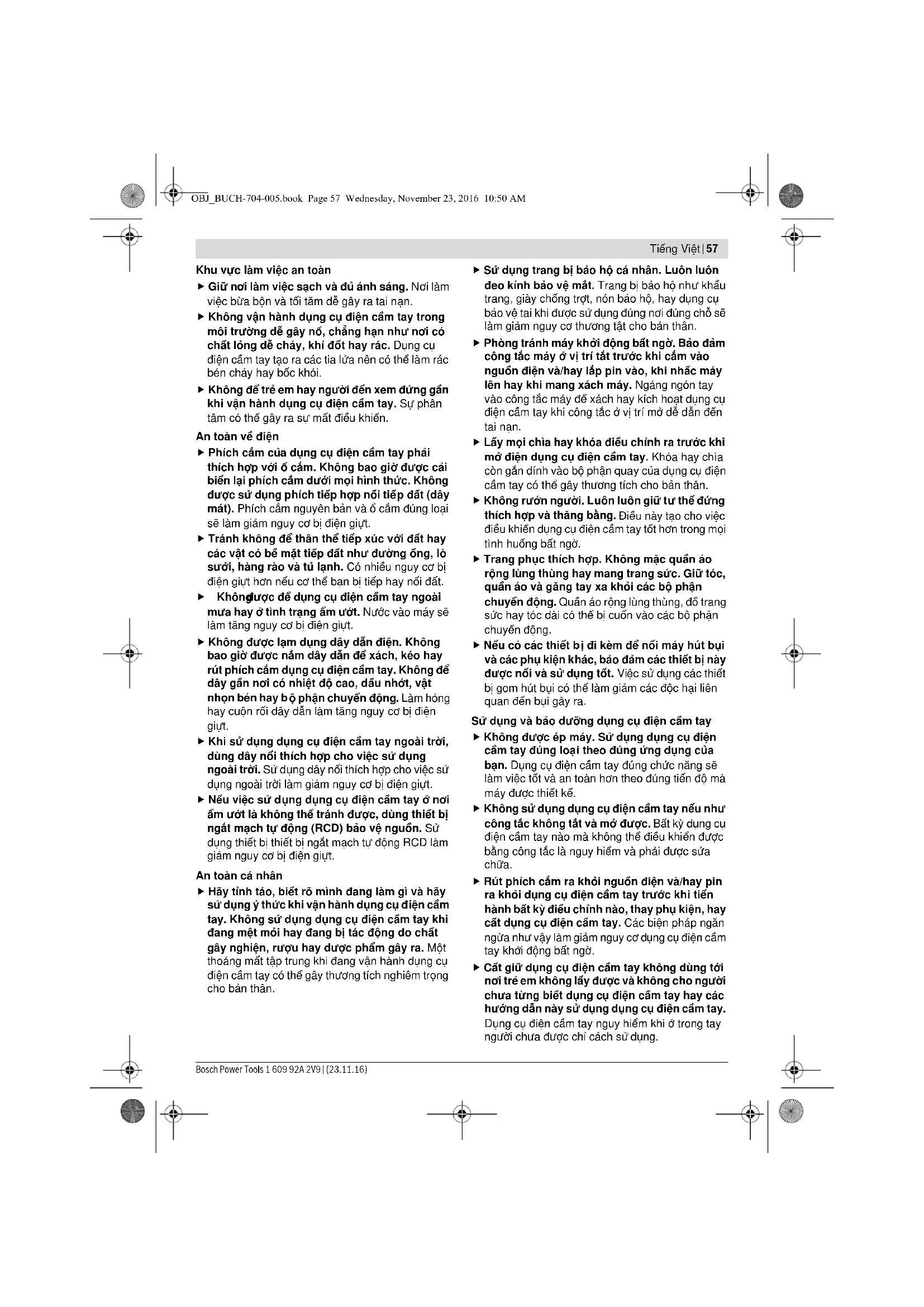 tay khởi động bất ngờ. Cất giữ dụng cụ điện cầm tay không dùng tới nơi trẻ em không lấy được và không cho người chưa từng biết dụng cụ điện cầm tay hay các hướng dẫn này sử dụng dụng cụ điện cầm tay. Dụng cụ điện cầm tay nguy hiểm khi ở trong tay người chưa được chỉ cách sử dụng. OBJ_BUCH-704-005.book Page 57 Wednesday, November 23, 2016 10:50 AM58 | Tiếng Việt 1 609 92A 2V9 | (23.11.16) Bosch Power Tools Bảo quản dụng cụ điện cầm tay. Kiểm tra xem các bộ phận chuyển động có bị sai lệch hay kẹt, các bộ phận bị rạn nứt và các tình trạng khác có thể ảnh hưởng đến sự vận hành của máy. Nếu bị hư hỏng, phải sửa chữa máy trước khi sử dụng. Nhiều tai nạn xảy ra do bảo quản dụng cụ đi ện cầm tay tồi. Giữ các dụng cụ cắt bén và sạch. Bảo quản đúng cách các dụng cụ cắt có cạnh cắt bén làm giảm khả năng bị kẹt và dễ điều khiển hơn. Sử dụng dụng cụ điện cầm tay, phụ kiện, đầu cài v. v., đúng theo các chỉ dẫn này, hãy lưu ý đến điều kiện làm việc và công việc phải th