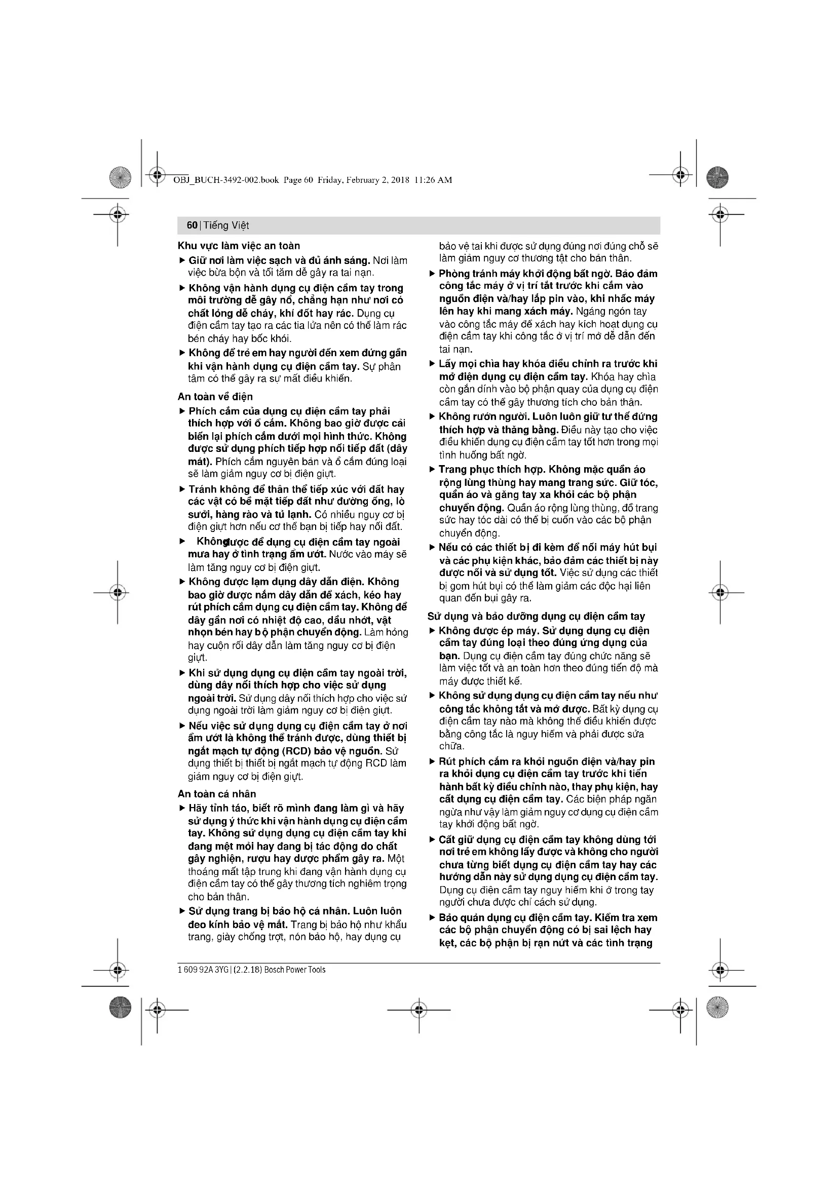 Floor Jl. RA Kartini II-S Kaveling 6 Sek II Pondok Pinang, Kebayoran Lama Jakarta Selatan 12310 Tel.: (021) 3005 5800 Fax: (021) 3005 5801 E-Mail: boschpowertools@id.bosch.com www.bosch-pt.co.id Cara membuang Perkakas listrik, aksesori dan kemasan sebaiknya didaur ulangkan sesuai dengan upaya untuk melindungi lingkungan hidup. Janganlah membuang perkakas listrik dalam sampah rumah tangga! Perubahan dapat terjadi tanpa pemberitahuan sebelumnya. Tiếng Việt Các Nguyên Tắc An Toàn Cảnh báo tổng quát cách sử dụng an toàn dụng cụ điện cầm tay Đọc kỹ mọi cảnh báo an toàn và hướng dẫn. Không tuân thủ mọi cảnh báo và hướng dẫn được liệt kê dưới đây có thể bị điện giựt, gây cháy và/hay bị thương tật nghiêm trọng. Hãy giữ tất cả tài liệu về cảnh báo và hướng dẫn để tham khảo về sau. Thuật ngữ “dụng cụ điện cầm tay” trong phần cảnh báo là đề cập đế n sự sử dụng dụng cụ điện cầm tay của bạn, loại sử dụng điện nguồn (có dây cắm điện) hay vận hành bằng pin (không dây cắm điện). OBJ_BUCH-3492-002.book Page 59 Friday, February 2, 2018 11:26 AM60 | Tiếng Việt 1 609 92A 3YG | (2.2.18) Bosch Power Tools Khu vực làm việc an toàn Giữ nơi làm việc sạch và đủ ánh sáng. Nơi làm việc bừa bộn và tối tăm dễ gây ra tai nạn. Không vận hành dụng cụ điện cầm tay trong môi trường dễ gây nổ, chẳng hạn như nơi có chất lỏng dễ cháy, khí đốt hay rác. Dụng cụ điện cầm tay tạo ra các tia lửa nên có thể làm rác bén cháy hay bốc khói. Không để trẻ em hay người đến xem đứng gần khi vận hành dụng cụ điện cầm tay. Sự phân tâm có thể gây ra sự mất điều khiển. An toàn về điện Phích cắm của dụng cụ điện cầm tay phải thích hợp với ổ cắm. Không bao giờ được cải biến lại phích cắm dưới mọi hình thức. Không được sử dụng phích tiếp hợp nối tiế p đất (dây mát). Phích cắm nguyên bản và ổ cắm đúng loại sẽ làm giảm nguy cơ bị điện giựt. Tránh không để thân thể tiếp xúc với đất hay các vật có bề mặt tiếp đất như đường ống, lò sưởi, hàng rào và tủ lạnh. Có nhiều nguy cơ bị điện giựt hơn nếu cơ thể bạn bị tiếp hay nối đất. Không được để dụng cụ điện cầm tay ngoài mưa hay ở tình trạng ẩm ướt. Nước vào máy sẽ làm tăng nguy cơ bị điện giựt. Không được lạm dụng dây dẫn điện. Không bao giờ được nắm dây dẫn để xách, kéo hay rút phích cắm dụng cụ điện cầm tay. Không để dây gần nơi có nhiệt độ cao, dầu nhớt, vật nhọn bén hay b ộ phận chuyển động. Làm hỏng hay cuộn rối dây dẫn làm tăng nguy cơ bị điện giựt. Khi sử dụng dụng cụ điện cầm tay ngoài trời, dùng dây nối thích hợp cho việc sử dụng ngoài trời. Sử dụng dây nối thích hợp cho việc sử dụng ngoài trời làm giảm nguy cơ bị điện giựt. Nếu việc sử d ụng dụng cụ điện cầm tay ở nơi ẩm ướt là không thể tránh được, dùng thiết bị ngắt mạch tự động (RCD) bảo vệ nguồn. Sử dụng thiết bị thiết bị ngắt mạch tự động RCD làm giảm nguy cơ bị điện giựt. An toàn cá nhân Hãy tỉnh táo, biết rõ mình đang làm gì và hãy sử dụng ý thức khi vận hành dụng cụ đ iện cầm tay. Không sử dụng dụng cụ điện cầm tay khi đang mệt mỏi hay đang bị tác động do chất gây nghiện, rượu hay dược phẩm gây ra. Một thoáng mất tập trung khi đang vận hành dụng cụ điện cầm tay có thể gây thương tích nghiêm trọng cho bản thân. Sử dụng trang bị bảo hộ cá nhân. Luôn luôn đeo kính bảo vệ mắt. Trang bị bảo hộ nh ư khẩu trang, giày chống trợt, nón bảo hộ, hay dụng cụ bảo vệ tai khi được sử dụng đúng nơi đúng chỗ sẽ làm giảm nguy cơ thương tật cho bản thân. Phòng tránh máy khởi động bất ngờ. Bảo đảm công tắc máy ở vị trí tắt trước khi cắm vào nguồn điện và/hay lắp pin vào, khi nhấc máy lên hay khi mang xách máy. Ngáng ngón tay vào công tắc máy để xách hay kích hoạt dụng cụ