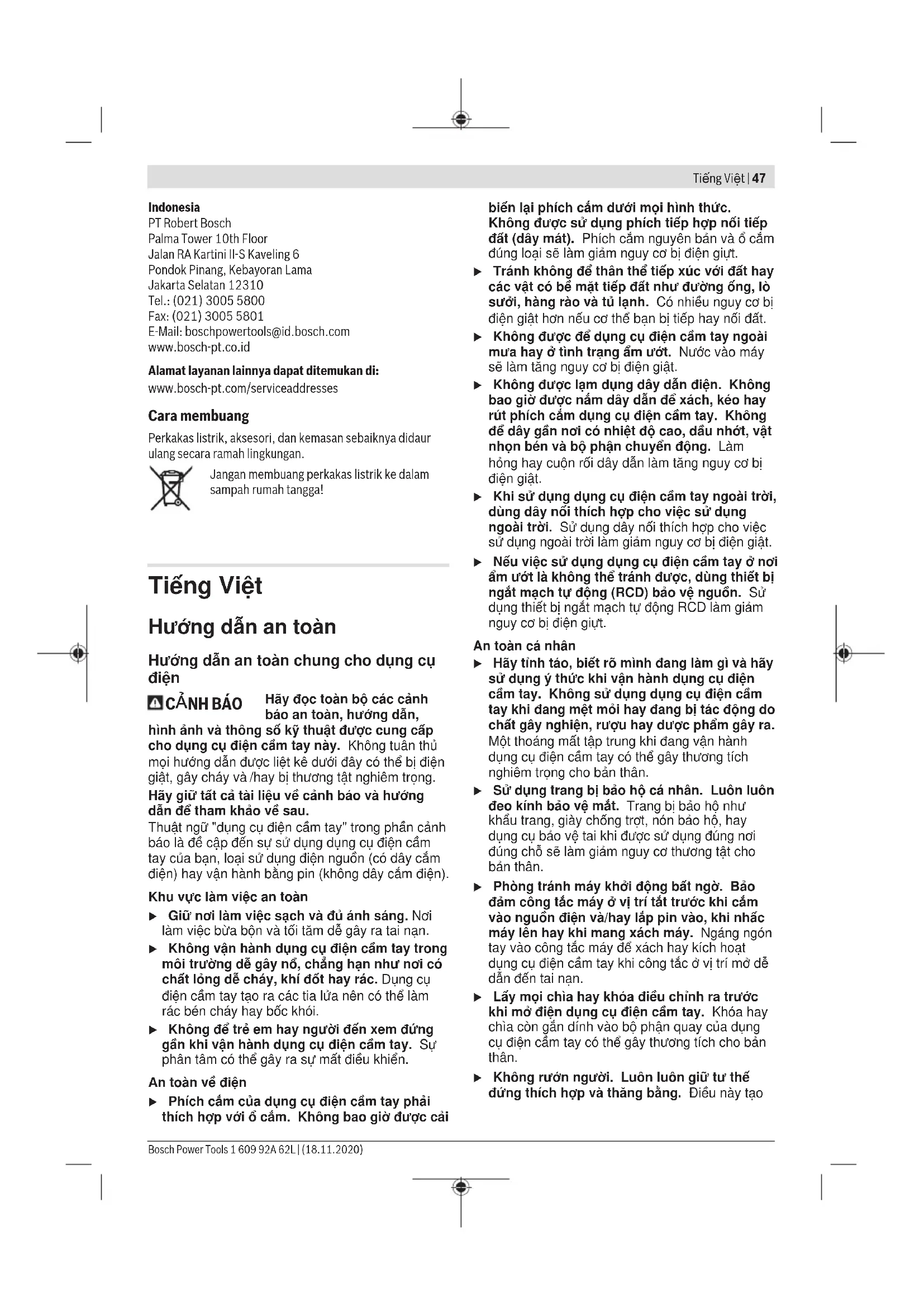 Hãy đọc toàn bộ các cảnh báo an toàn, hướng dẫn, hình ảnh và thông số kỹ thuật được cung cấp cho dụng cụ điện cầm tay này. Không tuân thủ mọi hướng dẫn được liệt kê dưới đây có thể bị điện giật, gây cháy và /hay bị thương tật nghiêm trọng. Hãy giữ tất cả tài liệu về cảnh báo và hướng dẫn để tham khảo về sau. Thuật ngữ "dụng cụ điện cầm tay" trong phần cảnh báo là đề cập đến sự sử dụng dụng cụ điện cầm tay của bạn, loại sử dụng điện nguồn (có dây cắm điện) hay vận hành bằng pin (không dây cắm điện). Khu vực làm việc an toàn u Giữ nơi làm việc sạch và đủ ánh sáng. Nơi làm việc bừa bộn và tối tăm dễ gây ra tai nạn. u Không vận hành dụng cụ điện cầm tay trong môi trường dễ gây nổ, chẳng hạn như nơi có chất lỏng dễ cháy, khí đốt hay rác. Dụng cụ điện cầm tay tạo ra các tia lửa nên có thể làm rác bén cháy hay bốc khói. u Không để trẻ em hay người đến xem đứng gần khi vận hành dụng cụ điện cầm tay. Sự phân tâm có thể gây ra sự mất điều khiển. An toàn về điện u Phích cắm của dụng cụ điện cầm tay phải thích hợp với ổ cắm. Không bao giờ được cải biến lại phích cắm dưới mọi hình thức. Không được sử dụng phích tiếp hợp nối tiếp đất (dây mát). Phích cắm nguyên bản và ổ cắm đúng loại sẽ làm giảm nguy cơ bị điện giựt. u Tránh không để thân thể tiếp xúc với đất hay các vật có bề mặt tiếp đất như đường ống, lò sưởi, hàng rào và tủ lạnh. Có nhiều nguy cơ bị điện giật hơn nếu cơ thể bạn bị tiếp hay nối đất. u Không được để dụng cụ điện cầm tay ngoài mưa hay ở tình trạng ẩm ướt. Nước vào máy sẽ làm tăng nguy cơ bị điện giật. u Không được lạm dụng dây dẫn điện. Không bao giờ được nắm dây dẫn để xách, kéo hay rút phích cắm dụng cụ điện cầm tay. Không để dây gần nơi có nhiệt độ cao, dầu nhớt, vật nhọn bén và bộ phận chuyển động. Làm hỏng hay cuộn rối dây dẫn làm tăng nguy cơ bị điện giật. u Khi sử dụng dụng cụ điện cầm tay ngoài trời, dùng dây nối thích hợp cho việc sử dụng ngoài trời. Sử dụng dây nối thích hợp cho việc sử dụng ngoài trời làm giảm nguy cơ bị điện giật. u Nếu việc sử dụng dụng cụ điện cầm tay ở nơi ẩm ướt là không thể tránh được, dùng thiết bị ngắt mạch tự động (RCD) bảo vệ nguồn. Sử dụng thiết bị ngắt mạch tự động RCD làm giảm nguy cơ bị điện giựt. An toàn cá nhân u Hãy tỉnh táo, biết rõ mình đang làm gì và hãy sử dụng ý thức khi vận hành dụng cụ điện cầm tay. Không sử dụng dụng cụ điện cầm tay khi đang mệt mỏi hay đang bị tác động do chất gây nghiện, rượu hay dược phẩm gây ra. Một thoáng mất tập trung khi đang vận hành dụng cụ điện cầm tay có thể gây thương tích nghiêm trọng cho bản thân. u Sử dụng trang bị bảo hộ cá nhân. Luôn luôn đeo kính bảo vệ mắt. Trang bị bảo hộ như khẩu trang, giày chống trợt, nón bảo hộ, hay dụng cụ bảo vệ tai khi được sử dụng đúng nơi đúng chỗ sẽ làm giảm nguy cơ thương tật cho bản thân. u Phòng tránh máy khởi động bất ngờ. Bảo đảm công tắc máy ở vị trí tắt trước khi cắm vào nguồn điện và/hay lắp pin vào, khi nhấc máy lên hay khi mang xách máy. Ngáng ngón tay vào công tắc máy để xách hay kích hoạt dụng cụ điện cầm tay khi công tắc ở vị trí mở dễ dẫn đến tai nạn. u Lấy mọi chìa hay khóa điều chỉnh ra trước khi mở điện dụng cụ điện cầm tay. Khóa hay chìa còn gắn dính vào bộ phận quay của dụng cụ điện cầm tay có thể gây thương tích cho bản thân. u Không rướn người. Luôn luôn giữ tư thế đứng thích hợp và thăng bằng. Điều này tạo Bosch Power Tools 1 609 92A 62L | (18.11.2020)48 | Tiếng Việt cho việc điều khiển dụng cụ điện cầm tay tốt hơn trong mọi tình huống bất ngờ. u Trang phục thích hợp. Không mặc quần áo rộng lùng thùng hay mang trang sức. Giữ tóc và quần áo xa khỏi các bộ phận chuyển động. Quần áo rộng lùng thùng, đồ trang sức hay tóc dài có thể bị cuốn vào các bộ phận chuyển động. u Nếu có các thiết bị đi kèm để nối máy hút bụi và các phụ kiện khác, bảo đảm các thiết bị này được nối và sử dụng tốt. Việc sử dụng các thiết bị gom hút bụi có thể làm giảm các độc hại liên quan đến bụi gây ra. u Không để thói quen do sử dụng thường xuyên dụng cụ khiến bạn trở nên chủ quan và bỏ qua các quy định an toàn dụng cụ. Một hành vi bất cẩn có thể gây ra thương tích nghiêm trọng chỉ trong tíc tắc. Sử dụng và bảo dưỡng dụng cụ điện cầm tay u Không được ép máy. Sử dụng dụng cụ điện cầm tay đúng loại theo đúng ứng dụng của bạn. Dụng cụ điện cầm tay đúng chức năng sẽ làm việc tốt và an toàn hơn theo đúng tiến độ mà máy được thiết kế. u Không sử dụng dụng cụ điện cầm tay nếu như công tắc không tắt và mở được. Bất kỳ dụng cụ điện cầm tay nào mà không th