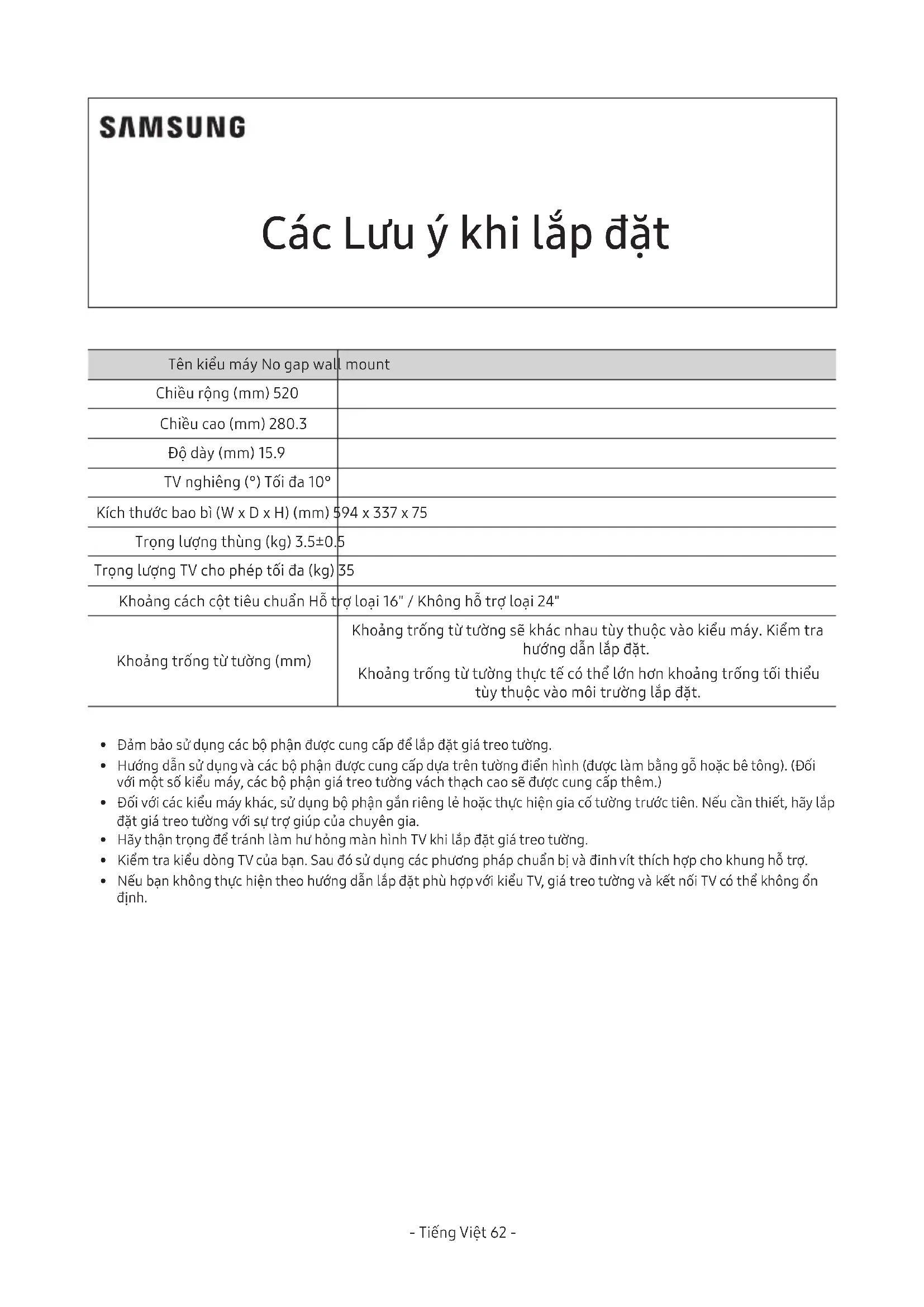 - Tiếng Việt 62 - - Tiếng Việt 63 - Các Lưu ý khi lắp đặt Tên kiểu máy No gap wall mount Chiều rộng (mm) 520 Chiều cao (mm) 280.3 Độ dày (mm) 15.9 TV nghiêng (°) Tối đa 10° Kích thước bao bì (W x D x H) (mm) 594 x 337 x 75 Trọng lượng thùng (kg) 3.5±0.5 Trọng lượng TV cho phép tối đa (kg) 35 Khoảng cách cột tiêu chuẩn Hỗ trợ loại 16" / Không hỗ trợ loại 24" Khoảng trống từ tường (mm) Khoảng trống từ tường sẽ khác nhau tùy thuộc vào kiểu máy. Kiểm tra hướng dẫn lắp đặt. Khoảng trống từ tường thực tế có thể lớn hơn khoảng trống tối thiểu tùy thuộc vào môi trường lắp đặt.