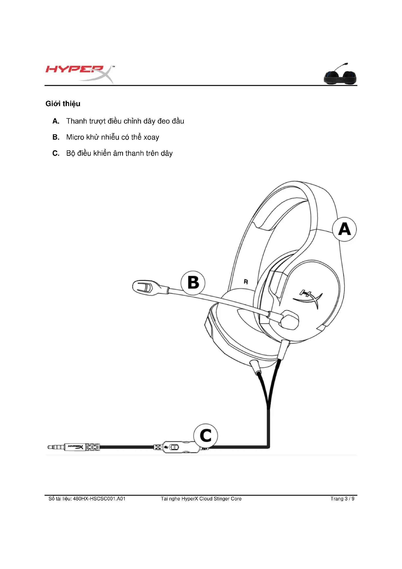 A. Thanh trượt điều chỉnh dây đeo đu B. Micro khử nhiễu có thể xoay C. B điều khiển âm thanh trên dâySố tài liệu: 480HX-HSCSC001.A01 Tai nghe HyperX Cloud Stinger Core Trang 4 / 9