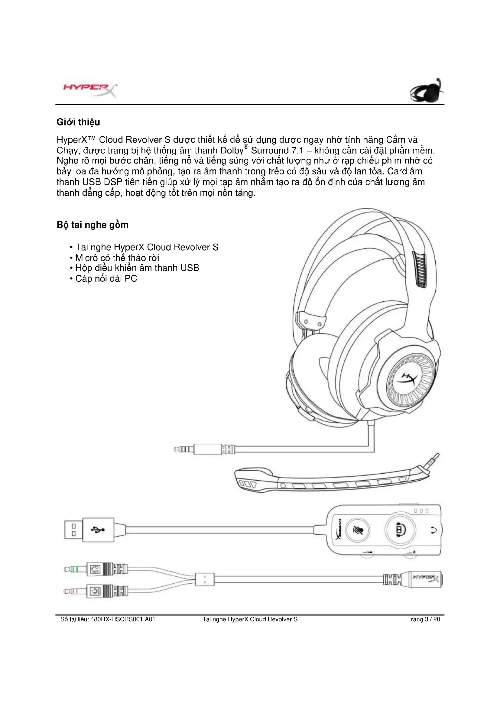 - Độ nhạy: -40dBV (0dB=1V/Pa,1kHz)Số tài liệu: 480HX-HSCRS001.A01 Tai nghe HyperX Cloud Revolver S Trang 5 / 20 Khái quát A. Khung thép chắc chắn B. Dây đeo qua đầu C. Micrô khử nhiễu có thể tháo rời D. Cáp đi kèm với giắc cắm 3,5mm 4 chấu (1m) E. Hộp điều khiển âm thanh USB F. Cáp nối dài PCSố tài liệu: 480HX-HSCRS001.A01 Tai nghe HyperX Cloud Revolver S Trang 6 / 20 Hoạt động của hộp điều khiển âm thanh USB Hộp điều khiển âm thanh USB có những đặc điểm sau: