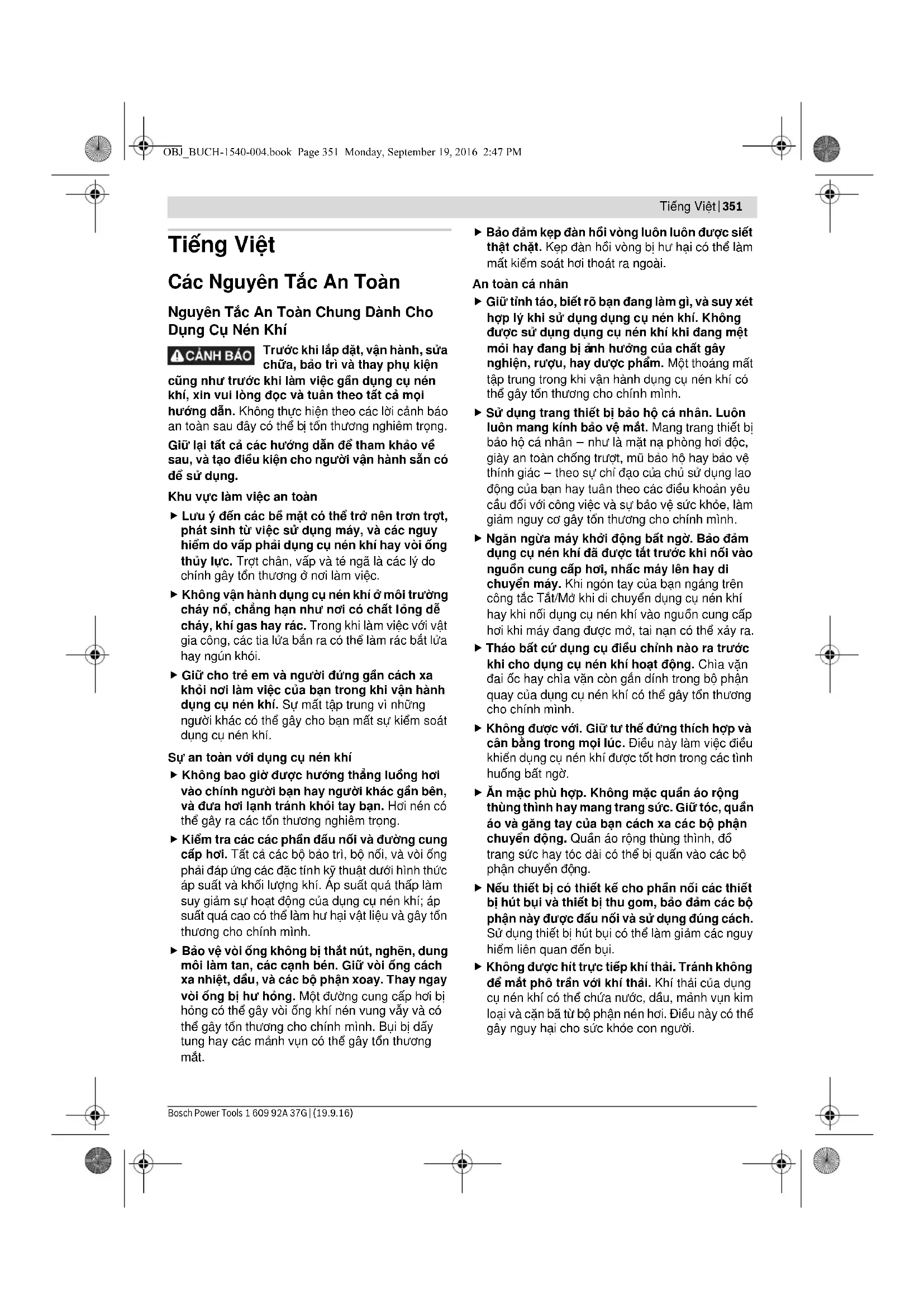 Floor Jl. Let. Jend. TB Simatupang II S/06 Jakarta Selatan 12960 Indonesia Tel.: (021) 3005 6565 Fax: (021) 3005 5801 E-Mail: boschpowertools@id.bosch.com www.bosch-pt.co.id Cara membuang Perkakas pakai udara bertekanan, aksesori dan kemasan sebaiknya didaur ulangkan sesuai dengan upaya untuk melindungi lingkungan hidup. Buangkan bahan-bahan pelumas dan pembersih sesuai dengan upaya untuk melindungi lingkungan hidup. Taatilah peraturan-peraturan yang berlaku. Janganlah membuang lamela-lamela turbin secara sembarangan! Lamela-lamela turbin mengandung teflon. Janganlah memanaskannya sampai lebih dari 400 °C, karena bisa terjadi uap-uap yang merugikan kesehatan. Jika perkakas pakai udara bertekanan milik Anda tidak bisa digunakan lagi, serahkannya kepada satu pusat pendaur ulangan atau kepada agen penjualan, misalnya di satu Service Center Bosch yang resmi. Perubahan dapat terjadi tanpa pemberitahuan sebelumnya. OBJ_BUCH-1540-004.book Page 350 Monday, September 19, 2016 2:47 PMTiếng Việt | 351 Bosch Power Tools 1 609 92A 37G | (19.9.16) Tiếng Việt Các Nguyên Tắc An Toàn Nguyên Tắc An Toàn Chung Dành Cho Dụng Cụ Nén Khí Trước khi lắp đặt, vận hành, sửa chữa, bảo trì và thay phụ kiện cũng như trước khi làm việc gần dụng cụ nén khí, xin vui lòng đọc và tuân theo tất cả mọi hướng dẫn. Không thực hiện theo các lời cảnh báo an toàn sau đây có thể bị tổn thương nghiêm trọng. Giữ lại tất cả các hướng dẫn để tham khảo về sau, và tạo điều kiện cho người v ận hành sẵn có để sử dụng. Khu vực làm việc an toàn Lưu ý đến các bề mặt có thể trở nên trơn trợt, phát sinh từ việc sử dụng máy, và các nguy hiểm do vấp phải dụng cụ nén khí hay vòi ống thủy lực. Trợt chân, vấp và té ngã là các lý do chính gây tổn thương ở nơi làm việc. Không vận hành dụng cụ nén khí ở môi trường cháy nổ, chẳng hạn như nơi có chất l ỏng dễ cháy, khí gas hay rác. Trong khi làm việc với vật gia công, các tia lửa bắn ra có thể làm rác bắt lửa hay ngún khói. Giữ cho trẻ em và người đứng gần cách xa khỏi nơi làm việc của bạn trong khi vận hành dụng cụ nén khí. Sự mất tập trung vì những người khác có thể gây cho bạn mất sự kiểm soát dụng cụ nén khí. Sự an toàn với dụng cụ nén khí Không bao giờ được hướng thẳng luồ ng hơi vào chính người bạn hay người khác gần bên, và đưa hơi lạnh tránh khỏi tay bạn. Hơi nén có thể gây ra các tổn thương nghiêm trọng. Kiểm tra các các phần đấu nối và đường cung cấp hơi. Tất cả các bộ bảo trì, bộ nối, và vòi ống phải đáp ứng các đặc tính kỹ thuật dưới hình thức áp suất và khối lượng khí. Áp suất quá thấp làm suy giảm sự hoạ t động của dụng cụ nén khí; áp suất quá cao có thể làm hư hại vật liệu và gây tổn thương cho chính mình. Bảo vệ vòi ống không bị thắt nút, nghẽn, dung môi làm tan, các cạnh bén. Giữ vòi ống cách xa nhiệt, dầu, và các bộ phận xoay. Thay ngay vòi ống bị hư hỏng. Một đường cung cấp hơi bị hỏng có thể gây vòi ống khí nén vung vẫy và có thể gây tổn thương cho chính mình. Bụi bị dấy tung hay các mả nh vụn có thể gây tổn thương mắt. Bảo đảm kẹp đàn hồi vòng luôn luôn được siết thật chặt. Kẹp đàn hồi vòng bị hư hại có thể làm mất kiểm soát hơi thoát ra ngoài. An toàn cá nhân Giữ tỉnh táo, biết rõ bạn đang làm gì, và suy xét hợp lý khi sử dụng dụng cụ nén khí. Không được sử dụng dụng cụ nén khí khi đang mệt mỏi hay đang bị ả nh hưởng của chất gây nghiện, rượu, hay dược phẩm. Một thoáng mất tập trung trong khi vận hành dụng cụ nén khí có thể gây tổn thương cho chính mình. Sử dụng trang thiết bị bảo hộ cá nhân. Luôn luôn mang kính bảo vệ mắt. Mang trang thiết bị bảo hộ cá nhân – như là mặt nạ phòng hơi độc, giày an toàn chống trượt, mũ bảo hộ hay bảo vệ thính giác – theo sự chỉ đạo củ a chủ sử dụng lao động của bạn hay tuân theo các điều khoản yêu cầu đối với công việc và sự bảo vệ sức khỏe, làm giảm nguy cơ gây tổn thương cho chính mình. Ngăn ngừa máy khởi động bất ngờ. Bảo đảm dụng cụ nén khí đã được tắt trước khi nối vào nguồn cung cấp hơi, nhấc máy lên hay di chuyển máy. Khi ngón tay của bạn ngáng trên công tắc Tắ t/Mở khi di chuyển dụng cụ nén khí hay khi nối dụng cụ nén khí vào nguồn cung cấp hơi khi máy đang được mở, tai nạn có thể xảy ra. Tháo bất cứ dụng cụ điều chỉnh nào ra trước khi cho dụng cụ nén khí hoạt động. Chìa vặn đai ốc hay chìa vặn còn gắn dính trong bộ phận quay của dụng cụ nén khí có thể gây tổn thương cho chính mình. Không được với. Giữ tư th ế đứng thích hợp và cân bằng trong mọi lúc. Điều này làm việc điều khiển dụng cụ nén khí được tốt hơn trong các tình huống bất ngờ. Ăn mặc phù hợp. Không mặc quần áo rộng thùng thình hay mang trang sức. Giữ tóc, quần áo và găng tay của bạn cách xa các bộ phận chuyển động. Quần áo rộng thùng thình, đồ trang sức hay tóc dài có thể bị quấn vào các bộ phận chuyển độ ng. Nếu thiết bị có thiết kế cho phần nối các thiết bị hút bụi và t