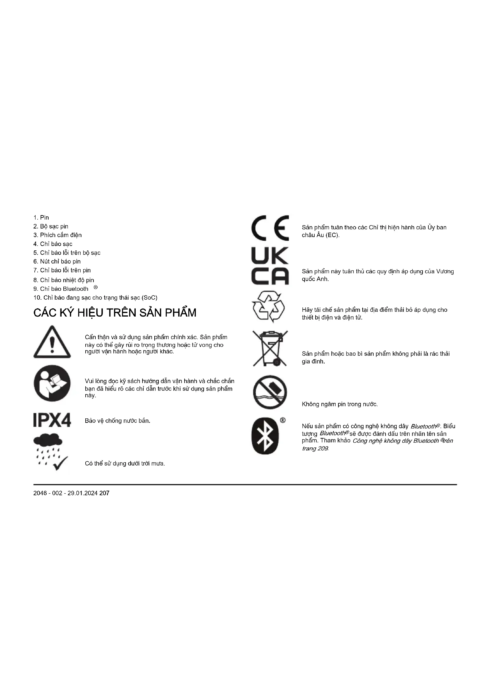 CÁC KÝ HIỆU TRÊN SẢN PHẨM Cẩn thận và sử dụng sản phẩm chính xác. Sản phẩm này có thể gây rủi ro trọng thương hoặc tử vong cho người vận hành hoặc người khác. Vui lòng đọc kỹ sách hướng dẫn vận hành và chắc chắn bạn đã hiểu rõ các chỉ dẫn trước khi sử dụng sản phẩm này. Bảo vệ chống nước bắn. Có thể sử dụng dưới trời mưa. Sản phẩm tuân theo các Chỉ thị hiện hành của Ủy ban châu Âu (EC). Sản phẩm này tuân thủ các quy định áp dụng của Vương quốc Anh. Hãy tái chế sản phẩm tại địa điểm thải bỏ áp dụng cho thiết bị điện và điện tử. Sản phẩm hoặc bao bì sản phẩm không phải là rác thải gia đình. Không ngâm pin trong nước. Nếu sản phẩm có công nghệ không dây Bluetooth