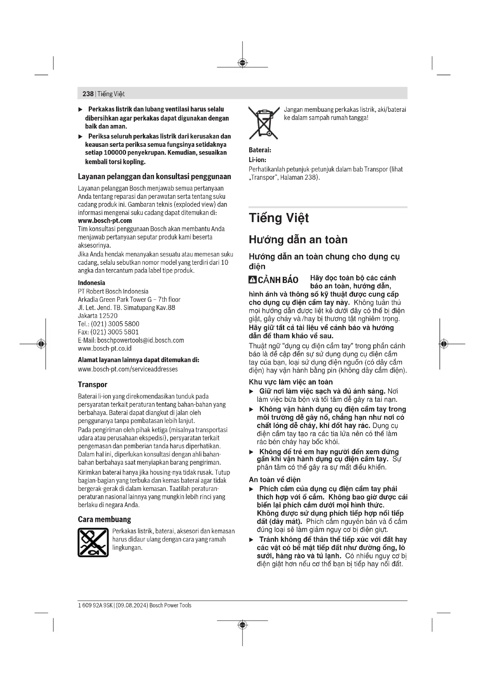 Hãy đọc toàn bộ các cảnh báo an toàn, hướng dẫn, hình ảnh và thông số kỹ thuật được cung cấp cho dụng cụ điện cầm tay này. Không tuân thủ mọi hướng dẫn được liệt kê dưới đây có thể bị điện giật, gây cháy và /hay bị thương tật nghiêm trọng. Hãy giữ tất cả tài liệu về cảnh báo và hướng dẫn để tham khảo về sau. Thuật ngữ "dụng cụ điện cầm tay" trong phần cảnh báo là đề cập đến sự sử dụng dụng cụ điện cầm tay của bạn, loại sử dụng điện nguồn (có dây cắm điện) hay vận hành bằng pin (không dây cắm điện). Khu vực làm việc an toàn u Giữ nơi làm việc sạch và đủ ánh sáng. Nơi làm việc bừa bộn và tối tăm dễ gây ra tai nạn. u Không vận hành dụng cụ điện cầm tay trong môi trường dễ gây nổ, chẳng hạn như nơi có chất lỏng dễ cháy, khí đốt hay rác. Dụng cụ điện cầm tay tạo ra các tia lửa nên có thể làm rác bén cháy hay bốc khói. u Không để trẻ em hay người đến xem đứng gần khi vận hành dụng cụ điện cầm tay. Sự phân tâm có thể gây ra sự mất điều khiển. An toàn về điện u Phích cắm của dụng cụ điện cầm tay phải thích hợp với ổ cắm. Không bao giờ được cải biến lại phích cắm dưới mọi hình thức. Không được sử dụng phích tiếp hợp nối tiếp đất (dây mát). Phích cắm nguyên bản và ổ cắm đúng loại sẽ làm giảm nguy cơ bị điện giựt. u Tránh không để thân thể tiếp xúc với đất hay các vật có bề mặt tiếp đất như đường ống, lò sưởi, hàng rào và tủ lạnh. Có nhiều nguy cơ bị điện giật hơn nếu cơ thể bạn bị tiếp hay nối đất. 1 609 92A 9SK | (09.08.2024) Bosch Power ToolsTiếng Việt | 239 u Không được để dụng cụ điện cầm tay ngoài mưa hay ở tình trạng ẩm ướt. Nước vào máy sẽ làm tăng nguy cơ bị điện giật. u Không được lạm dụng dây dẫn điện. Không bao giờ được nắm dây dẫn để xách, kéo hay rút phích cắm dụng cụ điện cầm tay. Không để dây gần nơi có nhiệt độ cao, dầu nhớt, vật nhọn bén và bộ phận chuyển động. Làm hỏng hay cuộn rối dây dẫn làm tăng nguy cơ bị điện giật. u Khi sử dụng dụng cụ điện cầm tay ngoài trời, dùng dây nối thích hợp cho việc sử dụng ngoài trời. Sử dụng dây nối thích hợp cho việc sử dụng ngoài trời làm giảm nguy cơ bị điện giật. u Nếu việc sử dụng dụng cụ điện cầm tay ở nơi ẩm ướt là không thể tránh được, dùng thiết bị ngắt mạch tự động (RCD) bảo vệ nguồn. Sử dụng thiết bị ngắt mạch tự động RCD làm giảm nguy cơ bị điện giựt. An toàn cá nhân u Hãy tỉnh táo, biết rõ mình đang làm gì và hãy sử dụng ý thức khi vận hành dụng cụ điện cầm tay. Không sử dụng dụng cụ điện cầm tay khi đang mệt mỏi hay đang bị tác động do chất gây nghiện, rượu hay dược phẩm gây ra. Một thoáng mất tập trung khi đang vận hành dụng cụ điện cầm tay có thể gây thương tích nghiêm trọng cho bản thân. u Sử dụng trang bị bảo hộ cá nhân. Luôn luôn đeo kính bảo vệ mắt. Trang bị bảo hộ như khẩu trang, giày chống trợt, nón bảo hộ, hay dụng cụ bảo vệ tai khi được sử dụng đúng nơi đúng chỗ sẽ làm giảm nguy cơ thương tật cho bản thân. u Phòng tránh máy khởi động bất ngờ. Bảo đảm công tắc máy ở vị trí tắt trước khi cắm vào nguồn điện và/hay lắp pin vào, khi nhấc máy lên hay khi mang xách máy. Ngáng ngón tay vào công tắc máy để xách hay kích hoạt dụng cụ điện cầm tay khi công tắc ở vị trí mở dễ dẫn đến tai nạn. u Lấy mọi chìa hay khóa điều chỉnh ra trước khi mở điện dụng cụ điện cầm tay. Khóa hay chìa còn gắn dính vào bộ phận quay của dụng cụ điện cầm tay có thể gây thương tích cho bản thân. u Không rướn người. Luôn luôn giữ tư thế đứng thích hợp và thăng bằng. Điều này tạo cho việc điều khiển dụng cụ điện cầm tay tốt hơn trong mọi tình huống bất ngờ. u Trang phục thích hợp. Không mặc quần áo rộng lùng thùng hay mang trang sức. Giữ tóc và quần áo xa khỏi các bộ phận chuyển động. Quần áo rộng lùng thùng, đồ trang sức hay tóc dài có thể bị cuốn vào các bộ phận chuyển động. u Nếu có các thiết bị đi kèm để nối máy hút bụi và các phụ kiện khác, bảo đảm các thiết bị này được nối và sử dụng tốt. Việc sử dụng các thiết bị gom hút bụi có thể làm giảm các độc hại liên quan đến bụi gây ra. u Không để thói quen do sử dụng thường xuyên dụng cụ khiến bạn trở nên chủ quan và bỏ qua các quy định an toàn dụng cụ. Một hành vi bất cẩn có thể gây ra thương tích nghiêm trọng chỉ trong tíc tắc. Sử dụng và bảo dưỡng dụng cụ điện cầm tay u Không được ép máy. Sử dụng dụng cụ điện cầm tay đúng loại theo đúng ứng dụng của bạn. Dụng cụ điện cầm tay đúng chức năng sẽ làm việc tốt và an toàn hơn theo đúng tiến độ mà máy được thiết kế. u Không sử dụng dụng cụ điện cầm tay nếu như công tắc không tắt và mở được. Bất kỳ dụng cụ điện cầm tay nào mà không th