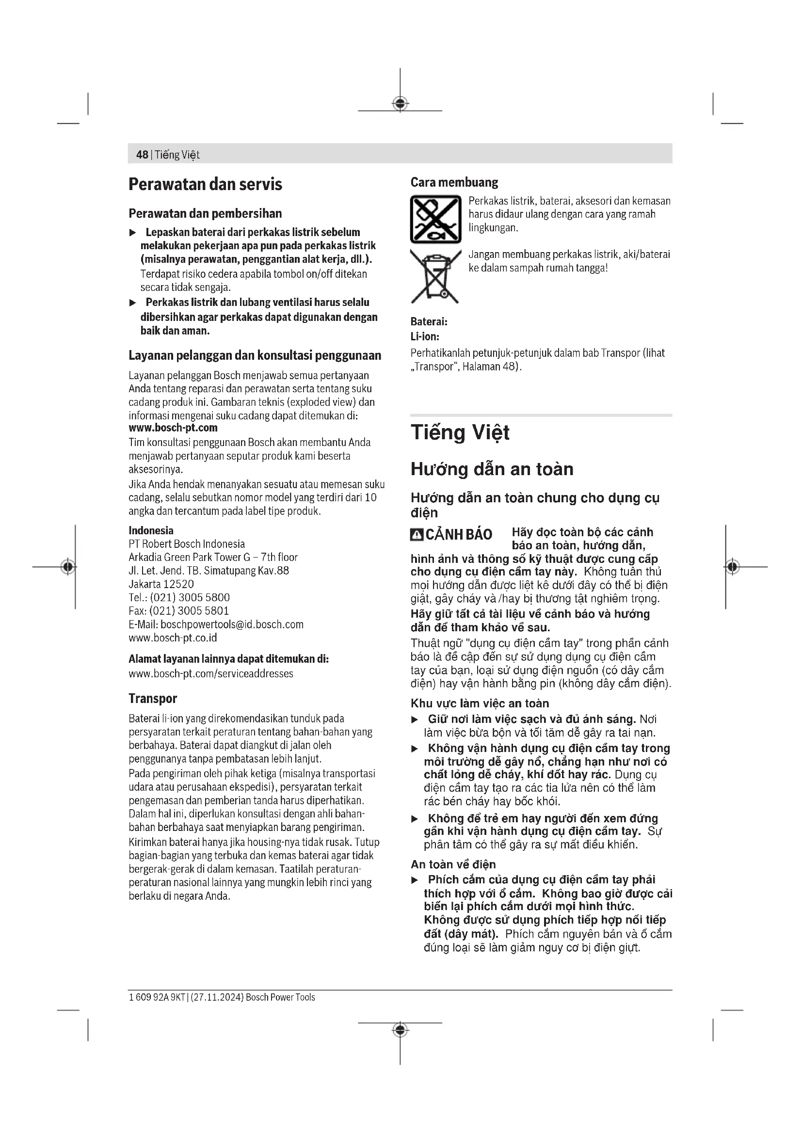 Lưu ý: Đồ họa chọn trước chế độ chỉ mang tính chất tham khảo và không thể hiện các giá trị thực tế. 1 609 92A 9KT | (27.11.2024) Bosch Power ToolsTiếng Việt | 53 Bảo Dưỡng và Bảo Quản Bảo Dưỡng Và Làm Sạch u Trước khi tiến hành bất cứ công việc gì với máy (ví dụ: bảo dưỡng, thay dụng cụ v.v..) tháo pin ra khỏi dụng cụ điện. Có nguy cơ gây thương tích khi vô tình làm kích hoạt công tắc bật/tắt. u Để được an toàn và máy hoạt động đúng chức năng, luôn luôn giữ máy và các khe thông gió được sạch. Dịch vụ hỗ trợ khách hàng và tư vấn sử dụng Bộ phận phục vụ hàng sau khi bán của chúng tôi trả lời các câu hỏi liên quan đến việc bảo dưỡng và sửa chữa các sản phẩm cũng như phụ tùng thay thế của bạn. Sơ đồ mô tả và thông tin về phụ tùng thay thế cũng có thể tra cứu theo dưới đây: www.bosch-pt.com Đội ngũ tư vấn sử dụng của Bosch sẽ giúp bạn giải đáp các thắc mắc về sản phẩm và phụ kiện. Trong tất cả các phản hồi và đơn đặt phụ tùng, xin vui lòng luôn luôn nhập số hàng hóa 10 chữ số theo nhãn của hàng hóa. Việt Nam CN CÔNG TY TNHH BOSCH VIỆT NAM TẠI TP.HCM Tầng 14, Ngôi Nhà Đức, 33 Lê Duẩn Phướng Bến Nghé, Quận 1, Thành Phố Hồ Chí Minh Tel.: (028) 6258 3690 Fax: (028) 6258 3692 - 6258 3694 Hotline: 1900 9988 50 Email: tuvankhachhang-pt@vn.bosch.com www.bosch-pt.com.vn Xem thêm địa chỉ dịch vụ tại: www.bosch-pt.com/serviceaddresses Vận chuyển Pin Li-Ion được khuyến nghị là đối tượng phải tuân theo các qui định của Pháp Luật về Hàng Hóa Nguy Hiểm. Người sử dụng có thể vận chuyển pin hợp khối bằng đường bộ mà không cần thêm yêu cầu nào khác. Khi được vận chuyển thông qua bên thứ ba (vd. vận chuyển bằng đường hàng không hay đại lý giao nhận), phải tuân theo các yêu cầu đặc biệt về đóng gói và dán nhãn. Phải tham vấn chuyên gia về hàng hóa nguy hiểm khi chuẩn bị gói hàng. Chỉ gửi pin hợp khối khi vỏ ngoài không bị hư hỏng. Dán băng keo hay che kín các điểm tiếp xúc hở và đóng gói pin hợp khối theo cách sao cho pin không thể xê dịch khi nằm trong bao bì. Ngoài ra, xin vui lòng chấp hành các qui định chi tiết có thể được bổ sung thêm của quốc gia. Sự thải bỏ Dụng cụ điện, pin, phụ kiện và bao bì cần được tái sử dụng theo quy định về môi trường. Bạn không được ném dụng cụ điện và pin vào thùng rác gia đình! Pin/ắc quy: Li-Ion: Tuân thủ những hướng dẫn trong phần vận chuyển (xem „Vận chuyển“, Trang53). Bosch Power Tools 1 609 92A 9KT | (27.11.2024)54 | يبرع
