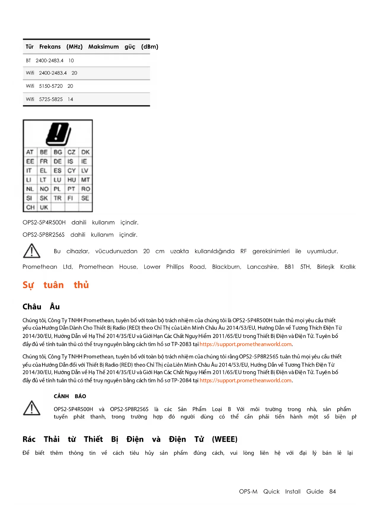Promethean Limited olarak, yalnızca kendi sorumluluğumuz altında OPS2-5P8R256S'nin Avrupa Birliği Yönergeleri 2014/53/EU Radyo Ekipmanlar Yönetmeliği'ne (RED), 2014/30/EU Elektromanyetik Uyumluluk Yönetmeliği'ne, 2014/35/EU Düşük Voltaj Yönetmeliği'ne ve 2011/65/EU Elektrik ve Elektronik Ekipmanları Tehlikeli Maddeler Kısıtlamaları'na uygun olduğunu beyan ederiz. Tam Uygunluk Beyanı TP-2084 aranarak https://support.prometheanworld.com adresinde bulunabilir. 83 OPS-M Quick Install GuideTür Frekans (MHz) Maksimum güç (dBm) BT 2400-2483.4 10 Wifi 2400-2483.4 20 Wifi 5150-5720 20 Wifi 5725-5825 14 OPS2-5P4R500H dahili kullanım içindir. OPS2-5P8R256S dahili kullanım içindir. Bu cihazlar, vücudunuzdan 20 cm uzakta kullanıldığında RF gereksinimleri ile uyumludur. Promethean Ltd, Promethean House, Lower Phillips Road, Blackburn, Lancashire, BB1 5TH, Birleşik Krallık Sự tuân thủ Châu Âu Chúng tôi, Công Ty TNHH Promethean, tuyên bố với toàn bộ trách nhiệm của chúng tôi là OPS2-5P4R500H tuân thủ mọi yêu cầu thiết yếu củaHướng Dẫn Dành Cho Thiết Bị Radio (RED) theo Chỉ Thị của Liên Minh Châu Âu 2014/53/EU, Hướng Dẫn về Tương Thích Điện Từ 2014/30/EU, Hướng Dẫn về Hạ Thế 2014/35/EU và Giới Hạn Các Chất Nguy Hiểm 2011/65/EU trong Thiết Bị Điện vàĐiện Tử. Tuyên bố đầy đủ về tính tuân thủ có thể truy nguyên bằng cách tìm hồ sơ TP-2083 tại https://support.prometheanworld.com. Chúng tôi, Công Ty TNHH Promethean, tuyên bố với toàn bộ trách nhiệm của chúng tôi rằng OPS2-5P8R256S tuân thủ mọi yêu cầu thiết yếu củaHướng Dẫn đối với Thiết Bị Radio (RED) theo Chỉ Thị củaLiên Minh Châu Âu 2014/53/EU, Hướng Dẫn về Tương Thích Điện Từ 2014/30/EU, Hướng Dẫn về Hạ Thế 2014/35/EU và Giới Hạn Các Chất Nguy Hiểm 2011/65/EU trong Thiết Bị Điện vàĐiện Tử. Tuyên bố đầy đủ về tính tuân thủ có thể truy nguyên bằng cách tìm hồ sơ TP-2084 tại https://support.prometheanworld.com.
