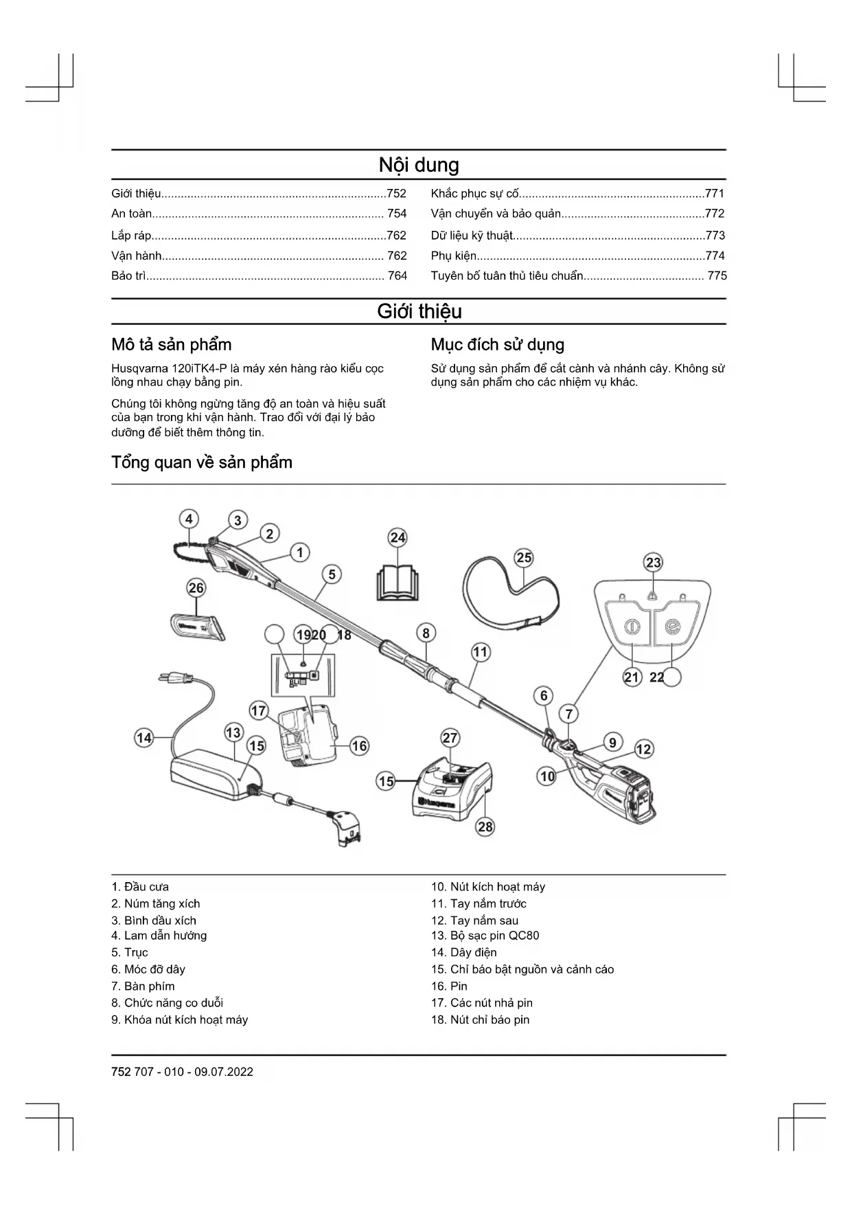 - Tuyên bố tuân thủ tiêu chuẩn Giới thiệu Mô tả sản phẩm Husqvarna 120iTK4-P là máy xén hàng rào kiểu cọc lồng nhau chạy bằng pin. Chúng tôi không ngừng tăng độ an toàn và hiệu suất của bạn trong khi vận hành. Trao đổi với đại lý bảo dưỡng để biết thêm thông tin. Mục đích sử dụng Sử dụng sản phẩm để cắt cành và nhánh cây. Không sử dụng sản phẩm cho các nhiệm vụ khác. Tổng quan về sản phẩm p. 775