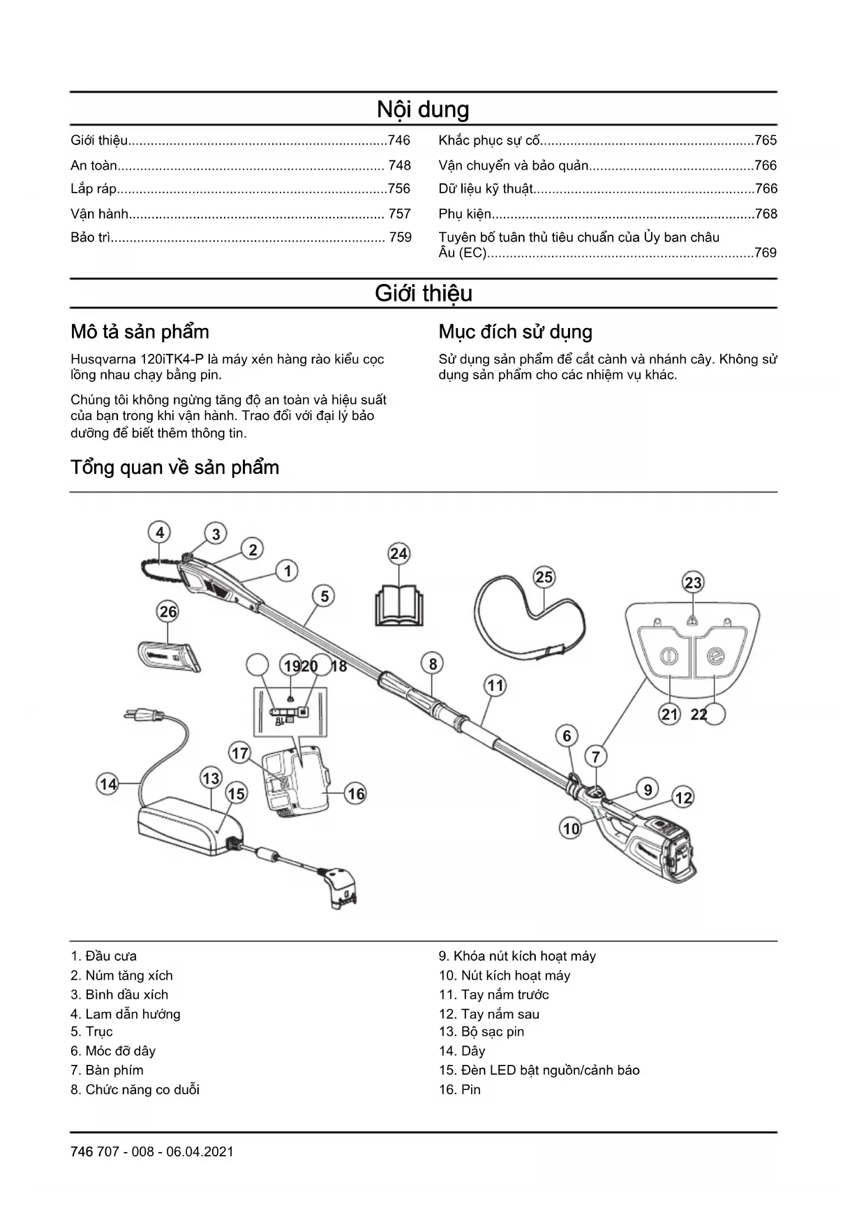 - Tuyên bố tuân thủ tiêu chuẩn của Ủy ban châu Âu (EC) Giới thiệu Mô tả sản phẩm Husqvarna 120iTK4-P là máy xén hàng rào kiểu cọc lồng nhau chạy bằng pin. Chúng tôi không ngừng tăng độ an toàn và hiệu suất của bạn trong khi vận hành. Trao đổi với đại lý bảo dưỡng để biết thêm thông tin. Mục đích sử dụng Sử dụng sản phẩm để cắt cành và nhánh cây. Không sử dụng sản phẩm cho các nhiệm vụ khác. Tổng quan về sản phẩm p. 769