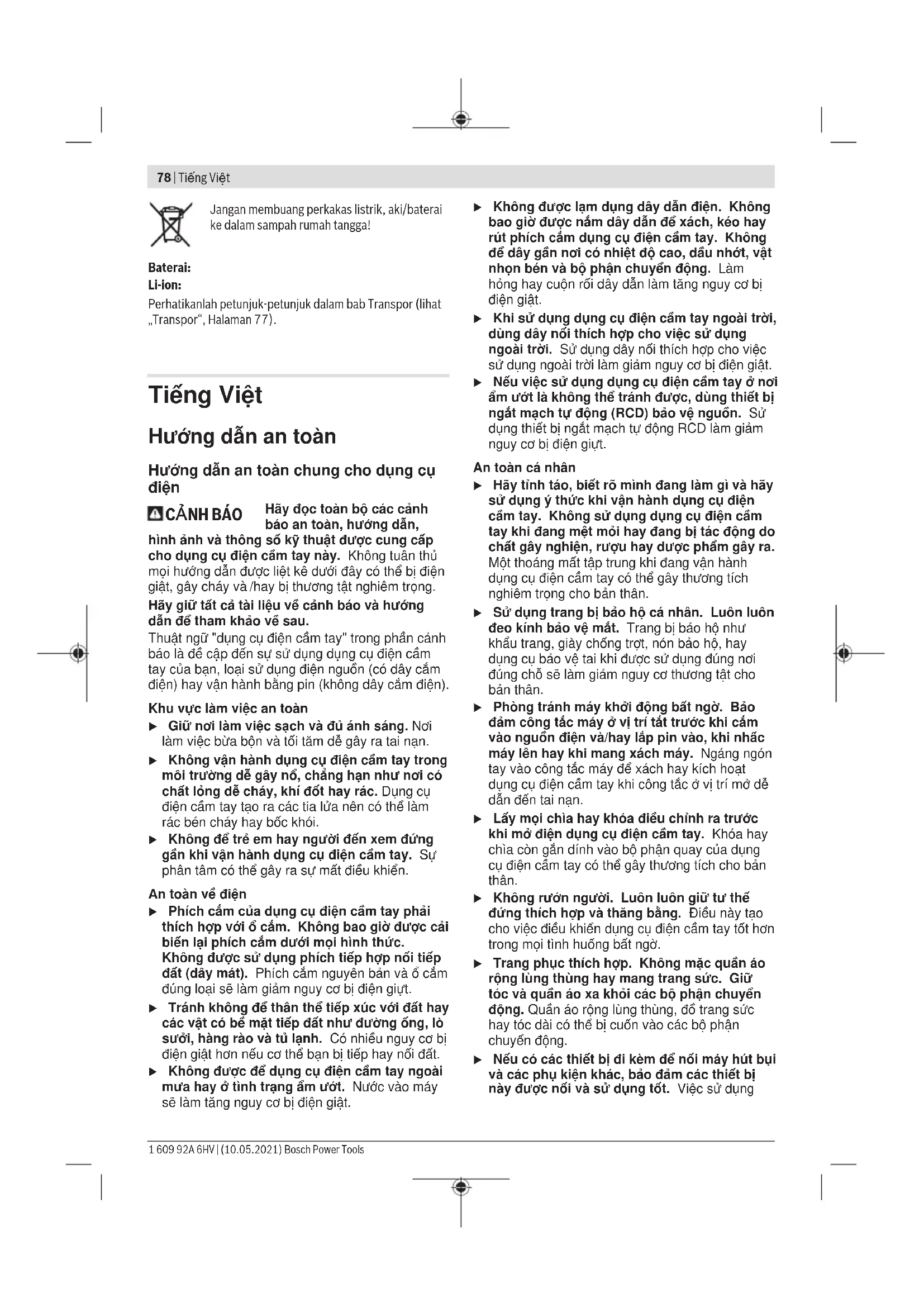 cần có ứng dụng Bosch "Bosch Toolbox". Tải ứng dụng qua kho ứng dụng tương ứng (AppleApp Store, Google Play Store). Chọn thuộc tính subitem trong ứng dụng "My Tools". Màn hình hiển thị của thiết bị đầu cuối di động cho biết các bước tiếp theo để kết nối dụng cụ điện với thiết bị đầu cuối. Sau khi kết nối tới thiết bị đầu cuối di động được tạo ra, sẽ có các chức năng sau: – Đăng ký và cá nhân hóa – Kiểm tra trạng thái, phát các thông báo cảnh báo – Các thông tin và cài đặt chung – Quản lý – Cài đặt của mức tốc độ – Cài đặt chế độ làm việc Bảo Dưỡng và Bảo Quản Bảo Dưỡng Và Làm Sạch u Thường xuyên làm sạch các khe thông gió của dụng cụ điện. Quạt gió môtơ sẽ kéo bụi nằm trong vỏ máy ra và sự tích tụ quá nhiều bột kim loại có thể gây nên các nguy hiểm về điện. u Trước khi tiến hành bất cứ công việc gì với máy (ví dụ bảo dưỡng, thay dụng cụ v.v..) cũng như khi vận chuyển hay lưu kho, tháo pin ra khỏi dụng cụ điện. Có nguy cơ gây thương tích khi vô tình làm kích hoạt công tắc Tắt/Mở. u Để được an toàn và máy hoạt động đúng chức năng, luôn luôn giữ máy và các khe thông gió được sạch. Dịch vụ hỗ trợ khách hàng và tư vấn sử dụng Bộ phận phục vụ hàng sau khi bán của chúng tôi trả lời các câu hỏi liên quan đến việc bảo dưỡng và sửa chữa các sản phẩm cũng như phụ tùng thay thế của bạn. Sơ đồ mô tả và thông tin về phụ tùng thay thế cũng có thể tra cứu theo dưới đây: www.bosch-pt.com Đội ngũ tư vấn sử dụng của Bosch sẽ giúp bạn giải đáp các thắc mắc về sản phẩm và phụ kiện. Trong tất cả các phản hồi và đơn đặt phụ tùng, xin vui lòng luôn luôn nhập số hàng hóa 10 chữ số theo nhãn của hàng hóa. Việt Nam CN CÔNG TY TNHH BOSCH VIÊT NAM TAI TP.HCM Tâng 14, Ngôi Nhà Đức, 33 Lê Duẩn Phương Bến Nghé, Quân 1, Thanh Phô Hô Chi Minh Tel.: (028) 6258 3690 Fax: (028) 6258 3692 - 6258 3694 Hotline: (028) 6250 8555 Email: tuvankhachhang-pt@vn.bosch.com www.bosch-pt.com.vn www.baohanhbosch-pt.com.vn Xem thêm địa chỉ dịch vụ tại: www.bosch-pt.com/serviceaddresses Vận chuyển Pin có chứa Li-Ion là đối tượng phải tuân theo các qui định của Pháp Luật về Hàng Hóa Nguy Hiểm. Người sử dụng có thể vận chuyển pin hợp khối bằng đường bộ mà không cần thêm yêu cầu nào khác. Khi được vận chuyển thông qua bên thứ ba (vd. vận chuyển bằng đường hàng không hay đại lý giao nhận), phải tuân theo các yêu cầu đặc biệt về đóng gói và dán nhãn. Phải tham vấn chuyên gia về hàng hóa nguy hiểm khi chuẩn bị gói hàng. Chỉ gửi pin hợp khối khi vỏ ngoài không bị hư hỏng. Dán băng keo hay che kín các điểm tiếp xúc hở và đóng gói pin hợp khối theo cách sao cho pin không thể xê dịch khi nằm trong bao bì. Ngoài ra, xin vui lòng chấp hành các qui định chi tiết có thể được bổ sung thêm của quốc gia. Sự thải bỏ Dụng cụ điện, pin, phụ kiện và bao bì cần được tái sử dụng theo quy định về môi trường. Bạn không được ném dụng cụ điện và pin vào thùng rác gia đình! Pin/ắc quy: Li-Ion: Bosch Power Tools 1 609 92A 6HV | (10.05.2021)86 | Tiếng Việt Tuân thủ những hướng dẫn trong phần vận chuyển (xem „Vận chuyển“, Trang85). 1 609 92A 6HV | (10.05.2021) Bosch Power Toolsيبرع | 87