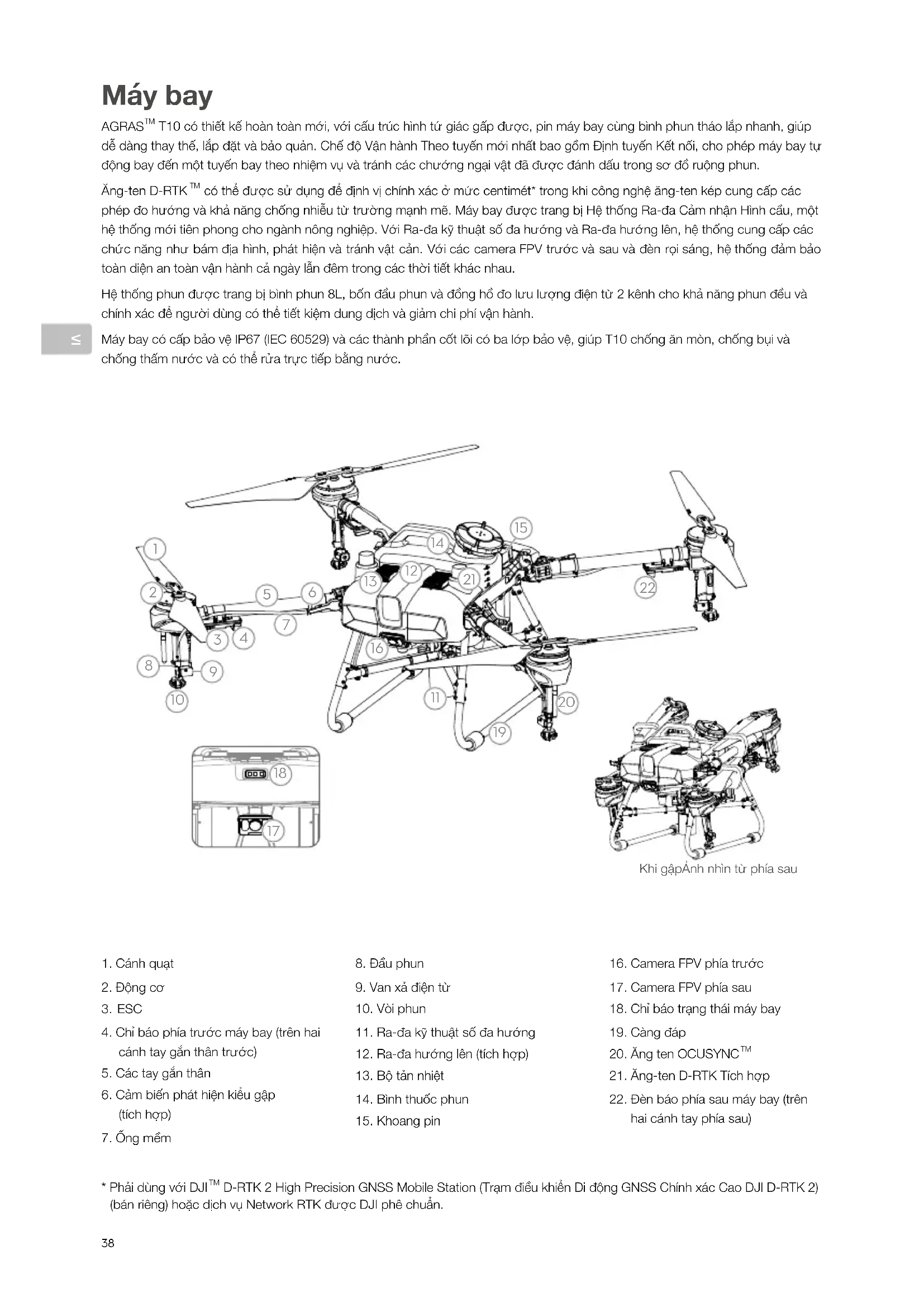 có thể được sử dụng để định vị chính xác ở mức centimét* trong khi công nghệ ăng-ten kép cung cấp các phép đo hướng và khả năng chống nhiễu từ trường mạnh mẽ. Máy bay được trang bị Hệ thống Ra-đa Cảm nhận Hình cầu, một hệ thống mới tiên phong cho ngành nông nghiệp. Với Ra-đa kỹ thuật số đa hướng và Ra-đa hướng lên, hệ thống cung cấp các chức năng như bám địa hình, phát hiện và tránh vật cản. Với các camera FPV trước và sau và đèn rọi sáng, hệ thống đảm bảo toàn diện an toàn vận hành cả ngày lẫn đêm trong các thời tiết khác nhau. Hệ thống phun được trang bị bình phun 8L, bốn đầu phun và đồng hồ đo lưu lượng điện từ 2 kênh cho khả năng phun đều và chính xác để người dùng có thể tiết kiệm dung dịch và giảm chi phí vận hành. Máy bay có cấp bảo vệ IP67 (IEC 60529) và các thành phần cốt lõi có ba lớp bảo vệ, giúp T10 chống ăn mòn, chống bụi và chống thấm nước và có thể rửa trực tiếp bằng nước.
