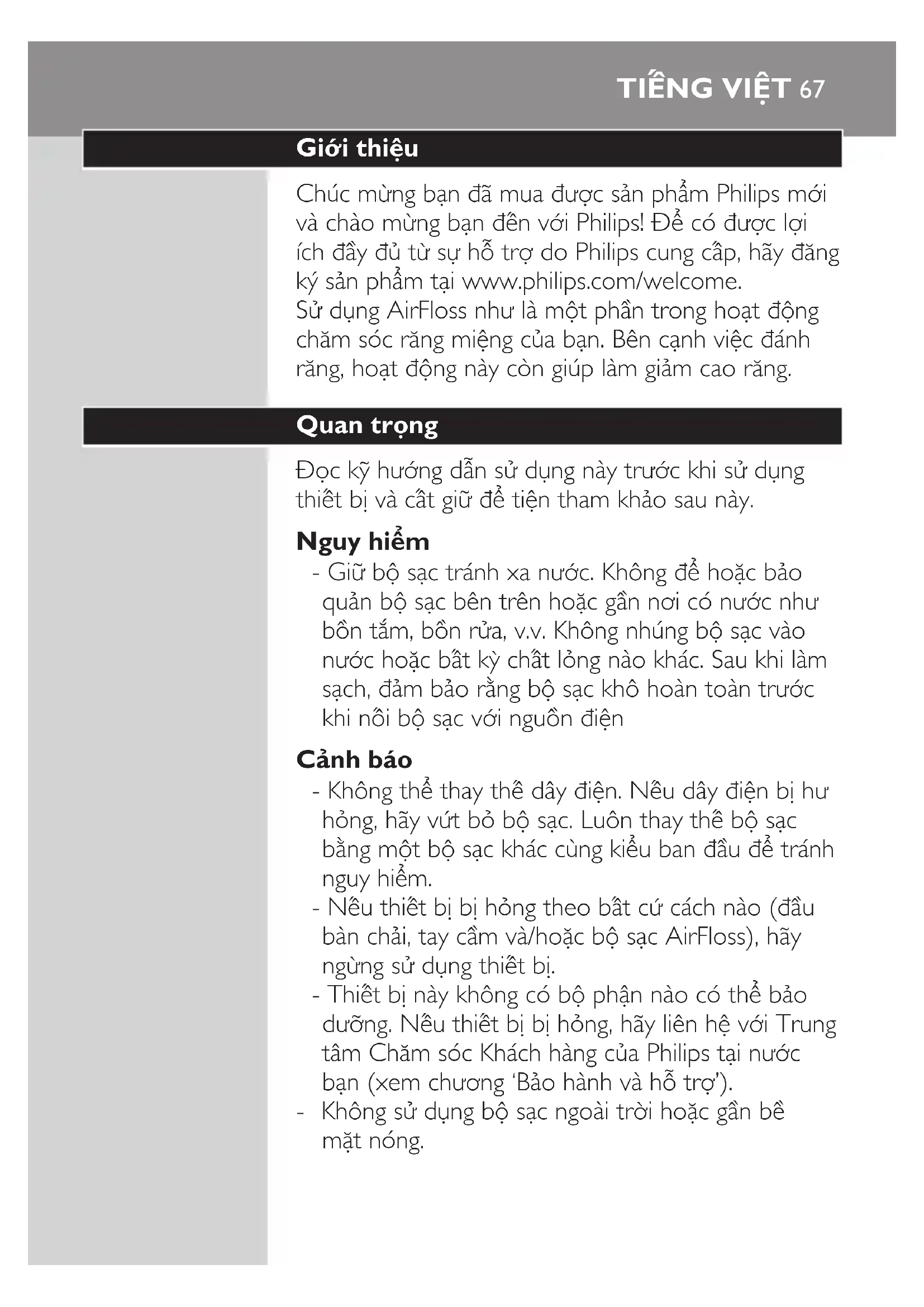 - Không thể thay thế dây điện. Nếu dây điện bị hư hỏng, hãy vứt bỏ bộ sạc. Luôn thay thế bộ sạc bằng một bộ sạc khác cùng kiểu ban đầu để tránh nguy hiểm. - Nếu thiết bị bị hỏng theo bất cứ cách nào (đầu bàn chải, tay cầm và/hoặc bộ sạc AirFloss), hãy ngừng sử dụng thiết bị. - Thiết bị này không có bộ phận nào có thể bảo dưỡng. Nếu thiết bị bị hỏng, hãy liên hệ với Trung tâm Chăm sóc Khách hàng của Philips tại nước bạn (xem chương ‘Bảo hành và hỗ trợ’). - Không sử dụng bộ sạc ngoài trời hoặc gần bề mặt nóng.