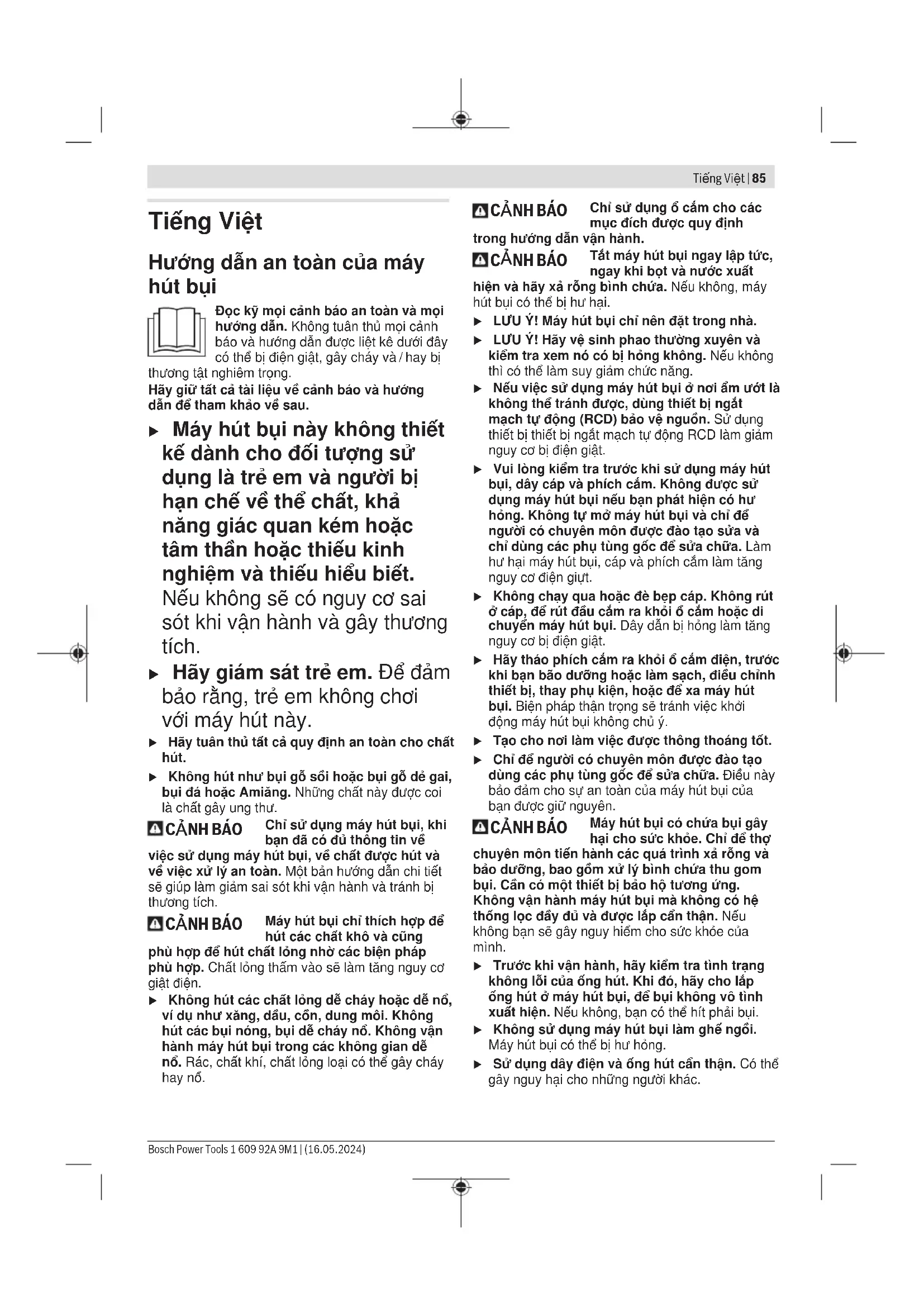 được đo với một cái ống hút Ø 35 và dài 3 m Các giá trị đã cho có hiệu lực cho điện thế danh định [U] 230V. Đối với điện thế thấp hơn và các loại máy dành riêng cho một số quốc gia, các giá trị này có thể thay đổi. Các giá trị có thể khác nhau tùy thuộc vào sản phẩm và tùy thuộc vào ứng dụng và điều kiện môi trường. Xem thêm thông tin chi tiết trên trang www.bosch-professional.com/wac. Tự động Khởi động-/Ngừng 3 601 J7C ... Điện thế danh định Công suất tối đa Công suất tối thiểu 1L0 240 V 1700 W 100 W 1K0/100/1E0/1H0 220–230 V 2050 W 100 W 1F0/180/1N0 220 V 950 W 100 W Chỉ số công suất nối cho phép của dụng cụ điện đã kết nối. Đối với các model của từng quốc gia cụ thể, các giá trị này có thể sai lệch. Vui lòng chú ý các thông số trên ổ cắm của máy hút bụi. Sự lắp vào u Hãy tháo phích cắm ra khỏi ổ cắm điện, trước khi bạn bão dưỡng hoặc làm sạch, điều chỉnh thiết bị, thay phụ kiện, hoặc để xa máy hút bụi. Biện pháp thận trọng sẽ tránh việc khởi động máy hút bụi không chủ ý. u Hãy tháo phích cắm ra khỏi ổ cắm điện, trước khi bạn bão dưỡng hoặc làm sạch, điều chỉnh thiết bị, thay phụ kiện, hoặc bảo quản máy hút bụi. Biện pháp thận trọng sẽ tránh việc khởi động máy hút bụi không chủ ý. Lắp phụ kiện hút (xemHìnhA) Vòi ống hút (15) được trang bị Clip-System, mà có thể được kết nối với phụ kiện hút (Bộ thích ứng hút (16), Vòi ống cong (17)). Gắn các đầu hút và ống hút – Cắm vòi ống cong (17) vào ống hút mềm (15) cho đến khi cả hai nút bấm (27) của ống hút mềm được gài vào phát ra tiếng. – Sau đó lắp phụ kiện muốn dùng (Đầu hút sàn, đầu hút nối, ống hút cứng v.v.) cố định vào vòi ống cong (17). – Để tháo ra, ấn các nút bấm (27) vào trong và kéo các bộ phận ra. Lắp cút nối ống hút (GAS12-25PL) – Cắm cút nối ống hút (16) vào ống hút mềm (15) cho đến khi cả hai nút bấm (27) của ống hút mềm được gài vào phát ra tiếng. – Để tháo ra, ấn các nút bấm (27) vào trong và kéo các bộ phận ra. Gắn Vòi Ống Hút Chức năng hút (xem hình B1) – Cắm đầu cắm ống (15) vào hốc cắm ống (3) và xoay theo hướng xoay đến khi dừng lại . Hướng dẫn: Khi hút, xuất hiện hiện tượng tĩnh điện trong ống mềm và các phụ kiện do sự ma sát của bụi mà người sử dụng có thể cảm nhận được sự phóng tích điện (phụ thuộc vào tác động của môi trường và độ nhạy cảm của cơ thể). Nói chung Bosch khuyên dùng một loại ống mềm (phụ kiện) chống tĩnh điện khi hút bụi mịn và các loại vật liệu khô. Chức năng xả (xem HìnhB2) u Máy hút bụi có chức năng xả. Không thổi khí xả vào khoảng trống. Chỉ sử dụng chức năng xả với ống mềm sạch. Bụi có thể gây nguy hại cho sức khỏe con người. Chỉ sử dụng ống thổi ra(34) (Phụ kiện) được hiển thị ở đây với cổng nối phù hợp cho chức năng thổi ra. Không được sử dụng ống hút giao kèm để thổi ra. – Bật máy hút bụi trước ít nhất 5s (GAS12-25: Công tắc Tắt/Mở(1) thành „On“;GAS12-25PL: Công tắc chọn chế độ hoạt động(1) thành biểu tượng „Hút“), để làm sạch ống hút mềm(15) có chứa bụi bặm lưu cữu. 1 609 92A 9M1 | (16.05.2024) Bosch Power ToolsTiếng Việt | 89 – Xoay ống hút mềm(15) theo hướng xoay cho đến hết rồi kéo ống ra khỏi hốc cắm ống(3). – Cắm ống thổi(34) vào hốc cắm ống(13) và xoay theo hướng xoay đến khi dừng lại . Tháo/lắp bộ lọc trước Bộ lọc trước(22) giữ lại bụi thô và nhờ đó làm tăng tuổi thọ của bộ lọc chính. Bạn phải tháo bộ lọc trước ra khỏi khoang chứa, nếu bạn muốn làm sạch bộ lọc chính. Cầm vào tay cầm của bộ lọc trước(22)(28) để tháo ra nhẹ nhàng. Tháo bộ lọc trước (xem hình D1) – Mở các nút thắt (9) và tháo thân nắp máy hút (10) (xem hình C). – Hãy lấy bộ lọc trước(22) bằng tay cầm ra(28) khỏi khoang chứa(7). Lắp bộ lọc trước (xem hình D2) – Lắp bộ lọc trước(22) với mũi tên theo hướng hốc cắm ống mềm(3) vào khoang chứa(7). – Đậy nắp trên cùng của máy hút bụi (10) và đóng các khóa (9). Tháo/lắp bộ lọc chính Tháo bộ lọc chính ra (xem hình E1) – Mở các nút thắt (9) và tháo thân nắp máy hút (10) (xem hình C). – Xoay giá đỡ bộ lọc (29) cho đến cữ chặn theo hướng xoay và tháo giá đỡ bộ lọc cùng với bộ lọc chính (20) ra khỏi thân nắp máy hút (10). Lắp bộ lọc chính (xem hình E2) – Đặt giá đỡ bộ lọc (29) cùng với bộ lọc chính (20) qua lưới lọc (30) và xoay giá đỡ bộ lọc (29) cho đến cữ chặn theo hướng mũi tên . – Đậy nắp trên cùng của máy hút bụi (10) và đóng các khóa (9). Lưu ý: Đảm bảo rằng bộ lọc luôn được lắp đúng. Điều này đặc biệt đúng nếu bạn đang hút bụi có hại. Tháo/lắp bộ lọc ướt Để giảm tải việc xử lý rác khi hút các hỗn hợp nước-chất rắn, máy hút bụi này gồm có một bộ lọc ướt (21) giúp loại bỏ chất lỏng khỏi các chất rắn. Tháo bộ lọc ướt ra (xem hình F1) 
