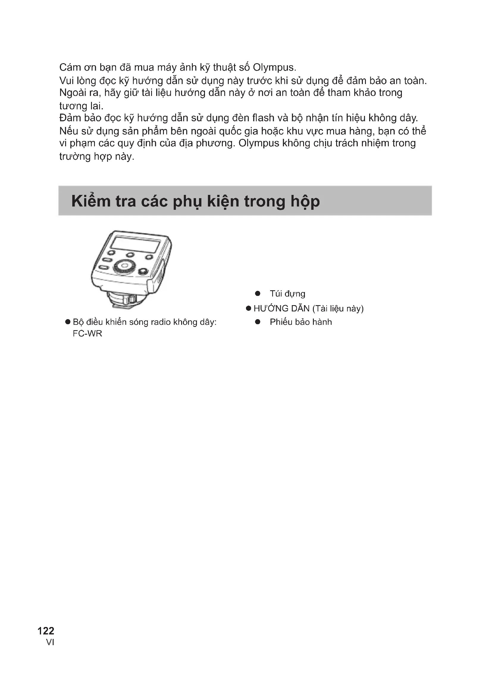 Cám ơn bạn đã mua máy ảnh kỹ thuật số Olympus. Vui lòng đọc kỹ hướng dẫn sử dụng này trước khi sử dụng để đảm bảo an toàn. Ngoài ra, hãy giữ tài liệu hướng dẫn này ở nơi an toàn để tham khảo trong tương lai. Đảm bảo đọc kỹ hướng dẫn sử dụng đèn fl ash và bộ nhận tín hiệu không dây. Nếu sử dụng sản phẩm bên ngoài quốc gia hoặc khu v ực mua hàng, bạn có thể vi phạm các quy định của địa phương. Olympus không chịu trách nhiệm trong trường hợp này. Kiểm tra các phụ kiện trong hộp Túi đựng HƯỚNG DẪN (Tài liệu này) Bộ điều khiển sóng radio không dây: FC-WR Phiếu bảo hành123