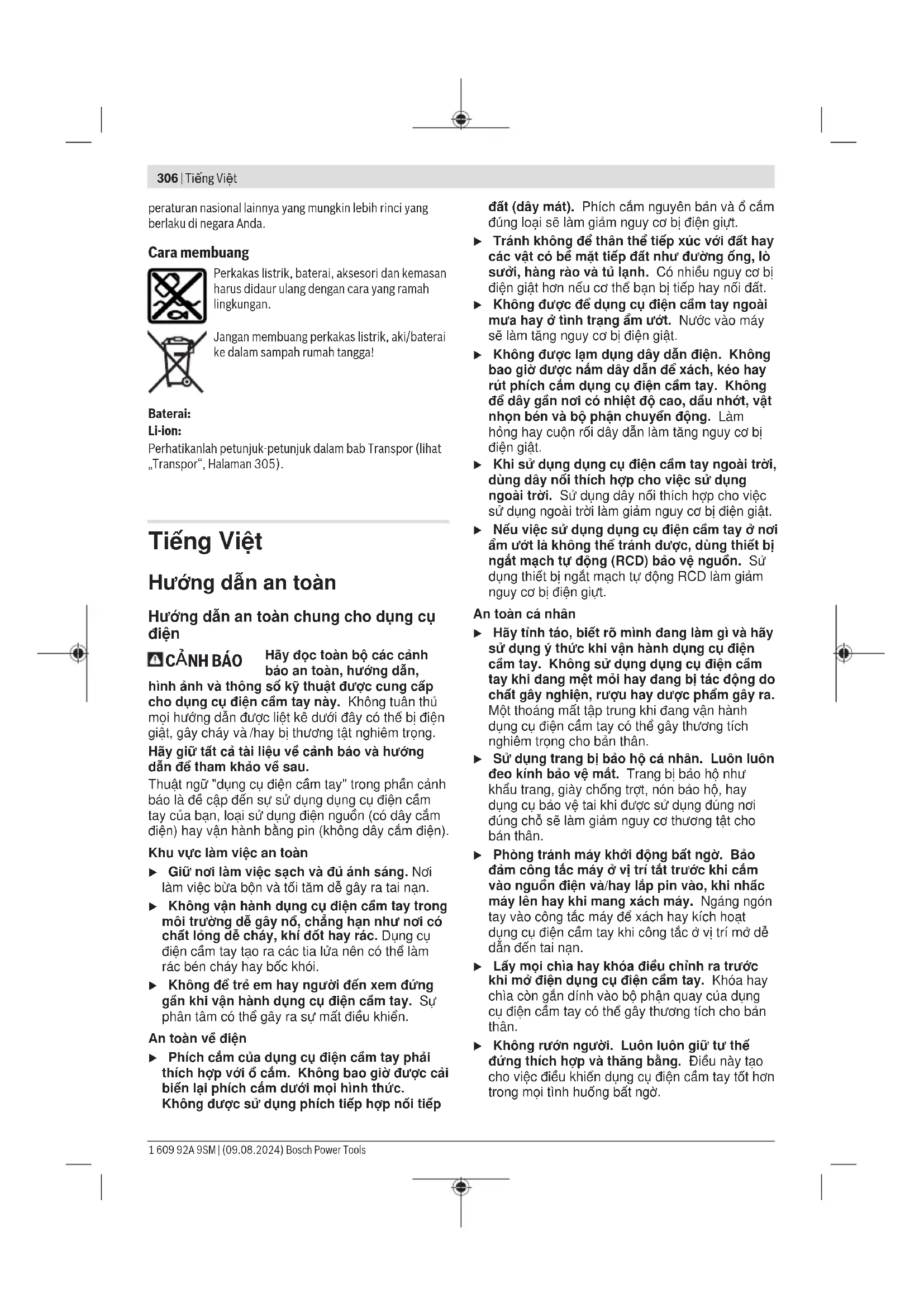 Hãy đọc toàn bộ các cảnh báo an toàn, hướng dẫn, hình ảnh và thông số kỹ thuật được cung cấp cho dụng cụ điện cầm tay này. Không tuân thủ mọi hướng dẫn được liệt kê dưới đây có thể bị điện giật, gây cháy và /hay bị thương tật nghiêm trọng. Hãy giữ tất cả tài liệu về cảnh báo và hướng dẫn để tham khảo về sau. Thuật ngữ "dụng cụ điện cầm tay" trong phần cảnh báo là đề cập đến sự sử dụng dụng cụ điện cầm tay của bạn, loại sử dụng điện nguồn (có dây cắm điện) hay vận hành bằng pin (không dây cắm điện). Khu vực làm việc an toàn u Giữ nơi làm việc sạch và đủ ánh sáng. Nơi làm việc bừa bộn và tối tăm dễ gây ra tai nạn. u Không vận hành dụng cụ điện cầm tay trong môi trường dễ gây nổ, chẳng hạn như nơi có chất lỏng dễ cháy, khí đốt hay rác. Dụng cụ điện cầm tay tạo ra các tia lửa nên có thể làm rác bén cháy hay bốc khói. u Không để trẻ em hay người đến xem đứng gần khi vận hành dụng cụ điện cầm tay. Sự phân tâm có thể gây ra sự mất điều khiển. An toàn về điện u Phích cắm của dụng cụ điện cầm tay phải thích hợp với ổ cắm. Không bao giờ được cải biến lại phích cắm dưới mọi hình thức. Không được sử dụng phích tiếp hợp nối tiếp đất (dây mát). Phích cắm nguyên bản và ổ cắm đúng loại sẽ làm giảm nguy cơ bị điện giựt. u Tránh không để thân thể tiếp xúc với đất hay các vật có bề mặt tiếp đất như đường ống, lò sưởi, hàng rào và tủ lạnh. Có nhiều nguy cơ bị điện giật hơn nếu cơ thể bạn bị tiếp hay nối đất. u Không được để dụng cụ điện cầm tay ngoài mưa hay ở tình trạng ẩm ướt. Nước vào máy sẽ làm tăng nguy cơ bị điện giật. u Không được lạm dụng dây dẫn điện. Không bao giờ được nắm dây dẫn để xách, kéo hay rút phích cắm dụng cụ điện cầm tay. Không để dây gần nơi có nhiệt độ cao, dầu nhớt, vật nhọn bén và bộ phận chuyển động. Làm hỏng hay cuộn rối dây dẫn làm tăng nguy cơ bị điện giật. u Khi sử dụng dụng cụ điện cầm tay ngoài trời, dùng dây nối thích hợp cho việc sử dụng ngoài trời. Sử dụng dây nối thích hợp cho việc sử dụng ngoài trời làm giảm nguy cơ bị điện giật. u Nếu việc sử dụng dụng cụ điện cầm tay ở nơi ẩm ướt là không thể tránh được, dùng thiết bị ngắt mạch tự động (RCD) bảo vệ nguồn. Sử dụng thiết bị ngắt mạch tự động RCD làm giảm nguy cơ bị điện giựt. An toàn cá nhân u Hãy tỉnh táo, biết rõ mình đang làm gì và hãy sử dụng ý thức khi vận hành dụng cụ điện cầm tay. Không sử dụng dụng cụ điện cầm tay khi đang mệt mỏi hay đang bị tác động do chất gây nghiện, rượu hay dược phẩm gây ra. Một thoáng mất tập trung khi đang vận hành dụng cụ điện cầm tay có thể gây thương tích nghiêm trọng cho bản thân. u Sử dụng trang bị bảo hộ cá nhân. Luôn luôn đeo kính bảo vệ mắt. Trang bị bảo hộ như khẩu trang, giày chống trợt, nón bảo hộ, hay dụng cụ bảo vệ tai khi được sử dụng đúng nơi đúng chỗ sẽ làm giảm nguy cơ thương tật cho bản thân. u Phòng tránh máy khởi động bất ngờ. Bảo đảm công tắc máy ở vị trí tắt trước khi cắm vào nguồn điện và/hay lắp pin vào, khi nhấc máy lên hay khi mang xách máy. Ngáng ngón tay vào công tắc máy để xách hay kích hoạt dụng cụ điện cầm tay khi công tắc ở vị trí mở dễ dẫn đến tai nạn. u Lấy mọi chìa hay khóa điều chỉnh ra trước khi mở điện dụng cụ điện cầm tay. Khóa hay chìa còn gắn dính vào bộ phận quay của dụng cụ điện cầm tay có thể gây thương tích cho bản thân. u Không rướn người. Luôn luôn giữ tư thế đứng thích hợp và thăng bằng. Điều này tạo cho việc điều khiển dụng cụ điện cầm tay tốt hơn trong mọi tình huống bất ngờ. 1 609 92A 9SM | (09.08.2024) Bosch Power ToolsTiếng Việt | 307 u Trang phục thích hợp. Không mặc quần áo rộng lùng thùng hay mang trang sức. Giữ tóc và quần áo xa khỏi các bộ phận chuyển động. Quần áo rộng lùng thùng, đồ trang sức hay tóc dài có thể bị cuốn vào các bộ phận chuyển động. u Nếu có các thiết bị đi kèm để nối máy hút bụi và các phụ kiện khác, bảo đảm các thiết bị này được nối và sử dụng tốt. Việc sử dụng các thiết bị gom hút bụi có thể làm giảm các độc hại liên quan đến bụi gây ra. u Không để thói quen do sử dụng thường xuyên dụng cụ khiến bạn trở nên chủ quan và bỏ qua các quy định an toàn dụng cụ. Một hành vi bất cẩn có thể gây ra thương tích nghiêm trọng chỉ trong tíc tắc. Sử dụng và bảo dưỡng dụng cụ điện cầm tay u Không được ép máy. Sử dụng dụng cụ điện cầm tay đúng loại theo đúng ứng dụng của bạn. Dụng cụ điện cầm tay đúng chức năng sẽ làm việc tốt và an toàn hơn theo đúng tiến độ mà máy được thiết kế. u Không sử dụng dụng cụ điện cầm tay nếu như công tắc không tắt và mở được. Bất kỳ dụng cụ điện cầm tay nào mà không th
