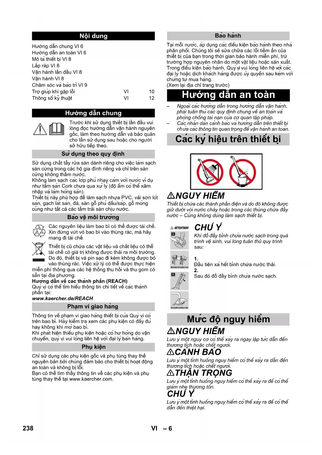 Thiết bị chứa các thành phần điện và do đó không được giữ dưới vòi nước chảy hoặc trong các thùng chứa đầy nước – Cung không dung làm sạch thiết bị. CHU Y Khi đổ đầy binh chưa nước sach trong quá trình vệ sinh, vui lòng tuân thủ quy trình sau: Đầu tiên xa hêt binh chứa nước thải. Sau đó đổ đầy binh chưa nước sach. Mưc đô nguy hiêm 238 VI– 7
