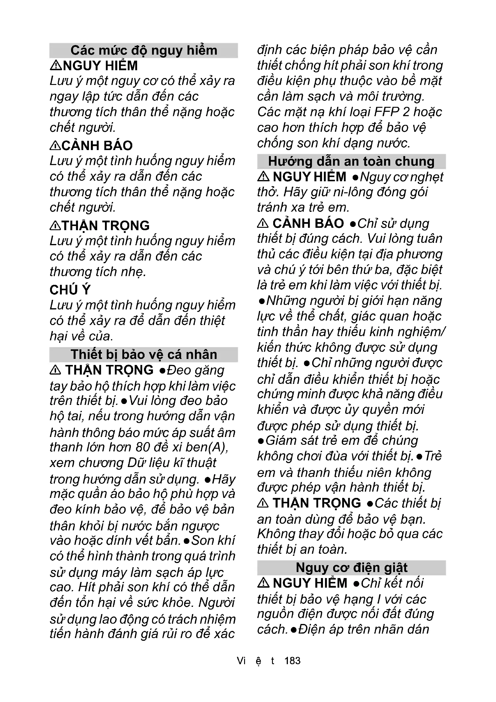 상 위험. 운반 및 저장 시 장비의 무게에 유의하십시오(사용 설 명서의 기술 데이터편 참조). Chỉ dẫn an toàn Máy rửa áp lực cao Trước khi sử dụng thiết bị lần đầu vui lòng đọc bản chỉ dẫn an toàn này và phần hướng dẫn vận hành nguyên gốc. Sau đó bạn hãy thao tác. Hãy lưu trữ cả hai bản hướng dẫn cho lần sử dụng sau hoặc cho người sở hữu tiếp theo. Bên cạnh các chỉ dẫn trong hướng dẫn vận hành bạn cũng cần phải lưu ý đến các quy định về an toàn và phòng tránh tai nạn của cơ quan pháp luật. Các biển cảnh báo và lưu ý trên thiết bị sẽ cung cấp các chỉ dẫn quan trọng để vận hành an toàn.Vi ệ t 183 Các mức độ nguy hiểm