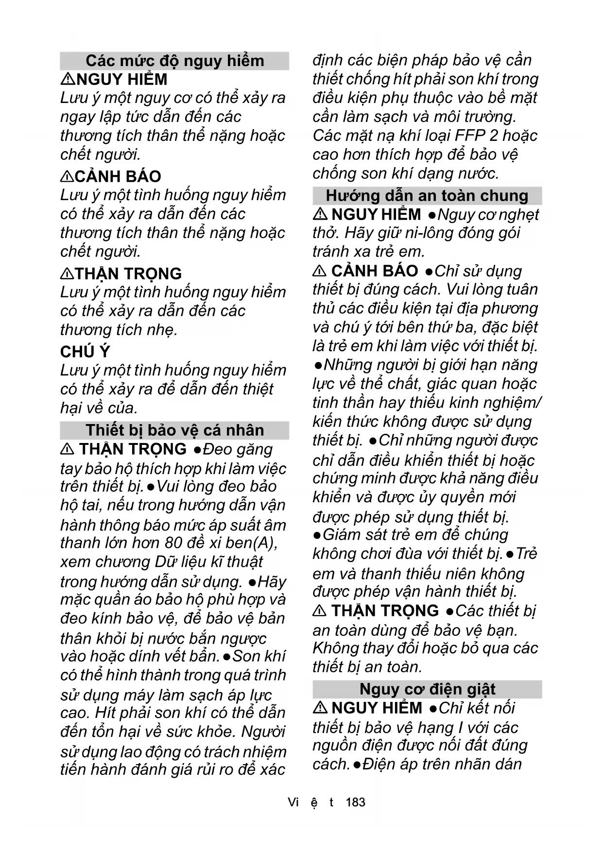 Lưu ý một tình huống nguy hiểm có thể xảy ra dẫn đến các thương tích nhẹ. CHÚ Ý Lưu ý mộ t tình huống nguy hiểm có thể xảy ra để dẫn đến thiệt hại về của. Thiết bị bảo vệ cá nhân 몇 THẬN TRỌNG ●Đeo găng tay bảo hộ thích hợp khi làm việc trên thiết bị. ●Vui lòng đeo bảo hộ tai, nếu trong hướng dẫn vận hành thông báo mức áp suất âm thanh lớn hơn 80 đề xi ben(A), xem chương Dữ liệu kĩ thuật trong hướng dẫn sử dụng. ●Hãy mặc quần áo bảo hộ phù hợp và đeo kính bảo vệ, để bảo vệ bản thân khỏi bị nước bắn ngược vào hoặc dính vết bẩn. ●Son khí có thể hình thành trong quá trình sử dụng máy làm sạch áp lực cao. Hít phải son khí có thể dẫn đến tổn hại về sức khỏe. Người sử dụng lao động có trách nhiệm tiến hành đánh giá rủi ro để xác định các biện pháp bảo vệ cần thiết chống hít phải son khí trong điều kiện phụ thuộc vào bề mặt cần làm sạch và môi trường. Các mặt nạ khí loại FFP 2 hoặc cao hơn thích hợp để bảo vệ chống son khí dạng nước. Hướng dẫn an toàn chung NGUY HIỂM ●Nguy cơ nghẹt thở. Hãy giữ ni-lông đóng gói tránh xa trẻ em. 몇 CẢNH BÁO ●Chỉ sử dụng thiết bị đúng cách. Vui lòng tuân thủ các điều kiện tại địa phương và chú ý tới bên thứ ba, đặc biệt là trẻ em khi làm việc với thiết bị. ●Những người bị giới hạn năng lực về thể chất, giác quan hoặc tinh thần hay thiếu kinh nghiệm/ kiến thức không được sử dụng thiết bị. ●Chỉ những người được chỉ dẫn điều khiển thiết bị hoặc chứng minh được khả năng điều khiển và được ủy quyền mới được phép sử dụng thiết bị. ●Giám sát trẻ em để chúng không chơi đùa với thiết bị. ●Trẻ em và thanh thiếu niên không được phép vận hành thiết bị. 몇 THẬN TRỌNG ●Các thiết bị an toàn dùng để bảo vệ bạn. Không thay đổi hoặc bỏ qua các thiết bị an toàn. Nguy cơ điện giật NGUY HIỂM ●Chỉ kết nối thiết bị bảo vệ hạng I với các nguồn điện được nối đất đúng cách. ●Điện áp trên nhãn dán184 Vi ệ t phải phù hợp với điện áp của nguồn điện. ●Quan sát mức độ bảo vệ tối thiểu của ổ cắm, xem chương Dữ liệu kĩ thuật trong hướng dẫn vận hành. ●Chỉ vận hành thiết bị qua một bộ ngắt mạch dòng điện sự cố (tối đa 30 mA). ●Không bao giờ được sờ