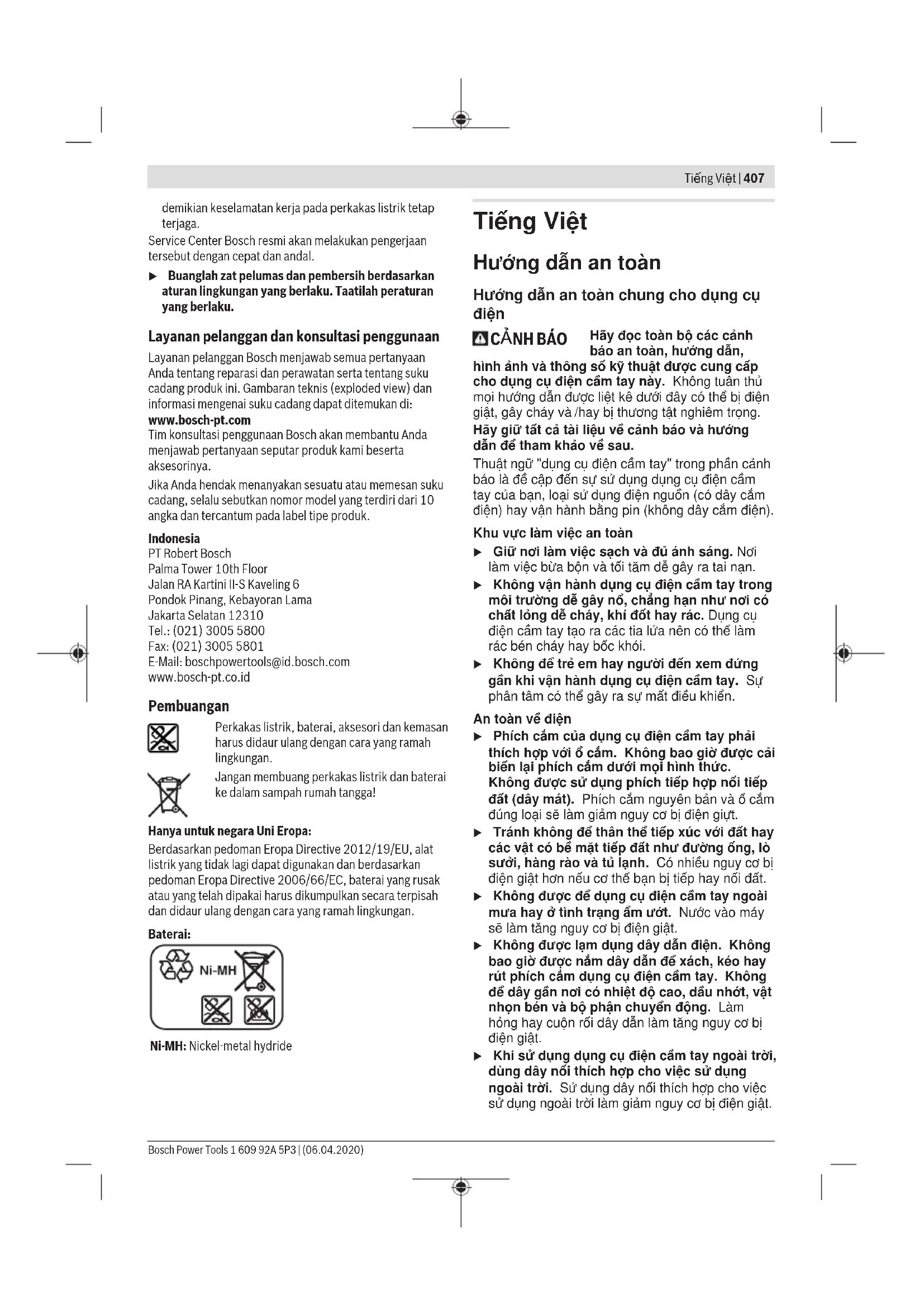 Hãy nhấn vòng đánh dấu (19) bằng lưỡi mỏng của chìa vặn vít, chất trám hoặc tương tự. Hãy đẩy vòng hãm (29) bằng một chiếc kìm ra phía sau lên vỏ máy. Cả hai nửa vỏ bọc của giá gắn đèn LED (15), mà bao quanh đèn làm việc LED (20), có thể được đưa vào vị trí mong muốn. Hãy đảm bảo rằng dây cáp ở đèn làm việc LED không bị hỏng và hãy đẩy nó vào hốc rỗng tương ứng (30) trong vỏ máy mà không gây vặn xoắn. Hãy bao bọc đèn làm việc LED (20) lại bằng cả hai vỏ máy của giá gắn đèn LED (15). Bosch Power Tools 1 609 92A 5P3 | (06.04.2020)418 | Tiếng Việt Hãy nhấn vòng hãm (29) và vòng đánh dấu (19) trở về vị trí ban đầu. Bảo Dưỡng và Bảo Quản Bảo Dưỡng Và Làm Sạch u Trước khi tiến hành bất cứ công việc gì với máy (ví dụ bảo dưỡng, thay dụng cụ v.v..) cũng như khi vận chuyển hay lưu kho, tháo pin ra khỏi dụng cụ điện. Có nguy cơ gây thương tích khi vô tình làm kích hoạt công tắc Tắt/Mở. u Để được an toàn và máy hoạt động đúng chức năng, luôn luôn giữ máy và các khe thông gió được sạch. Bôi trơn dụng cụ điện Chất bôi trơn: Mỡ hộp số đặc biệt (225 ml) Mã số máy 3 605 430 009 Mỡ Molykote Dầu động cơ SAE 10/SAE 20 – Dùng dung môi loại nhẹ rửa sạch hộp truyền động sau 150 giờ chạy đầu tiên. Làm theo hướng dẫn cách sử dụng và thải bỏ dung môi của nhà sản suất. Dùng dầu hộp số đặc biệt của Bosch để bôi trơn hộp truyền động. Qui trình vệ sinh được thực hiện lại cho mỗi 300 giờ kể từ lần vệ sinh đầu tiên. – Hãy bôi trơn các bộ phận chuyển động của khớp ly hợp ngắt sau 100000 mối nối bắt vít với một vài giọt dầu động cơ SAE 10/SAE 20. Hãy bôi trơn các bộ phận trượt và xoay bằng mỡ Molykote. Cùng lúc, kiểm tra xem khớp ly hợp có mòn để chắc chắn sự hoạt động trở lại và sự chính xác không bị ảnh hưởng. Sau cùng, phải điều chỉnh lại mô men xoắn của khớp ly hợp. u Hãy chỉ để công việc bảo trì và sửa chữa được thực hiện bởi người có chuyên môn được đào tạo. Bằng cách này, ta có thể đảm bảo sự an toàn của dụng cụ điện vẫn được giữ nguyên. Một bộ phận dịch vụ khách hàng Bosch được ủy quyền có thể thực hiện công việc này một cách đáng tin và nhanh chóng. u Loại bỏ chất bôi trơn và chất tẩy rửa theo quy định bảo vệ môi trường. Hãy tuân thủ các quy định của pháp luật. Dịch vụ hỗ trợ khách hàng và tư vấn sử dụng Bộ phận phục vụ hàng sau khi bán của chúng tôi trả lời các câu hỏi liên quan đến việc bảo dưỡng và sửa chữa các sản phẩm cũng như phụ tùng thay thế của bạn. Sơ đồ mô tả và thông tin về phụ tùng thay thế cũng có thể tra cứu theo dưới đây: www.bosch-pt.com Đội ngũ tư vấn sử dụng của Bosch sẽ giúp bạn giải đáp các thắc mắc về sản phẩm và phụ kiện. Trong tất cả các phản hồi và đơn đặt phụ tùng, xin vui lòng luôn luôn nhập số hàng hóa 10 chữ số theo nhãn của hàng hóa. Việt Nam CN CÔNG TY TNHH BOSCH VIÊT NAM TAI TP.HCM Tâng 14, Ngôi Nhà Đức, 33 Lê Duẩn Phương Bến Nghé, Quân 1, Thanh Phô Hô Chi Minh Tel.: (028) 6258 3690 Fax: (028) 6258 3692 - 6258 3694 Hotline: (028) 6250 8555 Email: tuvankhachhang-pt@vn.bosch.com www.bosch-pt.com.vn www.baohanhbosch-pt.com.vn Campuchia Công ty TNHH Robert Bosch (Campuchia) Đơn nguyên 8BC, GT Tower, Tầng 08, Đường 169, Tiệp Khắc Blvd, Sangkat Veal Vong, Khan 7 Makara, Phnom Penh VAT TIN: 100 169 511 Tel.: +855 23 900 685 Tel.: +855 23 900 660 www.bosch.com.kh Sự thải bỏ Dụng cụ điện, pin, phụ kiện và bao bì cần được tái sử dụng theo quy định về môi trường. Bạn không được ném dụng cụ điện và pin vào thùng rác gia đình! Chỉ dành cho các quốc gia thuộc khối Liên minh Châu Âu (EU): Các dụng cụ điện cầm tay không còn giá trị sử dụng theo chỉ thị châu Âu 2012/19/EU và ắc quy/ pin bị hỏng hoặc đã qua sử dụng theo chỉ thị số 2006/66/EC phải được thu gom riêng và có thể tái sử dụng theo luật môi trường. Pin/ắc quy: Ni-MH: Niken-kim loại hyđrua 1 609 92A 5P3 | (06.04.2020) Bosch Power Toolsيبرع | 419