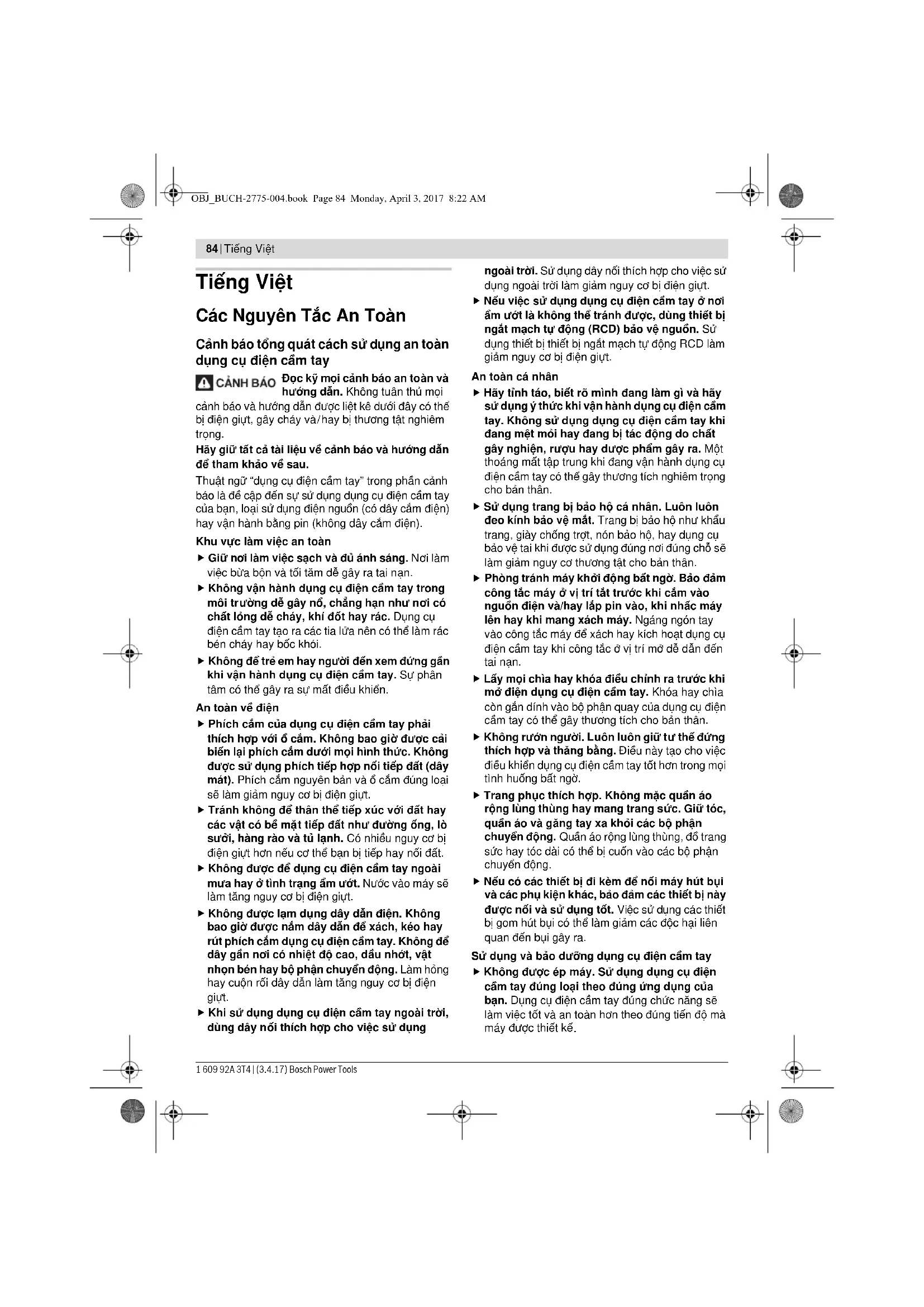 Floor Jl. RA Kartini II-S Kaveling 6 Sek II Pondok Pinang, Kebayoran Lama Jakarta Selatan 12310 Tel.: (021) 3005 5800 Fax: (021) 3005 5801 E-Mail: boschpowertools@id.bosch.com www.bosch-pt.co.id Cara membuang Perkakas listrik, aksesori dan kemasan sebaiknya didaur ulangkan sesuai dengan upaya untuk melindungi lingkungan hidup. Janganlah membuang perkakas listrik dalam sampah rumah tangga! Perubahan dapat terjadi tanpa pemberitahuan sebelumnya. OBJ_BUCH-2775-004.book Page 83 Monday, April 3, 2017 8:22 AM84 | Tiếng Việt 1 609 92A 3T4 | (3.4.17) Bosch Power Tools Tiếng Việt Các Nguyên Tắc An Toàn Cảnh báo tổng quát cách sử dụng an toàn dụng cụ điện cầm tay Đọc kỹ mọi cảnh báo an toàn và hướng dẫn. Không tuân thủ mọi cảnh báo và hướng dẫn được liệt kê dưới đây có thể bị điện giựt, gây cháy và/hay bị thương tật nghiêm trọng. Hãy giữ tất cả tài liệu về cảnh báo và hướng dẫn để tham khảo về sau. Thuật ngữ “dụng cụ điện cầm tay” trong phần cảnh báo là đề cập đế n sự sử dụng dụng cụ điện cầm tay của bạn, loại sử dụng điện nguồn (có dây cắm điện) hay vận hành bằng pin (không dây cắm điện). Khu vực làm việc an toàn Giữ nơi làm việc sạch và đủ ánh sáng. Nơi làm việc bừa bộn và tối tăm dễ gây ra tai nạn. Không vận hành dụng cụ điện cầm tay trong môi tr ường dễ gây nổ, chẳng hạn như nơi có chất lỏng dễ cháy, khí đốt hay rác. Dụng cụ điện cầm tay tạo ra các tia lửa nên có thể làm rác bén cháy hay bốc khói. Không để trẻ em hay người đến xem đứng gần khi vận hành dụng cụ điện cầm tay. Sự phân tâm có thể gây ra sự mất điều khiển. An toàn về điện Phích cắm của dụng c ụ điện cầm tay phải thích hợp với ổ cắm. Không bao giờ được cải biến lại phích cắm dưới mọi hình thức. Không được sử dụng phích tiếp hợp nối tiếp đất (dây mát). Phích cắm nguyên bản và ổ cắm đúng loại sẽ làm giảm nguy cơ bị điện giựt. Tránh không để thân thể tiếp xúc với đất hay các vật có bề mặ t tiếp đất như đường ống, lò sưởi, hàng rào và tủ lạnh. Có nhiều nguy cơ bị điện giựt hơn nếu cơ thể bạn bị tiếp hay nối đất. Không được để dụng cụ điện cầm tay ngoài mưa hay ở tình trạng ẩm ướt. Nước vào máy sẽ làm tăng nguy cơ bị điện giựt. Không được lạm dụ ng dây dẫn điện. Không bao giờ được nắm dây dẫn để xách, kéo hay rút phích cắm dụng cụ điện cầm tay. Không để dây gần nơi có nhiệt độ cao, dầu nhớt, vật nhọn bén hay bộ phận chuyển động. Làm hỏng hay cuộn rối dây dẫn làm tăng nguy cơ bị điện giựt. Khi sử dụng dụng cụ điện cầm tay ngoài trời, dùng dây n ối thích hợp cho việc sử dụng ngoài trời. Sử dụng dây nối thích hợp cho việc sử dụng ngoài trời làm giảm nguy cơ bị điện giựt. Nếu việc sử dụng dụng cụ điện cầm tay ở nơi ẩm ướt là không thể tránh được, dùng thiết bị ngắt mạch tự động (RCD) bảo vệ nguồn. Sử dụng thiế t bị thiết bị ngắt mạch tự động RCD làm giảm nguy cơ bị điện giựt. An toàn cá nhân Hãy tỉnh táo, biết rõ mình đang làm gì và hãy sử dụng ý thức khi vận hành dụng cụ điện cầm tay. Không sử dụng dụng cụ điện cầm tay khi đang mệt mỏi hay đang bị tác động do chất gây nghiện, rượu hay dược phẩm gây ra. Một thoáng mất tậ p trung khi đang vận hành dụng cụ điện cầm tay có thể gây thương tích nghiêm trọng cho bản thân. Sử dụng trang bị bảo hộ cá nhân. Luôn luôn đeo kính bảo vệ mắt. Trang bị bảo hộ như khẩu trang, giày chống trợt, nón bảo hộ, hay dụng cụ bảo vệ tai khi được sử dụng đúng nơi đúng chỗ sẽ làm giảm nguy cơ thương tật cho bản thân.