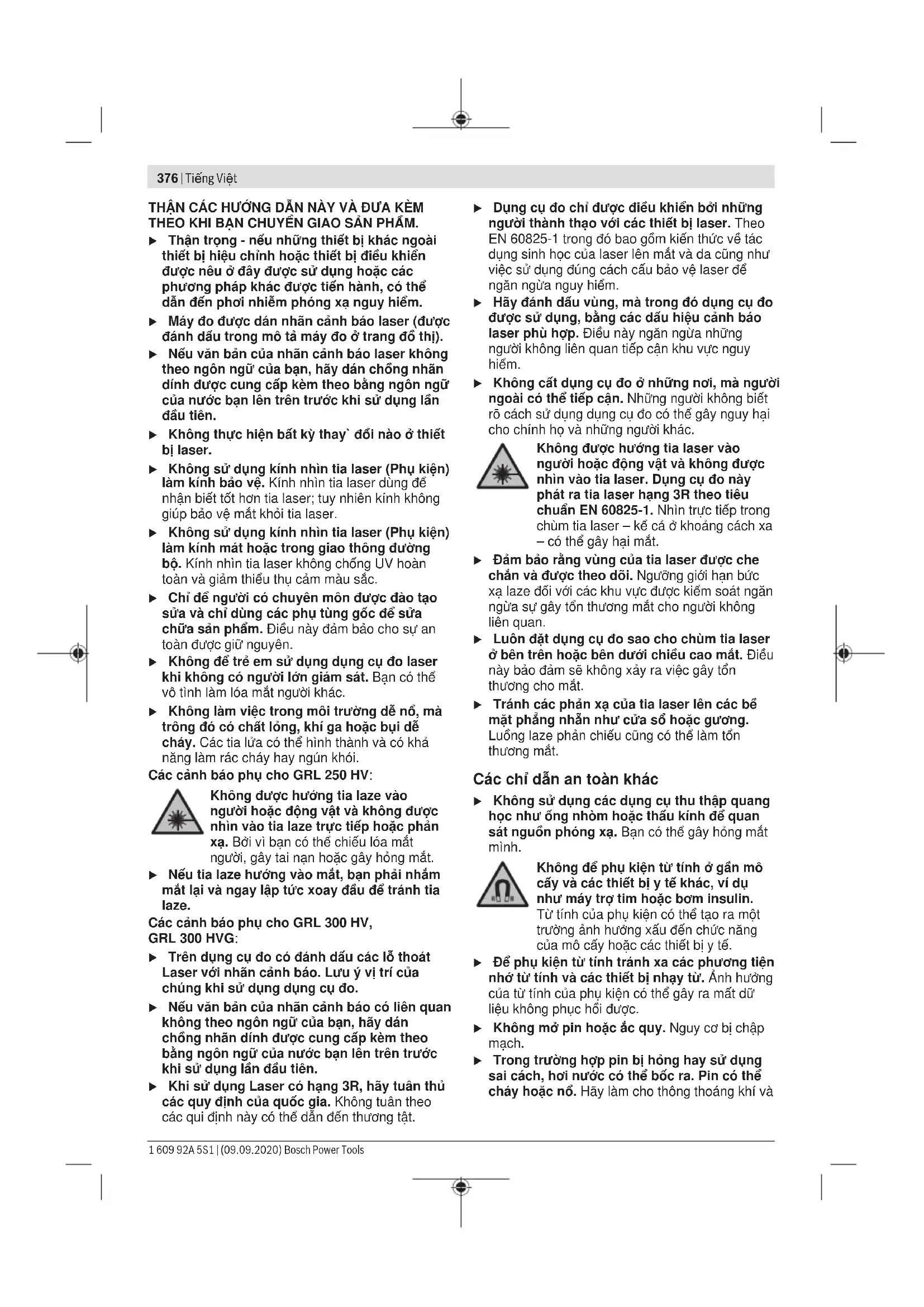 Batas perataan otomatis terlampaui 2×/s ○ ● Shock-warning aktif ● Shock-warning terpicu 2×/s ○ 2×/s Tegangan baterai untuk pengoperasian ≤2jam 2×/s Baterai kosong ○ ○ ● ●:Pengoperasian secara kontinu 2×/s: Frekuensi kedipan (misalnya dua kali dalam satu detik) ○:Fungsi berhenti Perawatan dan servis Perawatan dan pembersihan Jaga kebersihan alat pengukur, perangkat pengisian daya dan remote control. Jangan memasukkan alat pengukur, perangkat pengisian daya dan remote control ke dalam air atau cairan lainnya. Jika alat kotor, bersihkan dengan lap yang lembut dan lembap. Jangan gunakan bahan pembersih atau zat pelarut. Bersihkan alat pengukur secara berkala terutama permukaan outlet sinar laser dan pastikan terbebas dari kain serat. Layanan pelanggan dan konsultasi penggunaan Layanan pelanggan Bosch menjawab semua pertanyaan Anda tentang reparasi dan perawatan serta tentang suku cadang produk ini. Gambaran teknis (exploded view) dan informasi mengenai suku cadang dapat ditemukan di: www.bosch-pt.com Tim konsultasi penggunaan Bosch akan membantu Anda menjawab pertanyaan seputar produk kami beserta aksesorinya. Jika Anda hendak menanyakan sesuatu atau memesan suku cadang, selalu sebutkan nomor model yang terdiri dari 10 angka dan tercantum pada label tipe produk. Indonesia PT Robert Bosch Palma Tower 10th Floor Jalan RA Kartini II-S Kaveling 6 Pondok Pinang, Kebayoran Lama Jakarta Selatan 12310 Tel.: (021) 3005 5800 Fax: (021) 3005 5801 E-Mail: boschpowertools@id.bosch.com www.bosch-pt.co.id Alamat layanan lainnya dapat ditemukan di: www.bosch-pt.com/serviceaddresses Cara membuang Perangkat listrik, baterai, aksesori dan pembungkus harus disortir untuk pendauran ulang yang ramah lingkungan. Jangan membuang perangkat listrik atau baterai bersama dengan sampah rumah tangga! Hanya untuk negara Uni Eropa: Berdasarkan European Directive 2012/19/EU, perangkat listrik yang tidak dapat digunakan lagi dan berdasarkan European Directive 2006/66/EC, baterai yang aus atau rusak harus dikumpulkan secara terpisah dan dibuang dengan cara yang ramah lingkungan. Tiếng Việt Hướng dẫn an toàn cho laser xoay và điều khiển từ xa Phải đọc và chú ý mọi hướng dẫn để đảm bảo an toàn và không bị nguy hiểm khi làm việc. Nếu không tuân thủ các chỉ dẫn này, các biện pháp bảo vệ tích hợp có thể bị ảnh hưởng. Không bao giờ được làm cho các dấu hiệu cảnh báo không thể đọc được. HÃY BẢO QUẢN CẨN Bosch Power Tools 1 609 92A 5S1 | (09.09.2020)376 | Tiếng Việt THẬN CÁC HƯỚNG DẪN NÀY VÀ ĐƯA KÈM THEO KHI BẠN CHUYỂN GIAO SẢN PHẨM. u Thận trọng - nếu những thiết bị khác ngoài thiết bị hiệu chỉnh hoặc thiết bị điều khiển được nêu ở đây được sử dụng hoặc các phương pháp khác được tiến hành, có thể dẫn đến phơi nhiễm phóng xạ nguy hiểm. u Máy đo được dán nhãn cảnh báo laser (được đánh dấu trong mô tả máy đo ở trang đồ thị). u Nếu văn bản của nhãn cảnh báo laser không theo ngôn ngữ của bạn, hãy dán chồng nhãn dính được cung cấp kèm theo bằng ngôn ngữ của nước bạn lên trên trước khi sử dụng lần đầu tiên. u Không thực hiện bất kỳ thay` đổi nào ở thiết bị laser. u Không sử dụng kính nhìn tia laser (Phụ kiện) làm kính bảo vệ. Kính nhìn tia laser dùng để nhận biết tốt hơn tia laser; tuy nhiên kính không giúp bảo vệ mắt khỏi tia laser. u Không sử dụng kính nhìn tia laser (Phụ kiện) làm kính mát hoặc trong giao thông đường bộ. Kính nhìn tia laser không chống UV hoàn toàn và giảm thiểu thụ cảm màu sắc. u Chỉ để người có chuyên môn được đào tạo sửa và chỉ dùng các phụ tùng gốc để sửa chữa sản phẩm. Điều này đảm bảo cho sự an toàn được giữ nguyên. u Không để trẻ em sử dụng dụng cụ đo laser khi không có người lớn giám sát. Bạn có thể vô tình làm lóa mắt người khác. u Không làm việc trong môi trường dễ nổ, mà trông đó có chất lỏng, khí ga hoặc bụi dễ cháy. Các tia lửa có thể hình thành và có khả năng làm rác cháy hay ngún khói. Các cảnh báo phụ cho GRL250HV: Không được hướng tia laze vào người hoặc động vật và không được nhìn vào tia laze trực tiếp hoặc phản xạ. Bởi vì bạn có thể chiếu lóa mắt người, gây tai nạn hoặc gây hỏng mắt. u Nếu tia laze hướng vào mắt, bạn phải nhắm mắt lại và ngay lập tức xoay đầu để tránh tia laze. Các cảnh báo phụ cho GRL300HV, GRL300HVG: u Trên dụng cụ đo có đánh dấu các lỗ thoát Laser với nhãn cảnh báo. Lưu ý vị trí của chúng khi sử dụng dụng cụ đo. u Nếu văn bản của nhãn cảnh báo có liên quan không theo ngôn ngữ của bạn, hãy dán chồng nhãn dính được cung cấp kèm theo bằng ngôn ngữ của nước bạn lên trên trước khi sử dụng lần đầu tiên. u Khi sử dụng Laser có hạng 3R, hãy tuân thủ các quy định của quốc gia. Không tuân theo các qui định này có thể dẫn đến thương tật. u Dụng cụ đo chỉ được điều khiển bởi những người thành thạo với các thiết bị laser. Theo EN 60825-1 trong đó bao gồm kiến thức về tác dụng sinh học của laser lên mắt và da cũng như việc sử dụng đúng cách cấu bảo vệ laser để ngăn ngừa nguy hiểm. u Hãy đánh dấu vùng, mà trong đó dụng cụ đo được sử dụng, bằng các dấu hiệu cảnh báo laser phù hợp. Điều này ngăn ngừa những người không liên quan tiếp cận khu vực nguy hi