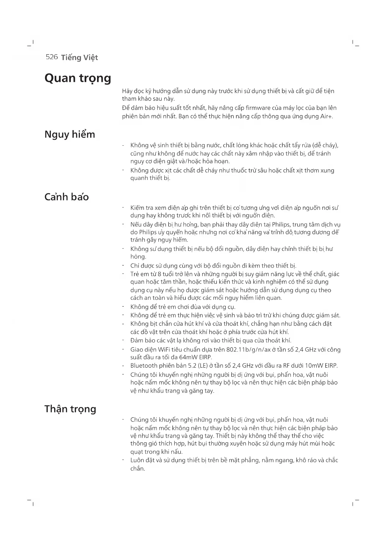 Bluetooth phien ban 5.2 (LE) à tan so 2,4 GHz vovi d'au ra RF duovi 10mW EIRP. - Chúng tói khuyén nghi nhūng nguòi bi di ñng vòi bùi, phàn hoa, vát nuǒi hoàn nám míc khòng nént tu thay bó loc và nèn thuc hiên céc bièn phap bao vě nhu khaú trang và gāng tay.