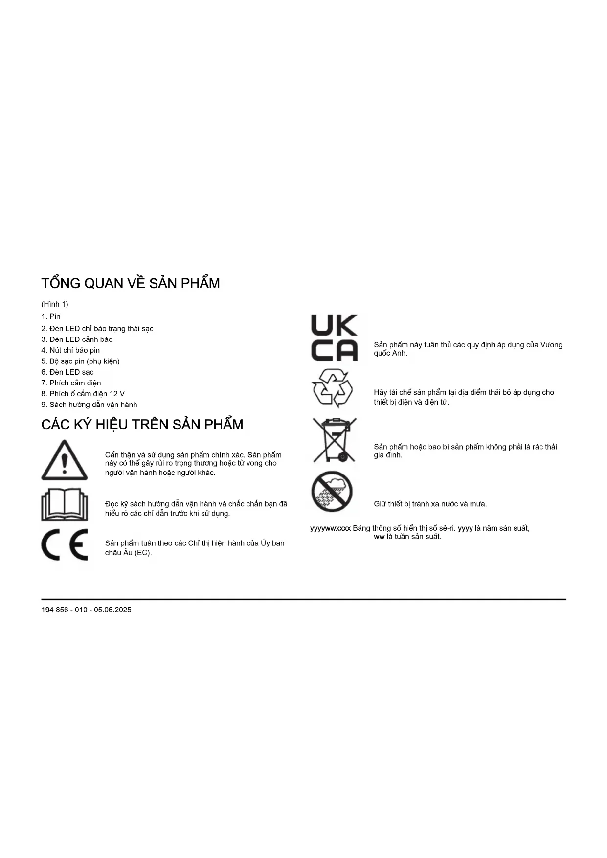 CÁC KÝ HIỆU TRÊN SẢN PHẨM Cẩn thận và sử dụng sản phẩm chính xác. Sản phẩm này có thể gây rủi ro trọng thương hoặc tử vong cho người vận hành hoặc người khác. Đọc kỹ sách hướng dẫn vận hành và chắc chắn bạn đã hiểu rõ các chỉ dẫn trước khi sử dụng. Sản phẩm tuân theo các Chỉ thị hiện hành của Ủy ban châu Âu (EC). Sản phẩm này tuân thủ các quy định áp dụng của Vương quốc Anh. Hãy tái chế sản phẩm tại địa điểm thải bỏ áp dụng cho thiết bị điện và điện tử. Sản phẩm hoặc bao bì sản phẩm không phải là rác thải gia đình. Giữ thiết bị tránh xa nước và mưa. yyyywwxxxx Bảng thông số hiển thị số sê-ri. yyyy là năm sản suất, ww là tuần sản suất. 194 856 - 010 - 05.06.2025Lưu ý: Những ký hiệu/đề-can khác trên sản phẩm cho biết các yêu cầu về chứng nhận dành cho một số khu vực thương mại khác. Hư hỏng sản phẩm Chúng tôi không chịu trách nhiệm cho hư hỏng đối với sản phẩm nếu: