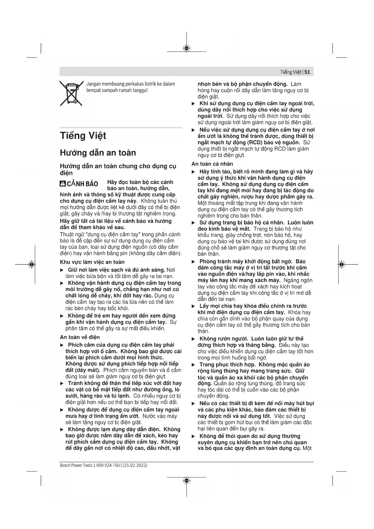 Hãy đọc toàn bộ các cảnh báo an toàn, hướng dẫn, hình ảnh và thông số kỹ thuật được cung cấp cho dụng cụ điện cầm tay này. Không tuân thủ mọi hướng dẫn được liệt kê dưới đây có thể bị điện giật, gây cháy và /hay bị thương tật nghiêm trọng. Hãy giữ tất cả tài liệu về cảnh báo và hướng dẫn để tham khảo về sau. Thuật ngữ "dụng cụ điện cầm tay" trong phần cảnh báo là đề cập đến sự sử dụng dụng cụ điện cầm tay của bạn, loại sử dụng điện nguồn (có dây cắm điện) hay vận hành bằng pin (không dây cắm điện). Khu vực làm việc an toàn u Giữ nơi làm việc sạch và đủ ánh sáng. Nơi làm việc bừa bộn và tối tăm dễ gây ra tai nạn. u Không vận hành dụng cụ điện cầm tay trong môi trường dễ gây nổ, chẳng hạn như nơi có chất lỏng dễ cháy, khí đốt hay rác. Dụng cụ điện cầm tay tạo ra các tia lửa nên có thể làm rác bén cháy hay bốc khói. u Không để trẻ em hay người đến xem đứng gần khi vận hành dụng cụ điện cầm tay. Sự phân tâm có thể gây ra sự mất điều khiển. An toàn về điện u Phích cắm của dụng cụ điện cầm tay phải thích hợp với ổ cắm. Không bao giờ được cải biến lại phích cắm dưới mọi hình thức. Không được sử dụng phích tiếp hợp nối tiếp đất (dây mát). Phích cắm nguyên bản và ổ cắm đúng loại sẽ làm giảm nguy cơ bị điện giựt. u Tránh không để thân thể tiếp xúc với đất hay các vật có bề mặt tiếp đất như đường ống, lò sưởi, hàng rào và tủ lạnh. Có nhiều nguy cơ bị điện giật hơn nếu cơ thể bạn bị tiếp hay nối đất. u Không được để dụng cụ điện cầm tay ngoài mưa hay ở tình trạng ẩm ướt. Nước vào máy sẽ làm tăng nguy cơ bị điện giật. u Không được lạm dụng dây dẫn điện. Không bao giờ được nắm dây dẫn để xách, kéo hay rút phích cắm dụng cụ điện cầm tay. Không để dây gần nơi có nhiệt độ cao, dầu nhớt, vật nhọn bén và bộ phận chuyển động. Làm hỏng hay cuộn rối dây dẫn làm tăng nguy cơ bị điện giật. u Khi sử dụng dụng cụ điện cầm tay ngoài trời, dùng dây nối thích hợp cho việc sử dụng ngoài trời. Sử dụng dây nối thích hợp cho việc sử dụng ngoài trời làm giảm nguy cơ bị điện giật. u Nếu việc sử dụng dụng cụ điện cầm tay ở nơi ẩm ướt là không thể tránh được, dùng thiết bị ngắt mạch tự động (RCD) bảo vệ nguồn. Sử dụng thiết bị ngắt mạch tự động RCD làm giảm nguy cơ bị điện giựt. An toàn cá nhân u Hãy tỉnh táo, biết rõ mình đang làm gì và hãy sử dụng ý thức khi vận hành dụng cụ điện cầm tay. Không sử dụng dụng cụ điện cầm tay khi đang mệt mỏi hay đang bị tác động do chất gây nghiện, rượu hay dược phẩm gây ra. Một thoáng mất tập trung khi đang vận hành dụng cụ điện cầm tay có thể gây thương tích nghiêm trọng cho bản thân. u Sử dụng trang bị bảo hộ cá nhân. Luôn luôn đeo kính bảo vệ mắt. Trang bị bảo hộ như khẩu trang, giày chống trợt, nón bảo hộ, hay dụng cụ bảo vệ tai khi được sử dụng đúng nơi đúng chỗ sẽ làm giảm nguy cơ thương tật cho bản thân. u Phòng tránh máy khởi động bất ngờ. Bảo đảm công tắc máy ở vị trí tắt trước khi cắm vào nguồn điện và/hay lắp pin vào, khi nhấc máy lên hay khi mang xách máy. Ngáng ngón tay vào công tắc máy để xách hay kích hoạt dụng cụ điện cầm tay khi công tắc ở vị trí mở dễ dẫn đến tai nạn. u Lấy mọi chìa hay khóa điều chỉnh ra trước khi mở điện dụng cụ điện cầm tay. Khóa hay chìa còn gắn dính vào bộ phận quay của dụng cụ điện cầm tay có thể gây thương tích cho bản thân. u Không rướn người. Luôn luôn giữ tư thế đứng thích hợp và thăng bằng. Điều này tạo cho việc điều khiển dụng cụ điện cầm tay tốt hơn trong mọi tình huống bất ngờ. u Trang phục thích hợp. Không mặc quần áo rộng lùng thùng hay mang trang sức. Giữ tóc và quần áo xa khỏi các bộ phận chuyển động. Quần áo rộng lùng thùng, đồ trang sức hay tóc dài có thể bị cuốn vào các bộ phận chuyển động. u Nếu có các thiết bị đi kèm để nối máy hút bụi và các phụ kiện khác, bảo đảm các thiết bị này được nối và sử dụng tốt. Việc sử dụng các thiết bị gom hút bụi có thể làm giảm các độc hại liên quan đến bụi gây ra. u Không để thói quen do sử dụng thường xuyên dụng cụ khiến bạn trở nên chủ quan và bỏ qua các quy định an toàn dụng cụ. Một Bosch Power Tools 1 609 92A 76U | (25.02.2022)52 | Tiếng Việt hành vi bất cẩn có thể gây ra thương tích nghiêm trọng chỉ trong tíc tắc. Sử dụng và bảo dưỡng dụng cụ điện cầm tay u Không được ép máy. Sử dụng dụng cụ điện cầm tay đúng loại theo đúng ứng dụng của bạn. Dụng cụ điện cầm tay đúng chức năng sẽ làm việc tốt và an toàn hơn theo đúng tiến độ mà máy được thiết kế. u Không sử dụng dụng cụ điện cầm tay nếu như công tắc không tắt và mở được. Bất kỳ dụng cụ điện cầm tay nào mà không th