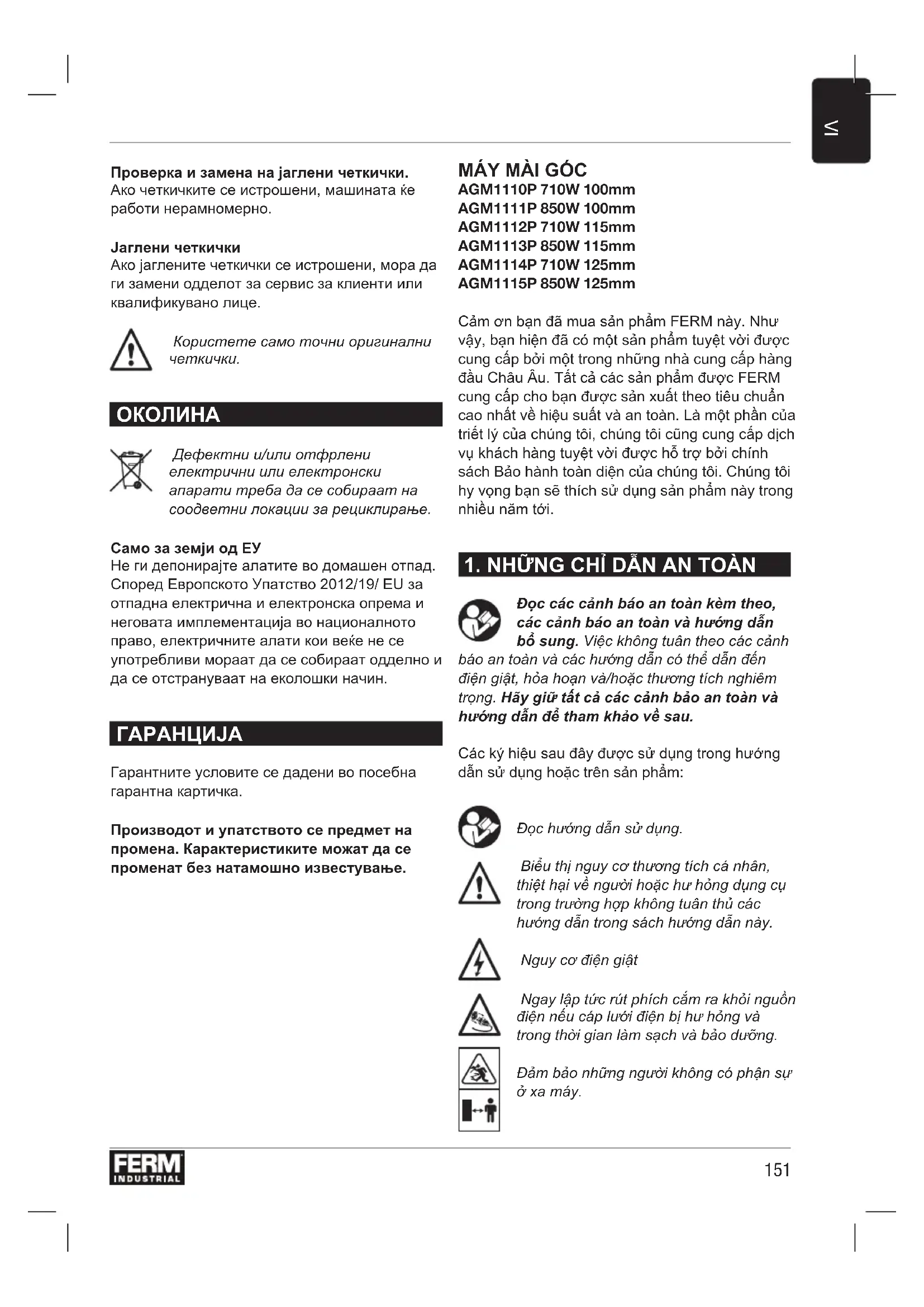 AGM1110P 710W 100mm AGM1111P 850W 100mm AGM1112P 710W 115mm AGM1113P 850W 115mm AGM1114P 710W 125mm AGM1115P 850W 125mm Cảm ơn bạn đã mua sản phẩm FERM này. Như vậy, bạn hiện đã có một sản phẩm tuyệt vời được cung cấp bởi một trong những nhà cung cấp hàng đầu Châu Âu. Tất cả các sản phẩm được FERM cung cấp cho bạn được sản xuất theo tiêu chuẩn cao nhất về hiệu suất và an toàn. Là một phần của triết lý của chúng tôi, chúng tôi cũng cung cấp dịch vụ khách hàng tuyệt vời được hỗ trợ bởi chính sách Bảo hành toàn diện của chúng tôi. Chúng tôi hy vọng bạn sẽ thích sử dụng sản phẩm này trong nhiều năm tới.