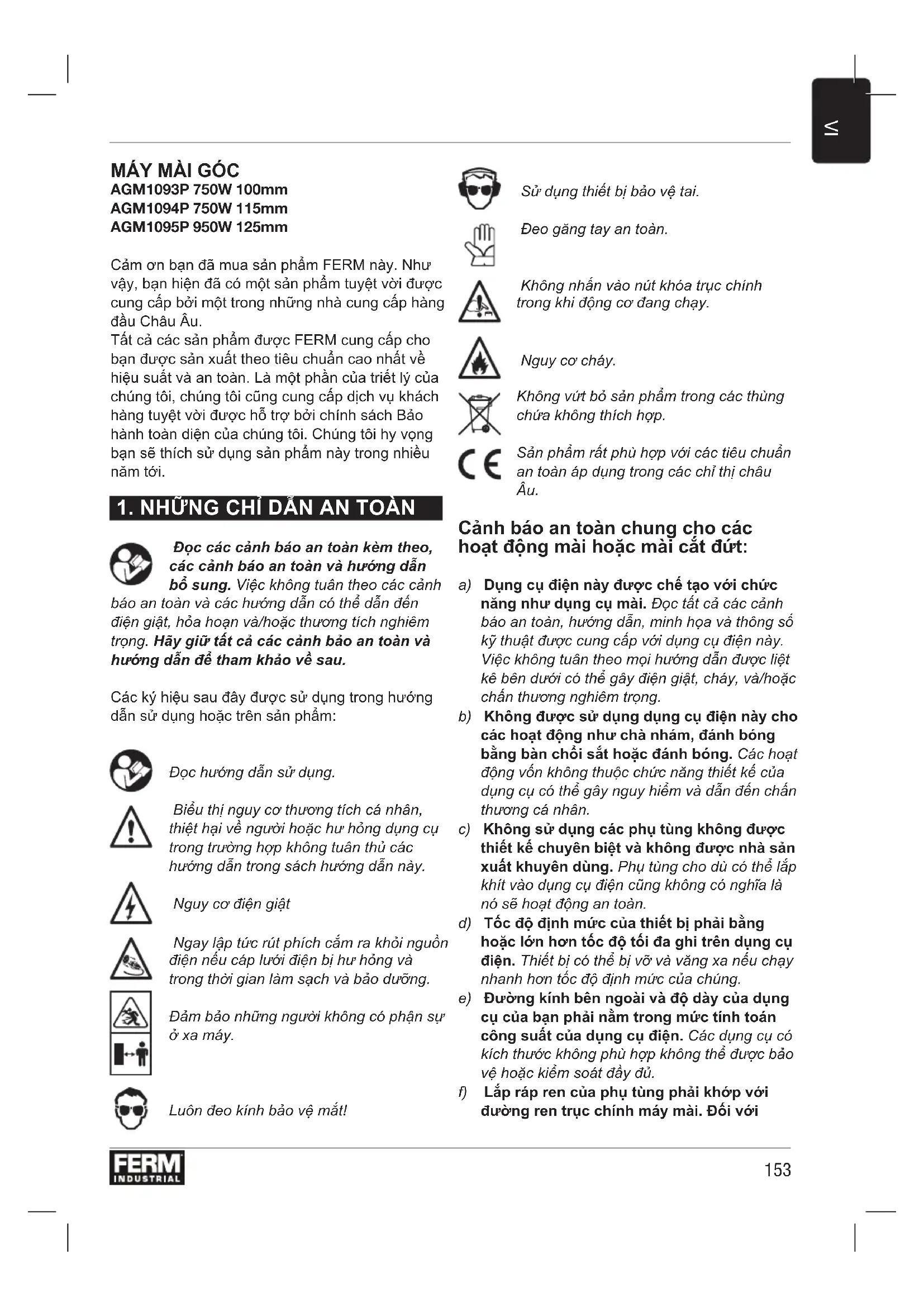 AGM1093P 750W 100mm AGM1094P 750W 115mm AGM1095P 950W 125mm Cảm ơn bạn đã mua sản phẩm FERM này. Như vậy, bạn hiện đã có một sản phẩm tuyệt vời được cung cấp bởi một trong những nhà cung cấp hàng đầu Châu Âu. Tất cả các sản phẩm được FERM cung cấp cho bạn được sản xuất theo tiêu chuẩn cao nhất về hiệu suất và an toàn. Là một phần của triết lý của chúng tôi, chúng tôi cũng cung cấp dịch vụ khách hàng tuyệt vời được hỗ trợ bởi chính sách Bảo hành toàn diện của chúng tôi. Chúng tôi hy vọng bạn sẽ thích sử dụng sản phẩm này trong nhiều năm tới.