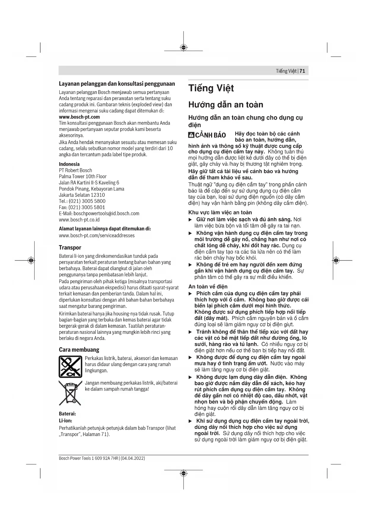 Hãy đọc toàn bộ các cảnh báo an toàn, hướng dẫn, hình ảnh và thông số kỹ thuật được cung cấp cho dụng cụ điện cầm tay này. Không tuân thủ mọi hướng dẫn được liệt kê dưới đây có thể bị điện giật, gây cháy và /hay bị thương tật nghiêm trọng. Hãy giữ tất cả tài liệu về cảnh báo và hướng dẫn để tham khảo về sau. Thuật ngữ "dụng cụ điện cầm tay" trong phần cảnh báo là đề cập đến sự sử dụng dụng cụ điện cầm tay của bạn, loại sử dụng điện nguồn (có dây cắm điện) hay vận hành bằng pin (không dây cắm điện). Khu vực làm việc an toàn u Giữ nơi làm việc sạch và đủ ánh sáng. Nơi làm việc bừa bộn và tối tăm dễ gây ra tai nạn. u Không vận hành dụng cụ điện cầm tay trong môi trường dễ gây nổ, chẳng hạn như nơi có chất lỏng dễ cháy, khí đốt hay rác. Dụng cụ điện cầm tay tạo ra các tia lửa nên có thể làm rác bén cháy hay bốc khói. u Không để trẻ em hay người đến xem đứng gần khi vận hành dụng cụ điện cầm tay. Sự phân tâm có thể gây ra sự mất điều khiển. An toàn về điện u Phích cắm của dụng cụ điện cầm tay phải thích hợp với ổ cắm. Không bao giờ được cải biến lại phích cắm dưới mọi hình thức. Không được sử dụng phích tiếp hợp nối tiếp đất (dây mát). Phích cắm nguyên bản và ổ cắm đúng loại sẽ làm giảm nguy cơ bị điện giựt. u Tránh không để thân thể tiếp xúc với đất hay các vật có bề mặt tiếp đất như đường ống, lò sưởi, hàng rào và tủ lạnh. Có nhiều nguy cơ bị điện giật hơn nếu cơ thể bạn bị tiếp hay nối đất. u Không được để dụng cụ điện cầm tay ngoài mưa hay ở tình trạng ẩm ướt. Nước vào máy sẽ làm tăng nguy cơ bị điện giật. u Không được lạm dụng dây dẫn điện. Không bao giờ được nắm dây dẫn để xách, kéo hay rút phích cắm dụng cụ điện cầm tay. Không để dây gần nơi có nhiệt độ cao, dầu nhớt, vật nhọn bén và bộ phận chuyển động. Làm hỏng hay cuộn rối dây dẫn làm tăng nguy cơ bị điện giật. u Khi sử dụng dụng cụ điện cầm tay ngoài trời, dùng dây nối thích hợp cho việc sử dụng ngoài trời. Sử dụng dây nối thích hợp cho việc sử dụng ngoài trời làm giảm nguy cơ bị điện giật. Bosch Power Tools 1 609 92A 7HR | (04.04.2022)72 | Tiếng Việt u Nếu việc sử dụng dụng cụ điện cầm tay ở nơi ẩm ướt là không thể tránh được, dùng thiết bị ngắt mạch tự động (RCD) bảo vệ nguồn. Sử dụng thiết bị ngắt mạch tự động RCD làm giảm nguy cơ bị điện giựt. An toàn cá nhân u Hãy tỉnh táo, biết rõ mình đang làm gì và hãy sử dụng ý thức khi vận hành dụng cụ điện cầm tay. Không sử dụng dụng cụ điện cầm tay khi đang mệt mỏi hay đang bị tác động do chất gây nghiện, rượu hay dược phẩm gây ra. Một thoáng mất tập trung khi đang vận hành dụng cụ điện cầm tay có thể gây thương tích nghiêm trọng cho bản thân. u Sử dụng trang bị bảo hộ cá nhân. Luôn luôn đeo kính bảo vệ mắt. Trang bị bảo hộ như khẩu trang, giày chống trợt, nón bảo hộ, hay dụng cụ bảo vệ tai khi được sử dụng đúng nơi đúng chỗ sẽ làm giảm nguy cơ thương tật cho bản thân. u Phòng tránh máy khởi động bất ngờ. Bảo đảm công tắc máy ở vị trí tắt trước khi cắm vào nguồn điện và/hay lắp pin vào, khi nhấc máy lên hay khi mang xách máy. Ngáng ngón tay vào công tắc máy để xách hay kích hoạt dụng cụ điện cầm tay khi công tắc ở vị trí mở dễ dẫn đến tai nạn. u Lấy mọi chìa hay khóa điều chỉnh ra trước khi mở điện dụng cụ điện cầm tay. Khóa hay chìa còn gắn dính vào bộ phận quay của dụng cụ điện cầm tay có thể gây thương tích cho bản thân. u Không rướn người. Luôn luôn giữ tư thế đứng thích hợp và thăng bằng. Điều này tạo cho việc điều khiển dụng cụ điện cầm tay tốt hơn trong mọi tình huống bất ngờ. u Trang phục thích hợp. Không mặc quần áo rộng lùng thùng hay mang trang sức. Giữ tóc và quần áo xa khỏi các bộ phận chuyển động. Quần áo rộng lùng thùng, đồ trang sức hay tóc dài có thể bị cuốn vào các bộ phận chuyển động. u Nếu có các thiết bị đi kèm để nối máy hút bụi và các phụ kiện khác, bảo đảm các thiết bị này được nối và sử dụng tốt. Việc sử dụng các thiết bị gom hút bụi có thể làm giảm các độc hại liên quan đến bụi gây ra. u Không để thói quen do sử dụng thường xuyên dụng cụ khiến bạn trở nên chủ quan và bỏ qua các quy định an toàn dụng cụ. Một hành vi bất cẩn có thể gây ra thương tích nghiêm trọng chỉ trong tíc tắc. Sử dụng và bảo dưỡng dụng cụ điện cầm tay u Không được ép máy. Sử dụng dụng cụ điện cầm tay đúng loại theo đúng ứng dụng của bạn. Dụng cụ điện cầm tay đúng chức năng sẽ làm việc tốt và an toàn hơn theo đúng tiến độ mà máy được thiết kế. u Không sử dụng dụng cụ điện cầm tay nếu như công tắc không tắt và mở được. Bất kỳ dụng cụ điện cầm tay nào mà không th